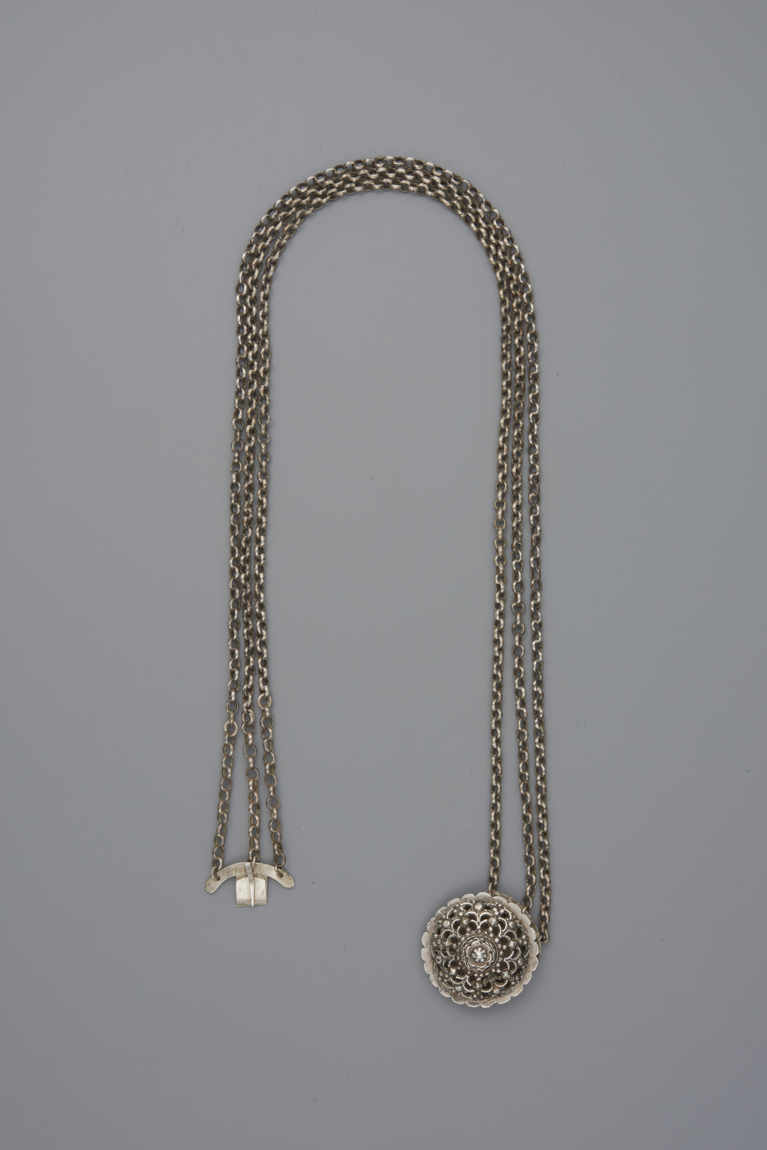 Halsketting met drie kettingen aan een opengewerkt knipslot. De ketting is gedragen door een vrouw uit de provincie Friesland in de lichte rouw. Het slot is vervaardigd door H.J. Janssen in Leeuwarden, werkzaam tussen 1835-1883.