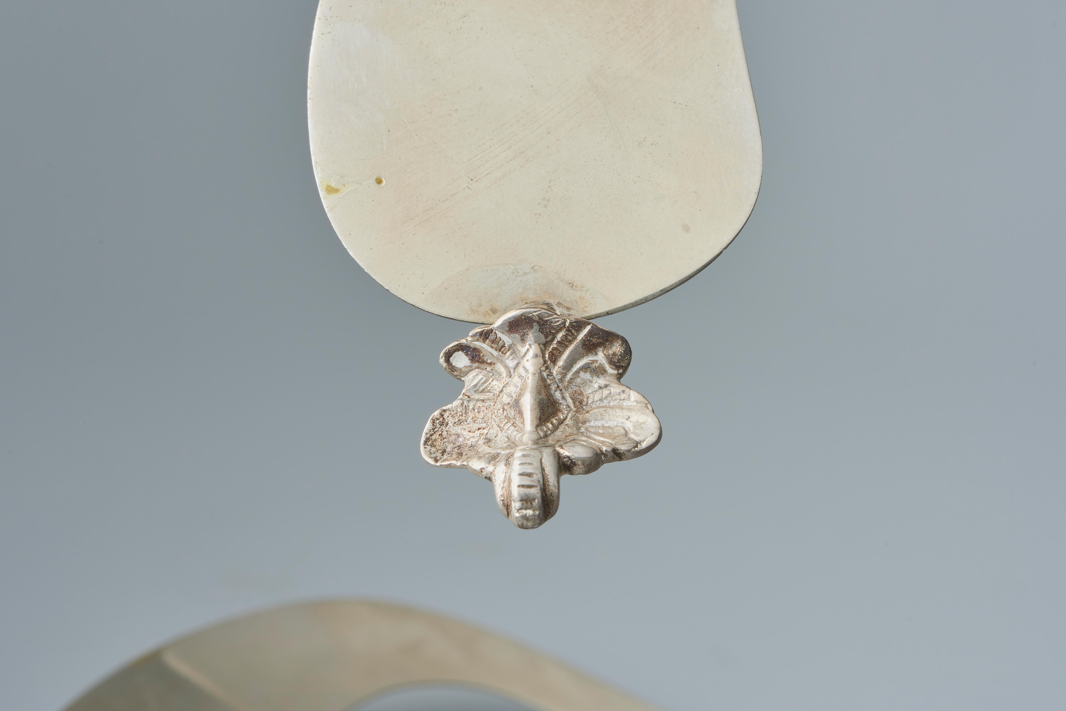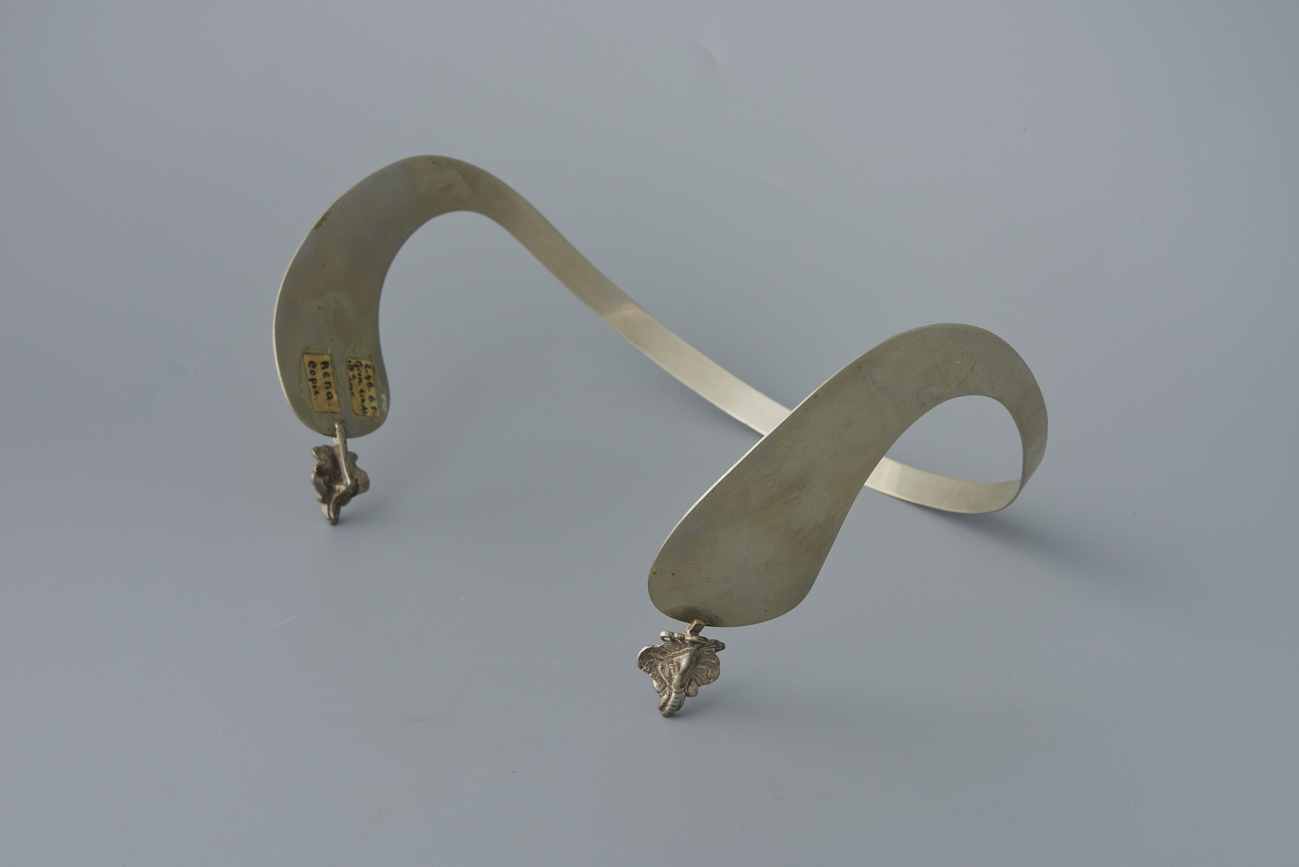 Kopie van een oorijzer uit de provincie Groningen. Deze kopie is vervaardigd in of omstreeks 1965. De beugel is van onedel metaal en de twee gegoten knoppen zijn van zilver. Het originele oorijzer dat als voorbeeld diende, komt uit het eind van de achttiende of begin van de negentiende eeuw en was in particulier bezit.