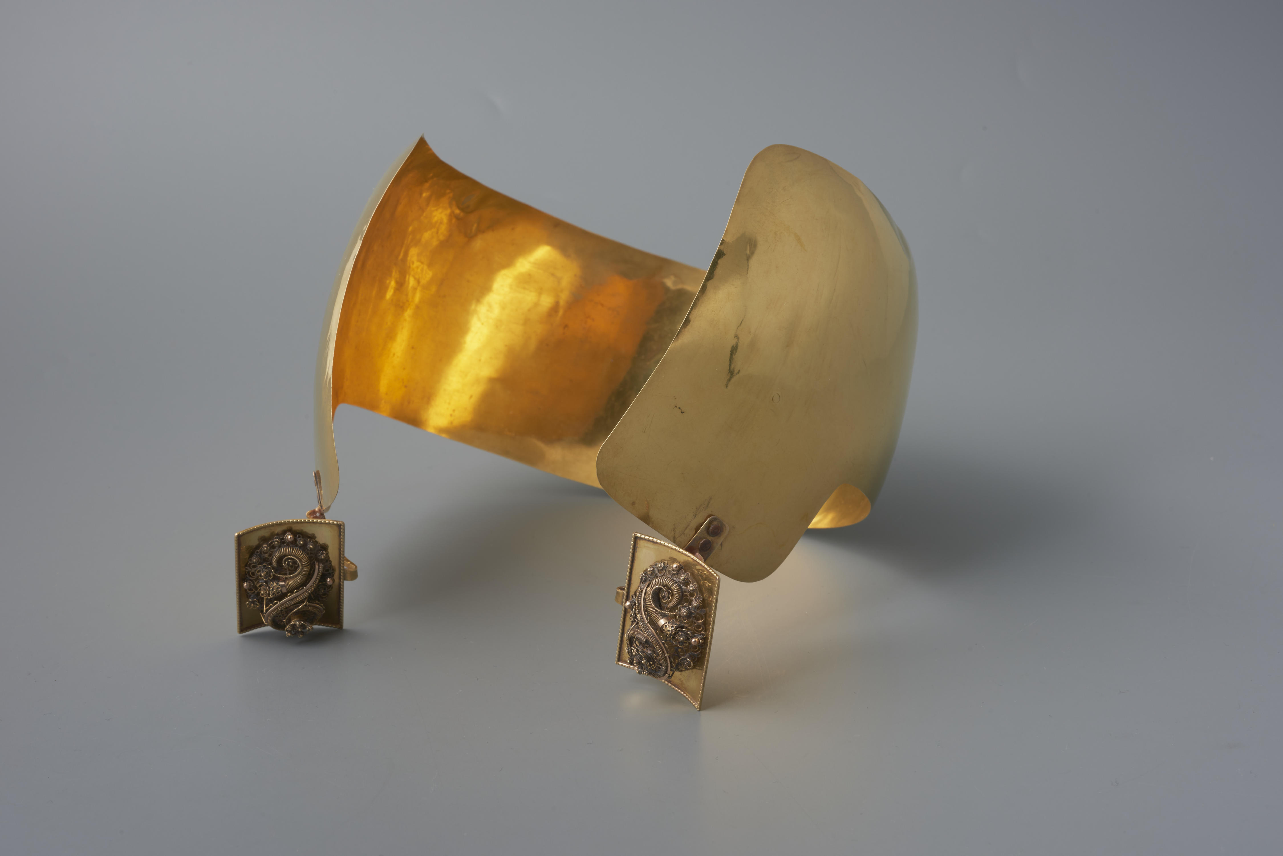 Oorijzer van 18-karaats goud met boeken van 14-karaats goud. De boeken zijn versierd met de hoorn des overvloeds. De beugel van het oorijzer is voorzien van de jaarletter W (1906). Op de verbinding van de oorijzer en de boeken staat de jaarletter B (1911). De beugel van het oorijzer is waarschijnlijk vervaardigd door P.J. Maartense ...