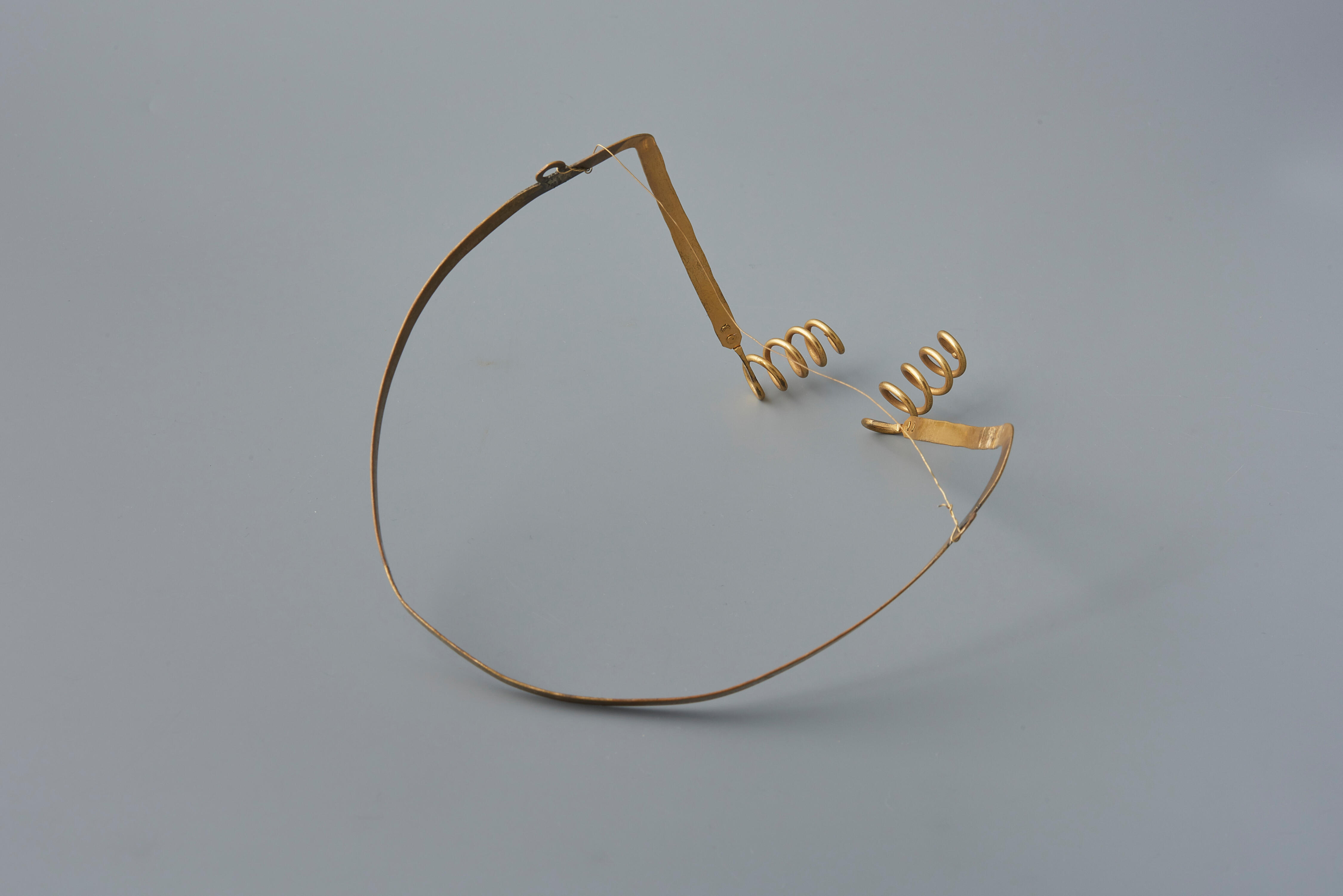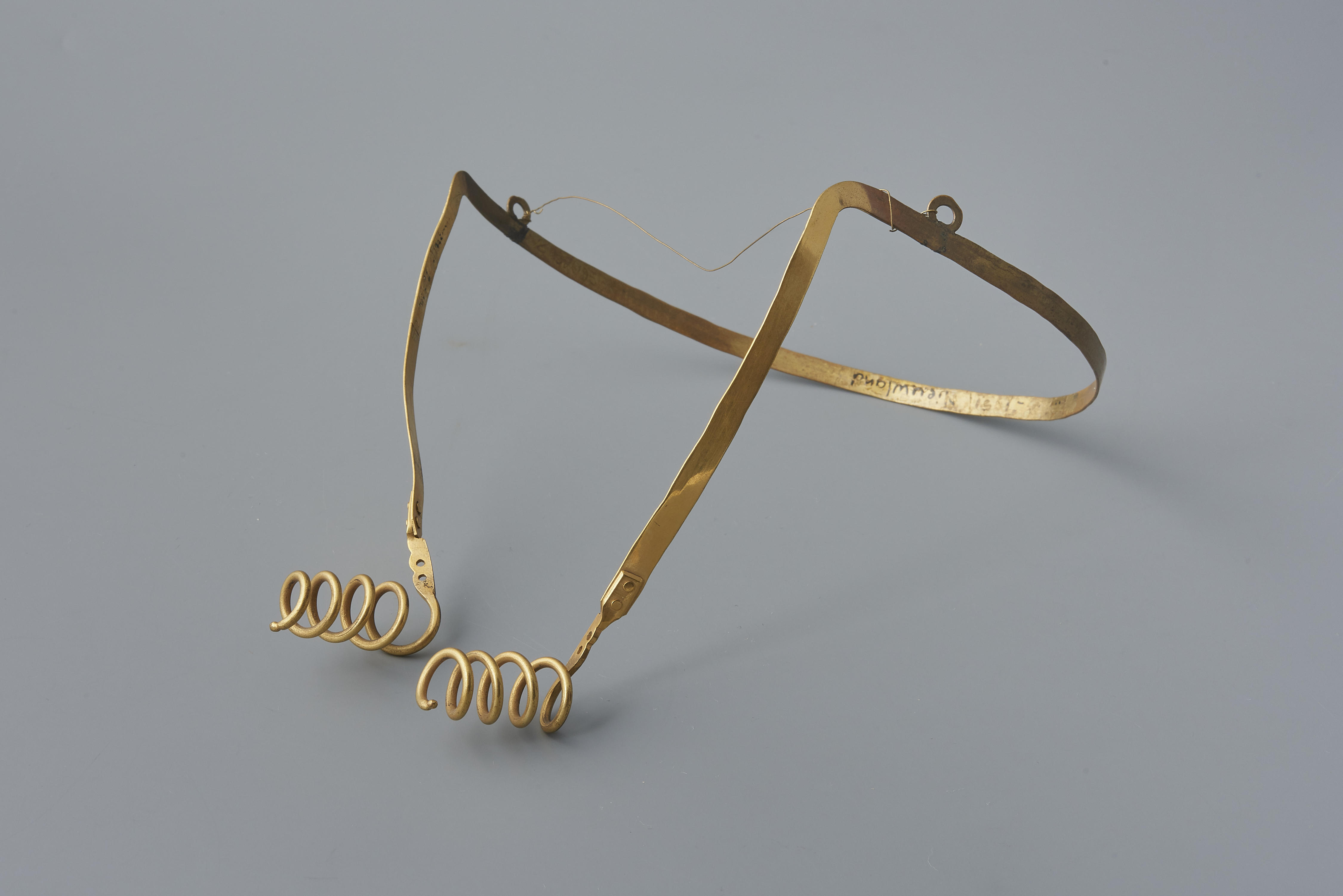 Een messing oorijzer met messing krullen van vier windingen. Het oorijzer is in 1955 in opdracht van het Nederlands Openluchtmuseum verguld. Het oorspronkelijke oorijzer werd gedragen door een vrouw in streekdracht uit Nieuw- en Sint Joosland.