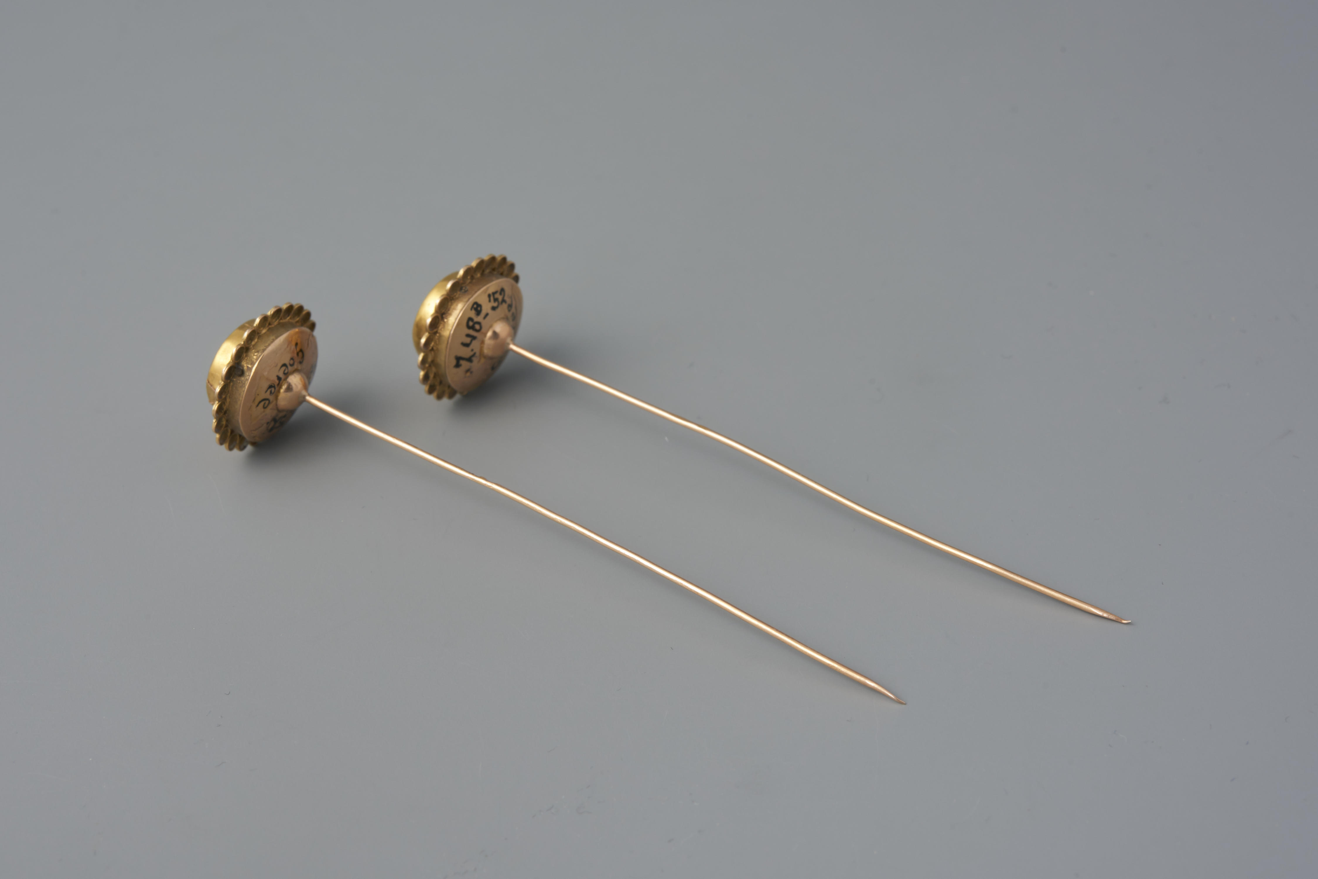 Paar mutsspelden, gedragen op Goeree Overflakkee. In de koppen van de spelden zit een haarwerkje met de initialen ‘G.v.d.W.’ en ‘M.R.’. De spelden werden horizontaal achterwaarts in de sluiermuts gestoken, tussen de krullen van het oorijzer. Ze zijn omstreeks 1910-1915 vervaardigd door H. van Aken, een edelsmid uit de omgeving van Rotterdam.