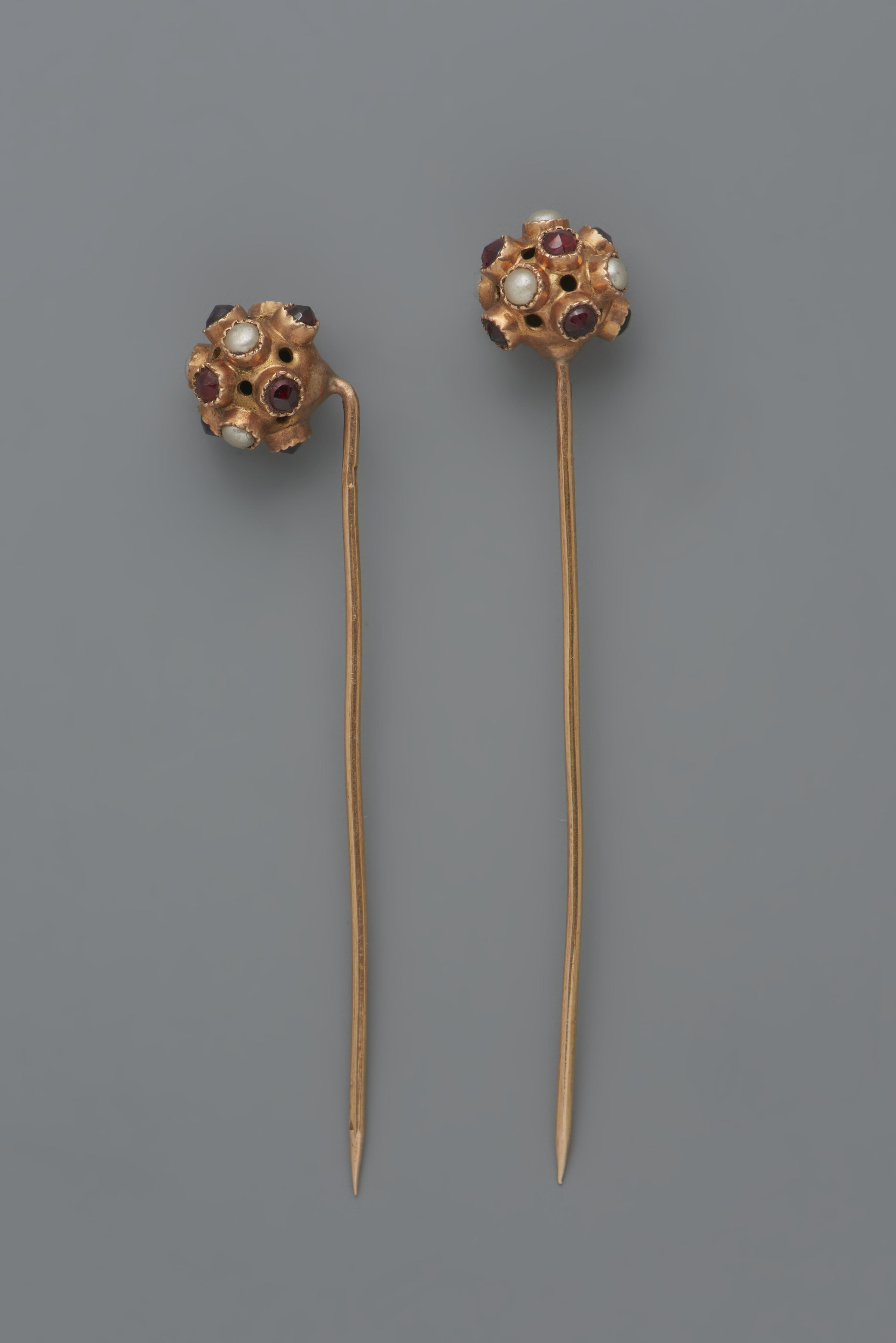 Paar gouden zijspelden, gedragen door een vrouw op Goeree-Overflakkee. De spelden zijn gemaakt omstreeks 1880-1890. Ze werden opzij in de keuvel (sluiermuts) gestoken.