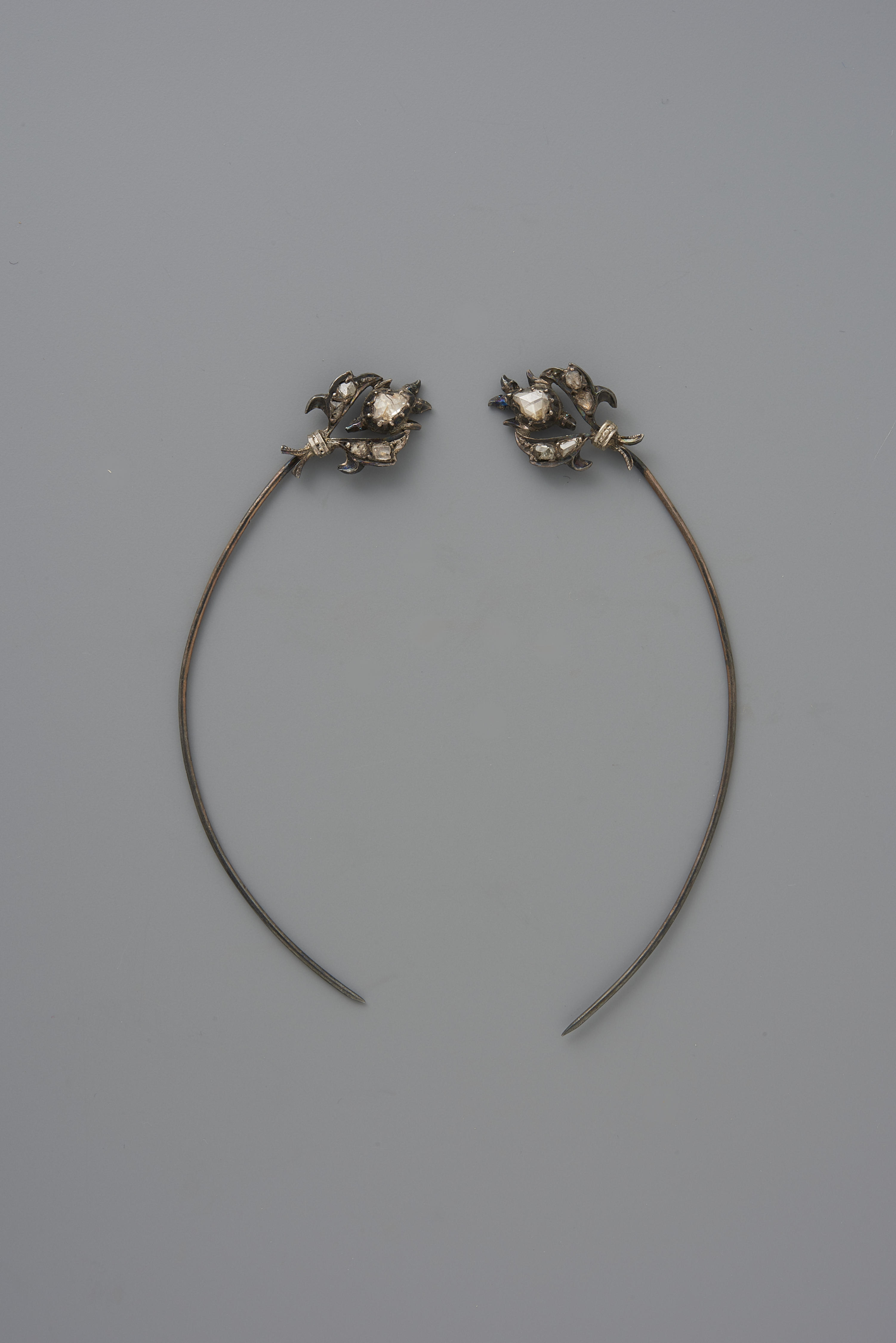 Een paar zijspelden van eerste of tweede gehalte zilver met diamantjes. De diamantjes hebben een roosslijpsel. Het meesterteken is onduidelijk, maar is waarschijnlijk van J. Rozendaal, werkzaam in Hoorn van 1874-1926. De spelden hebben een gehaltemerk dat gebruikt is tussen 1814 en 1906.