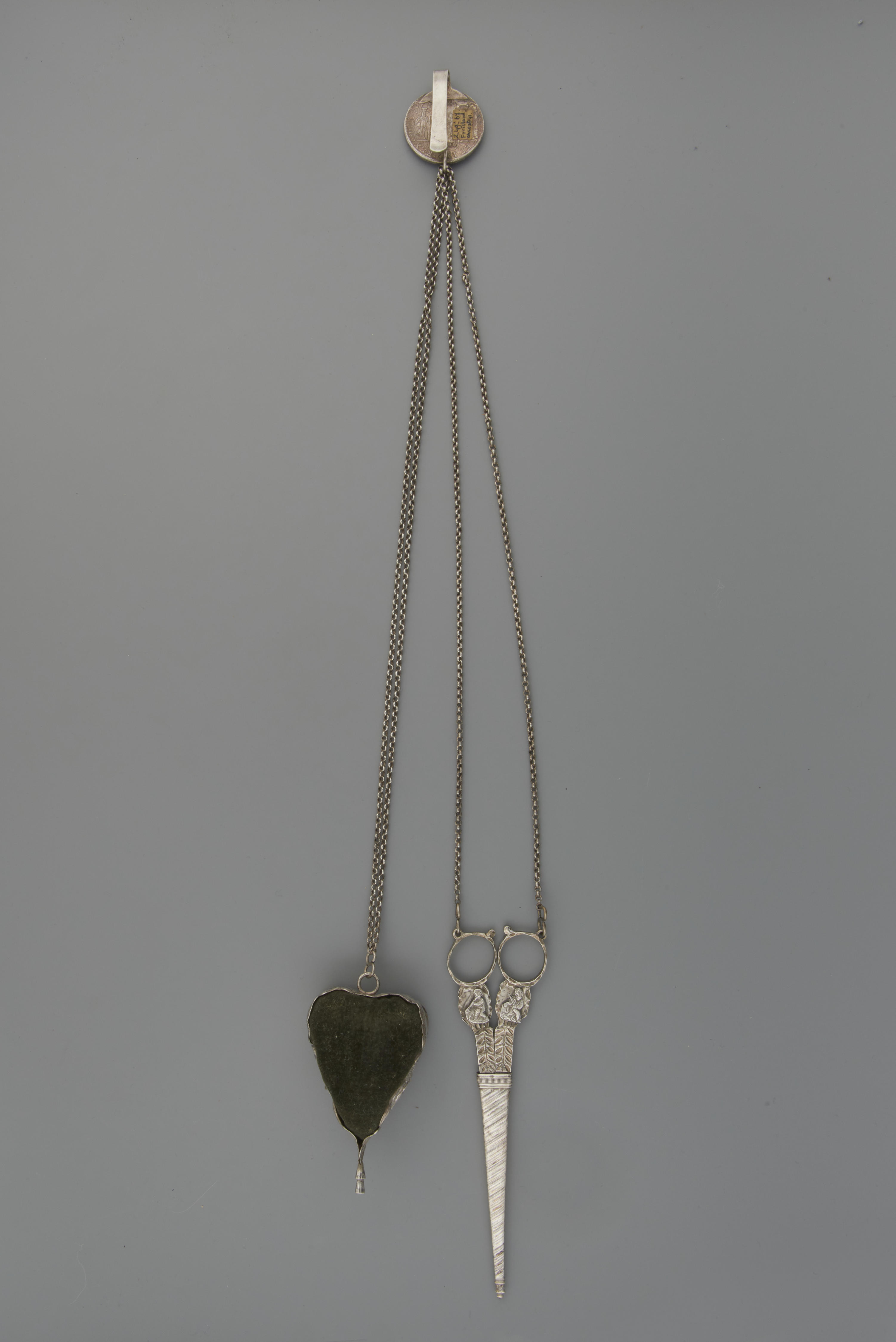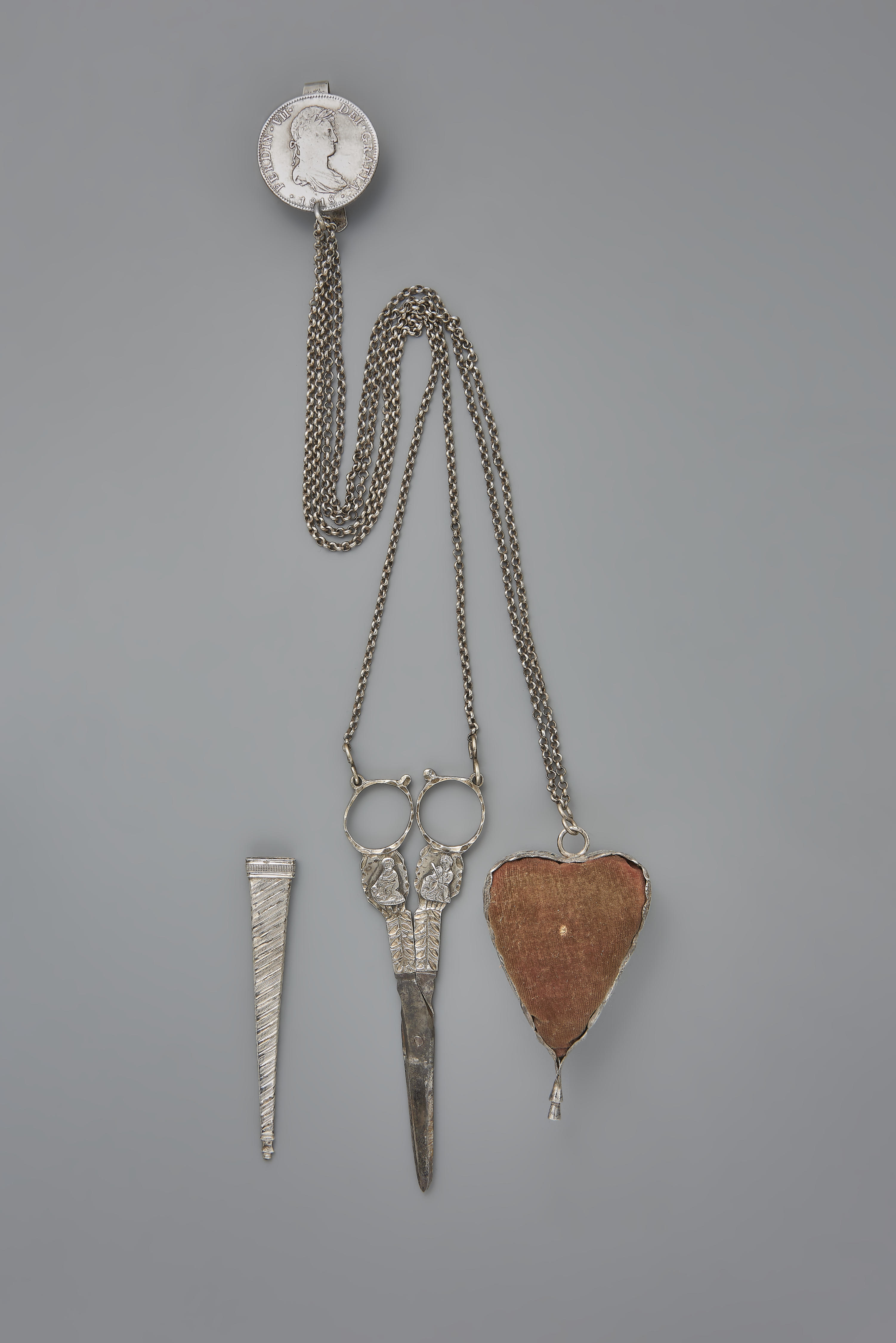 Naaigarnituur of chatelaine van zilver. De haak is gemaakt van een Spaanse munt uit 1818 met daarop een afbeelding van koning Ferdinand VII. Op het speldenkussen staan de jaarletter van 1841 en het meesterteken van H. Ament uit Joure, werkzaam tussen 1833-1873. Het meesterteken op de schaar is onduidelijk. Op de schede van de schaar ...