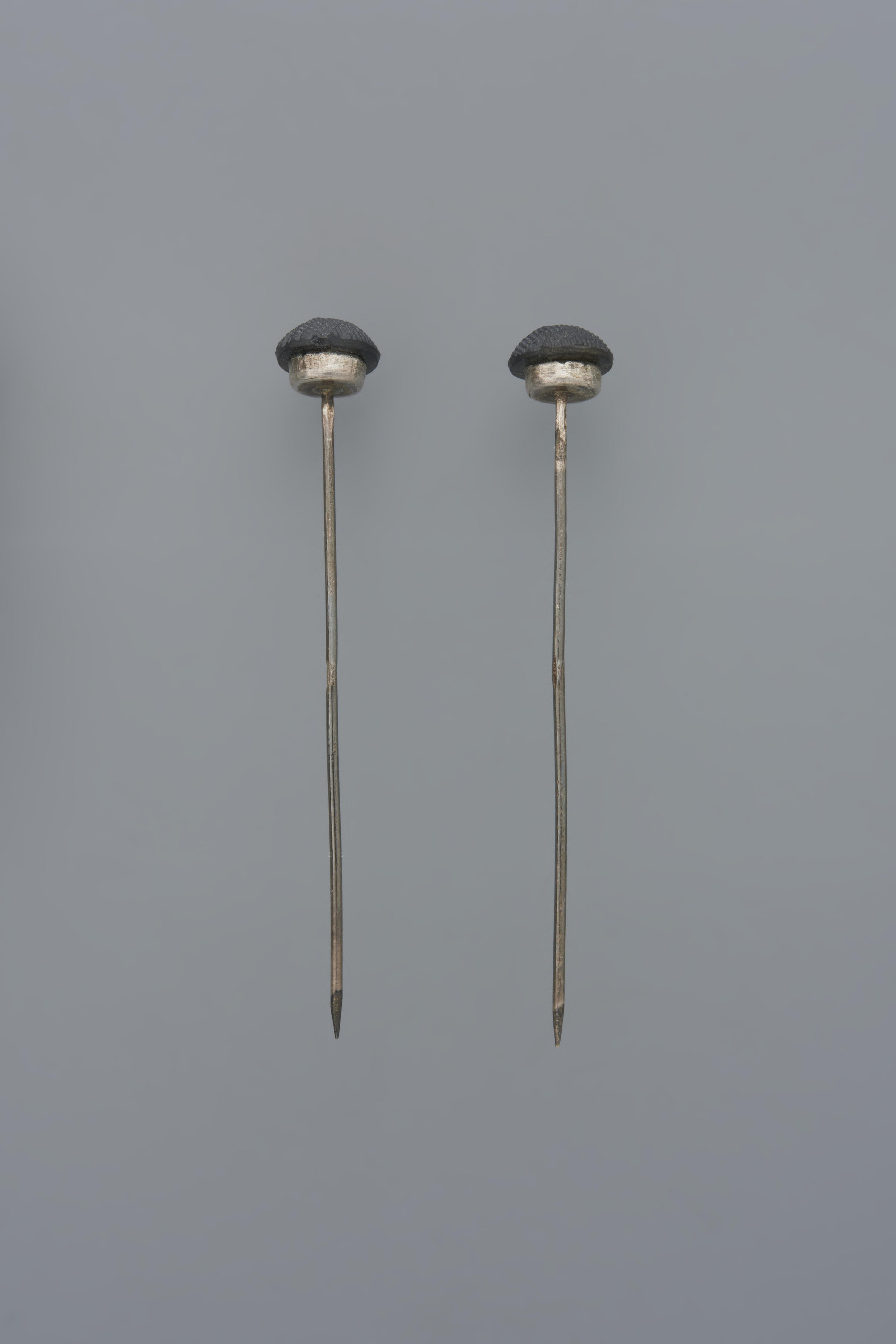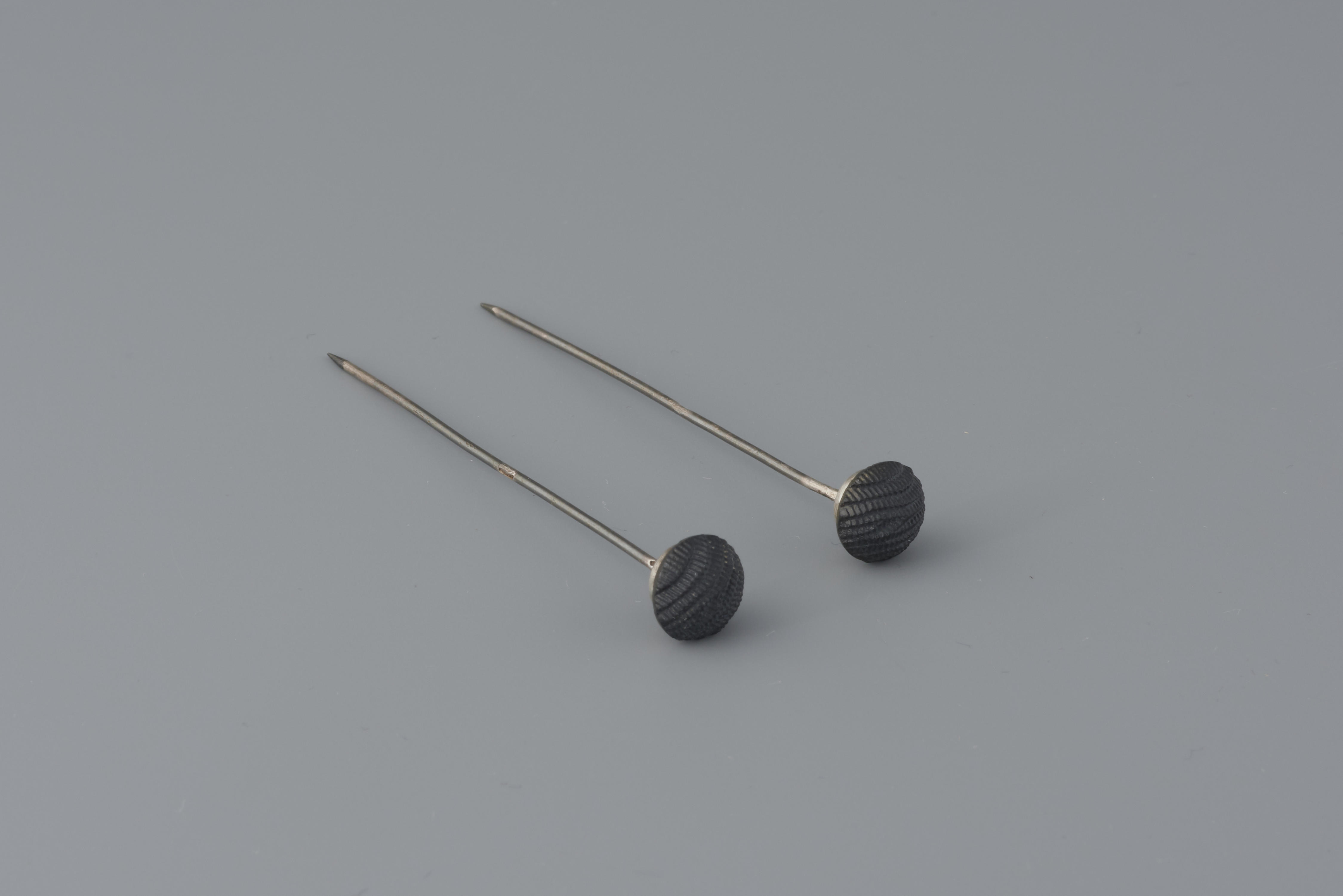 Paar zilveren mutsspelden met een kop van geslepen glas. Deze mutsspelden zijn gedragen door een vrouw op Goeree bij de rouwdracht. Ze werden horizontaal achterwaarts in de keuvel ofwel sluiermuts gestoken, tussen de krullen van het oorijzer. Ze zijn omstreeks 1935 vervaardigd door G.J. van den Bergh Sr. in Schoonhoven.