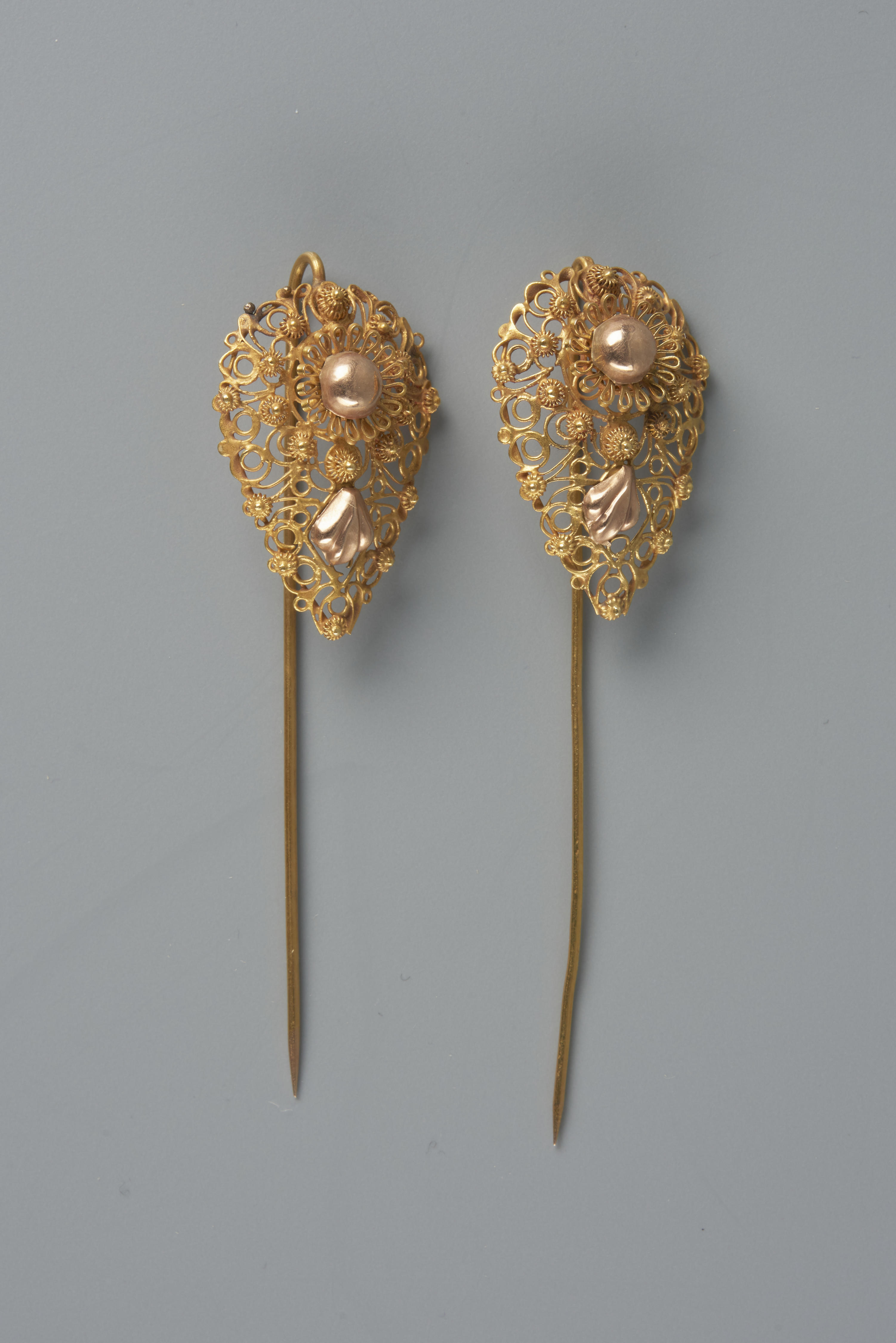 Paar gouden 'zijspelden', gedragen door een vrouw op Noord-Beveland. De spelden zijn gemaakt omstreeks 1875-1890. Ze werden opzij in de sluiermuts gedragen. De vervaardiger is onbekend.