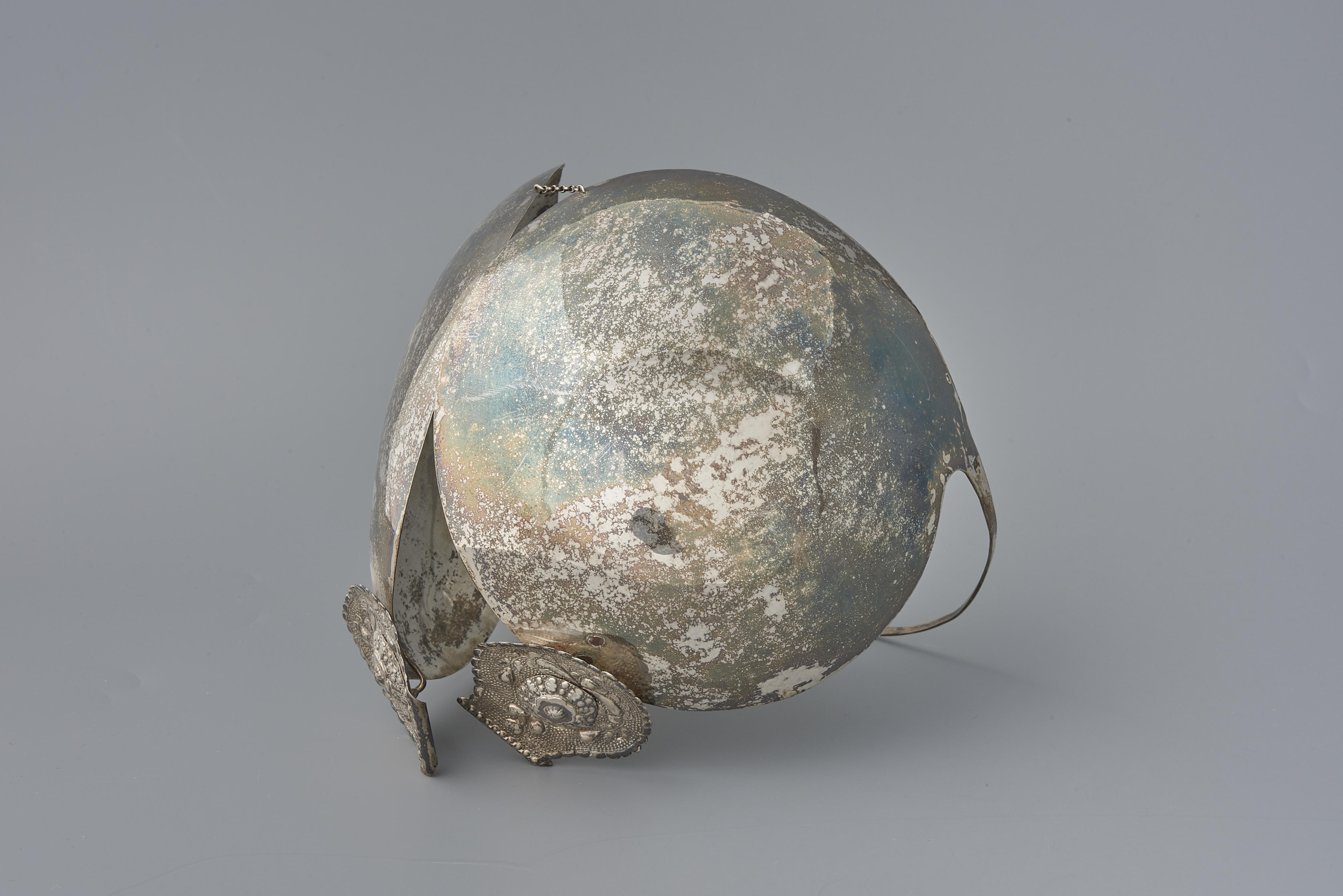 Zilveren oorijzer met aan de uiteinden twee zilveren stiften. Het oorijzer is gedragen door een vrouw in Friese streekdracht. Op de beugel staan de jaarletter van 1837 en het meesterteken van K. de Vries uit Leeuwarden, werkzaam van 1826 tot 1839. Gaatjes in de beugel wijzen erop dat er ooit andere stiften aan dit oorijzer ...