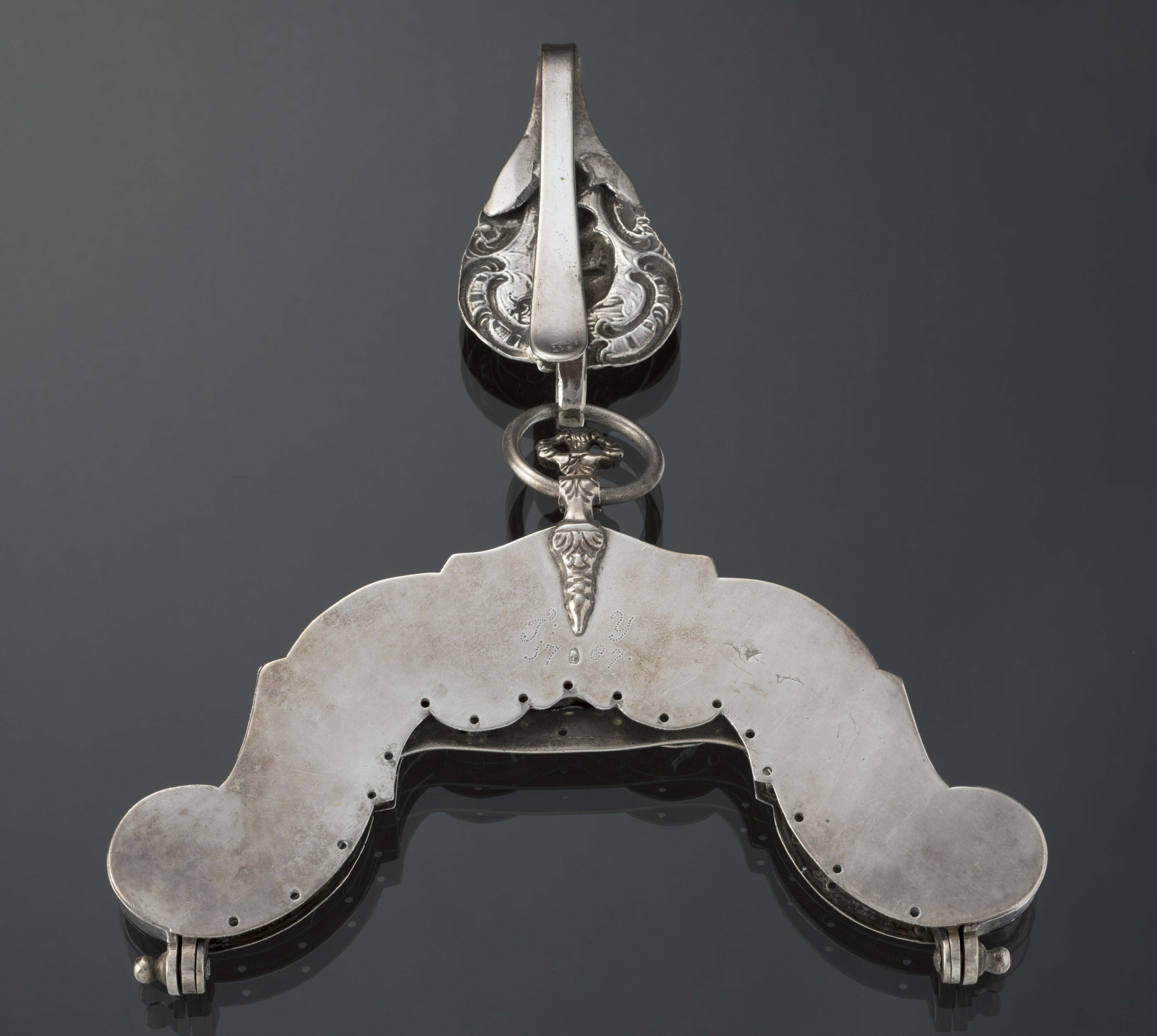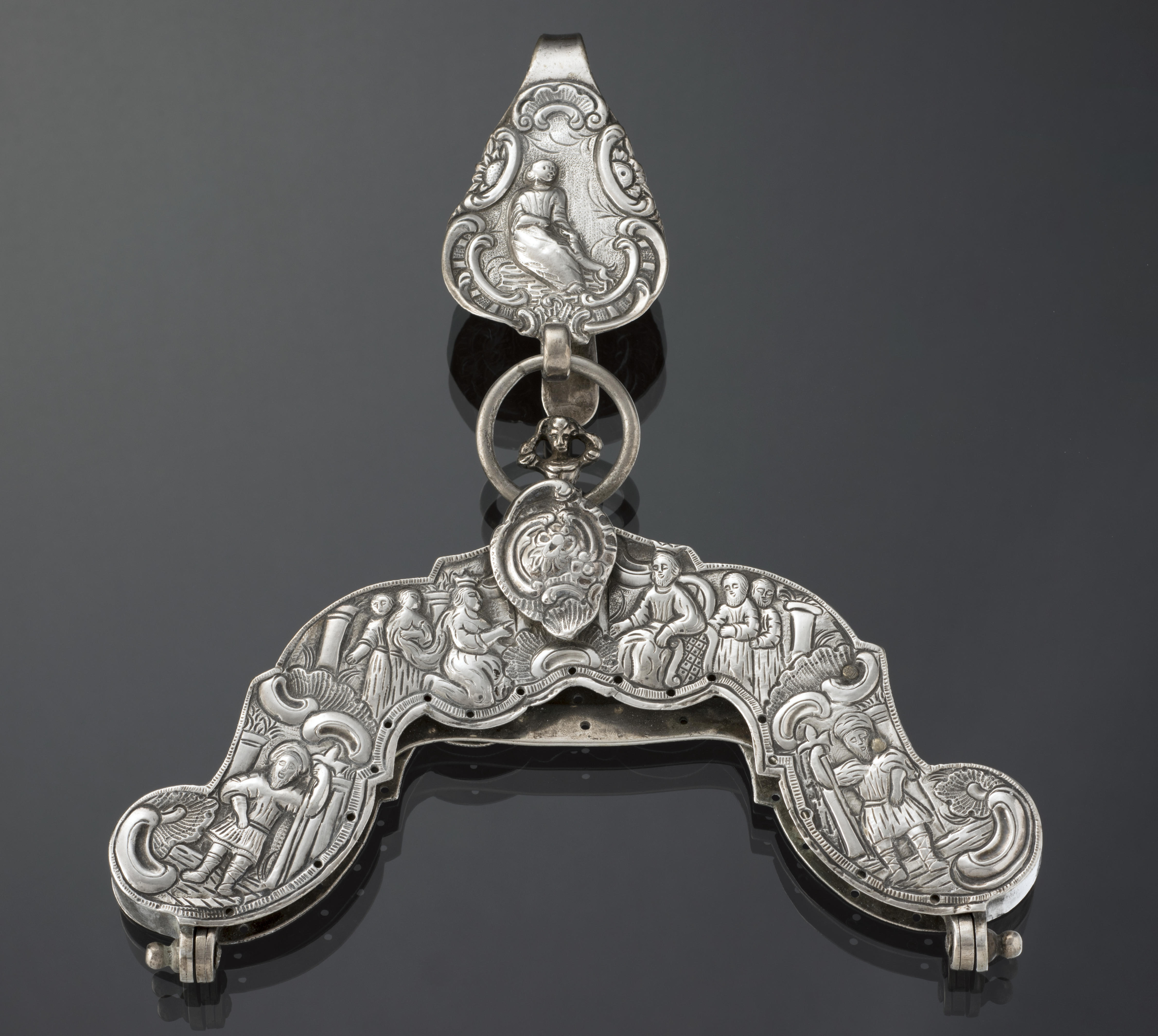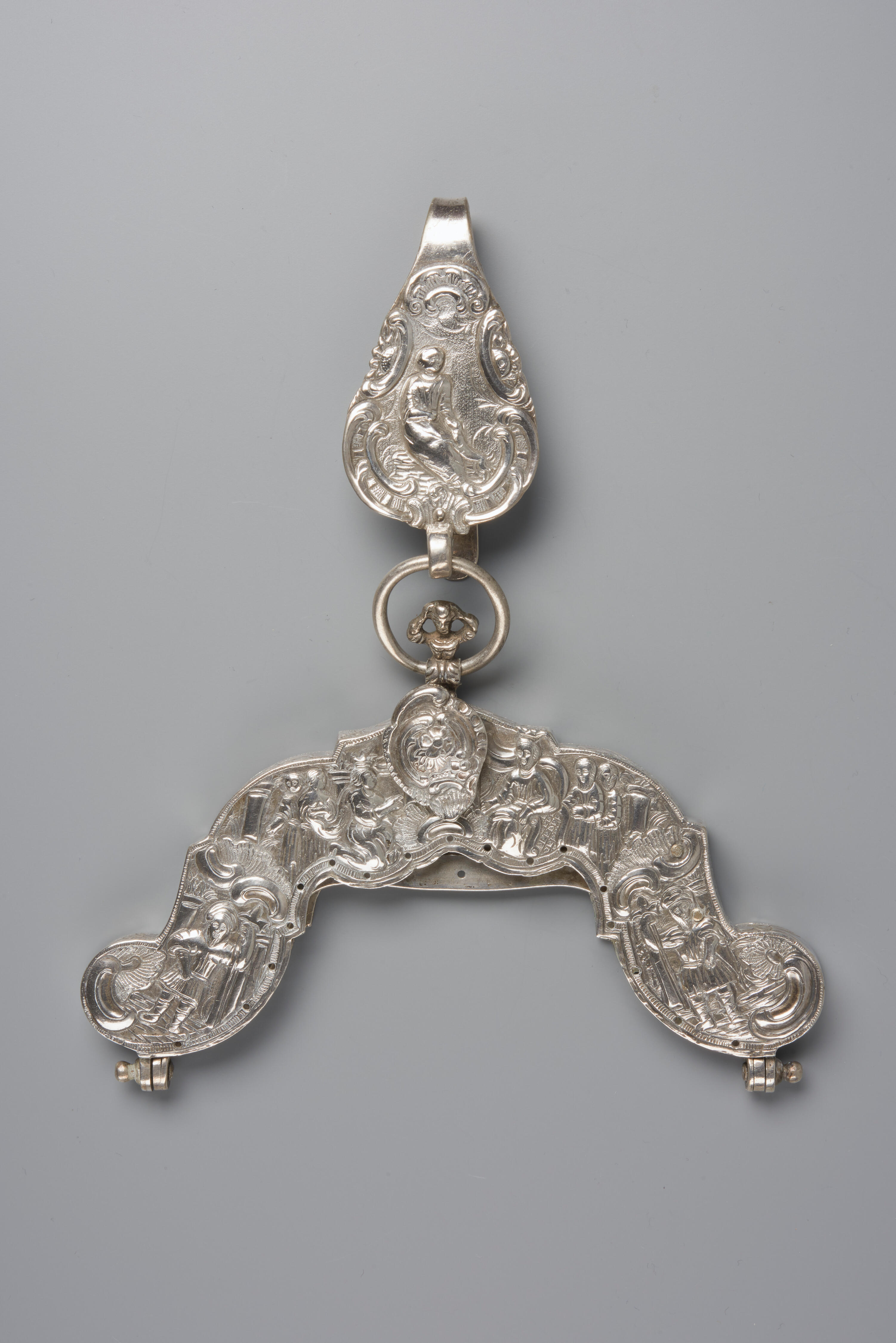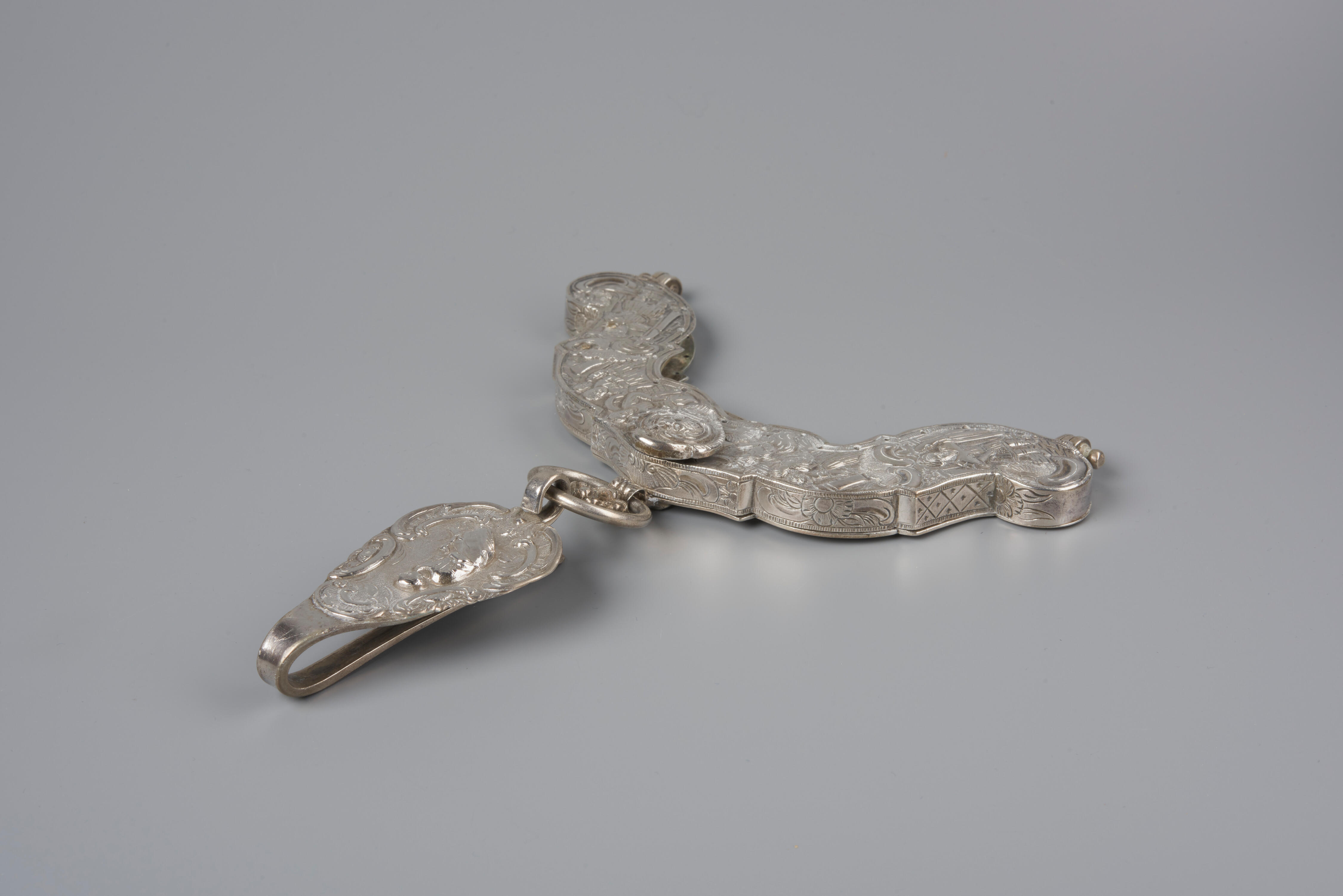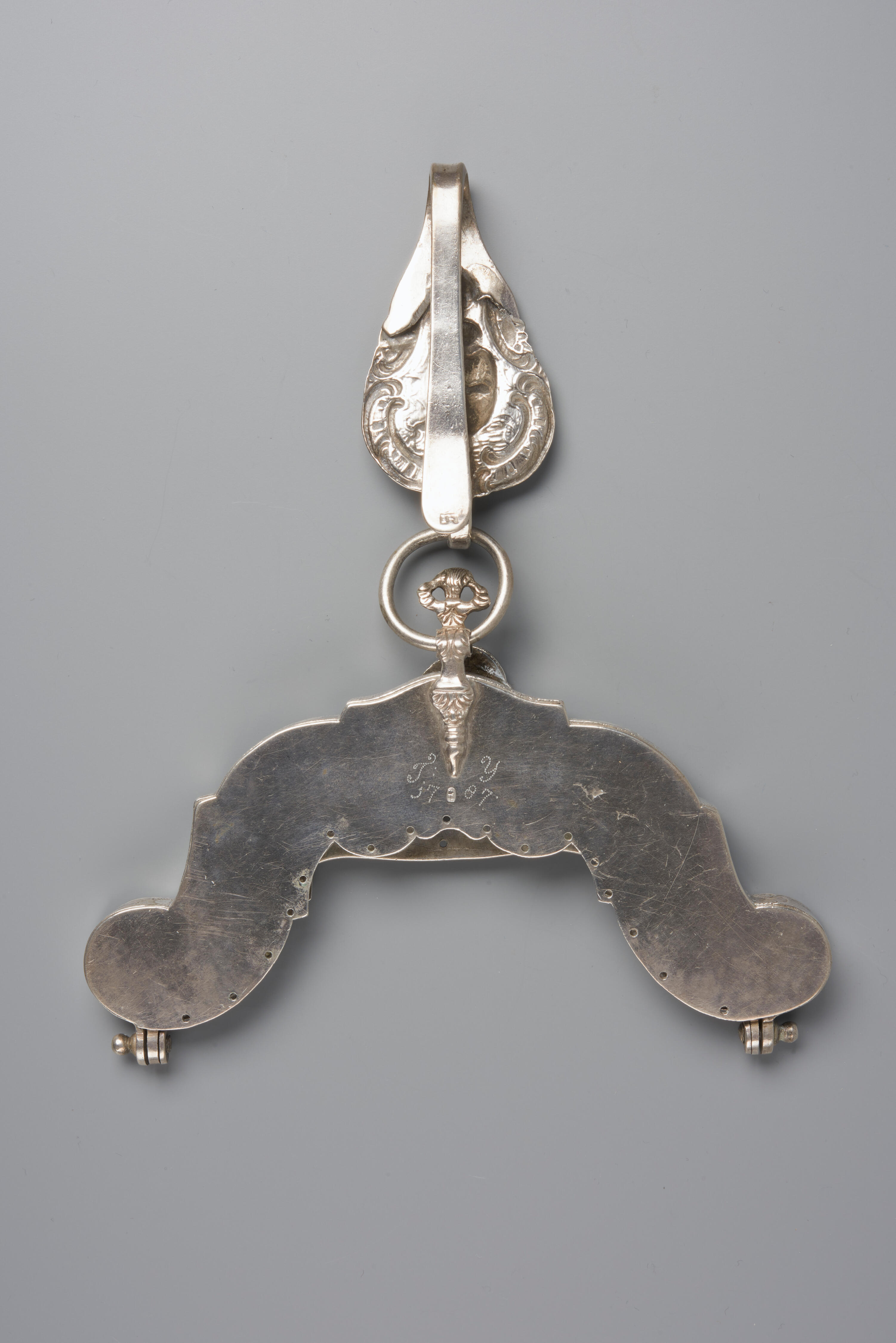 Een zilveren tasbeugel met een zilveren rokhaak, toegeschreven aan Friesland. De voorzijde van de beugel en de voorzijde van de rokhaak zijn geciseleerd. Op de achterzijde van de beugel staan de initialen T.Y. en het jaartal 1787. Op de haak staat het meesterteken van Johannes Feddema, werkzaam van 1778 tot 1812 in Leeuwarden. Op de ...