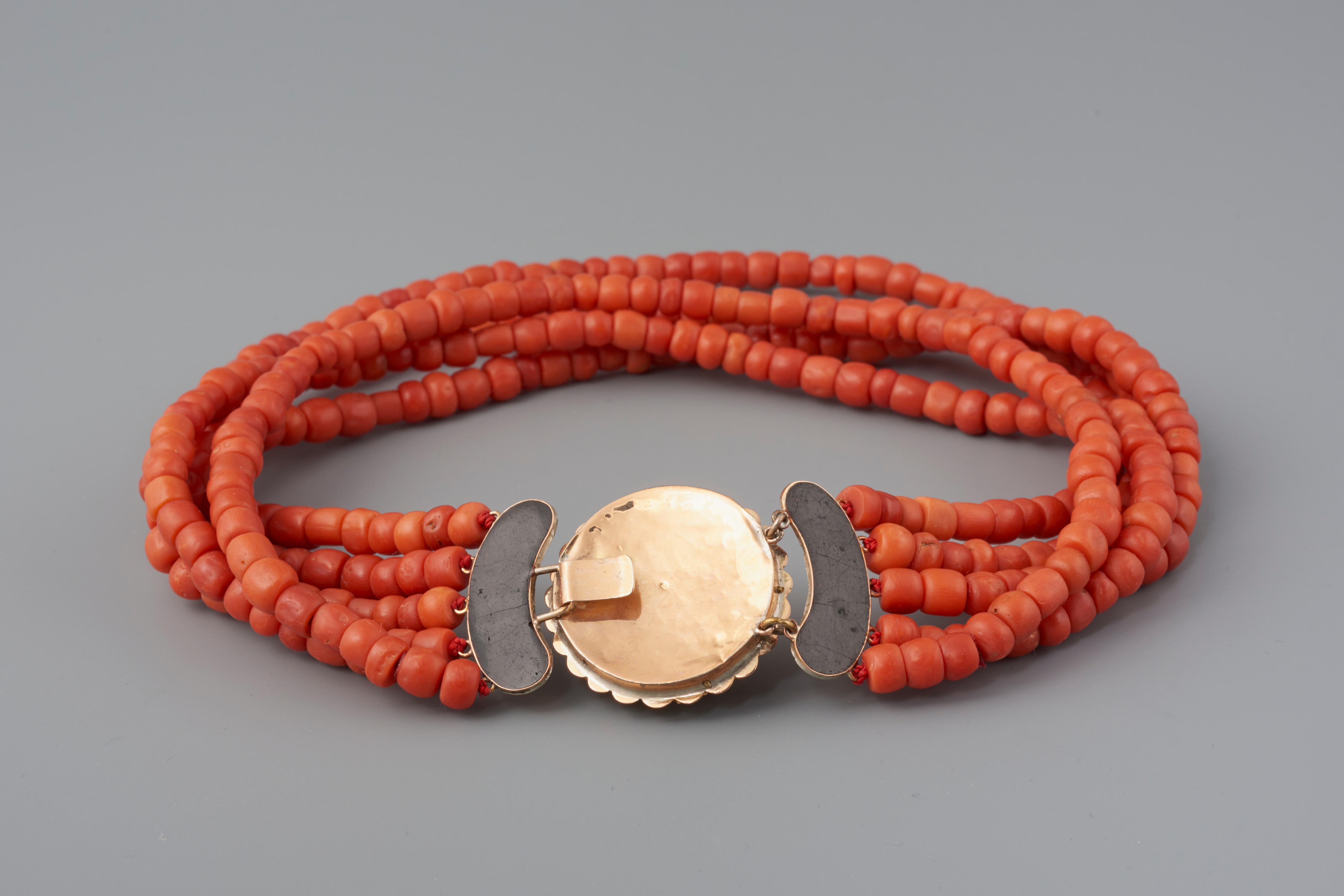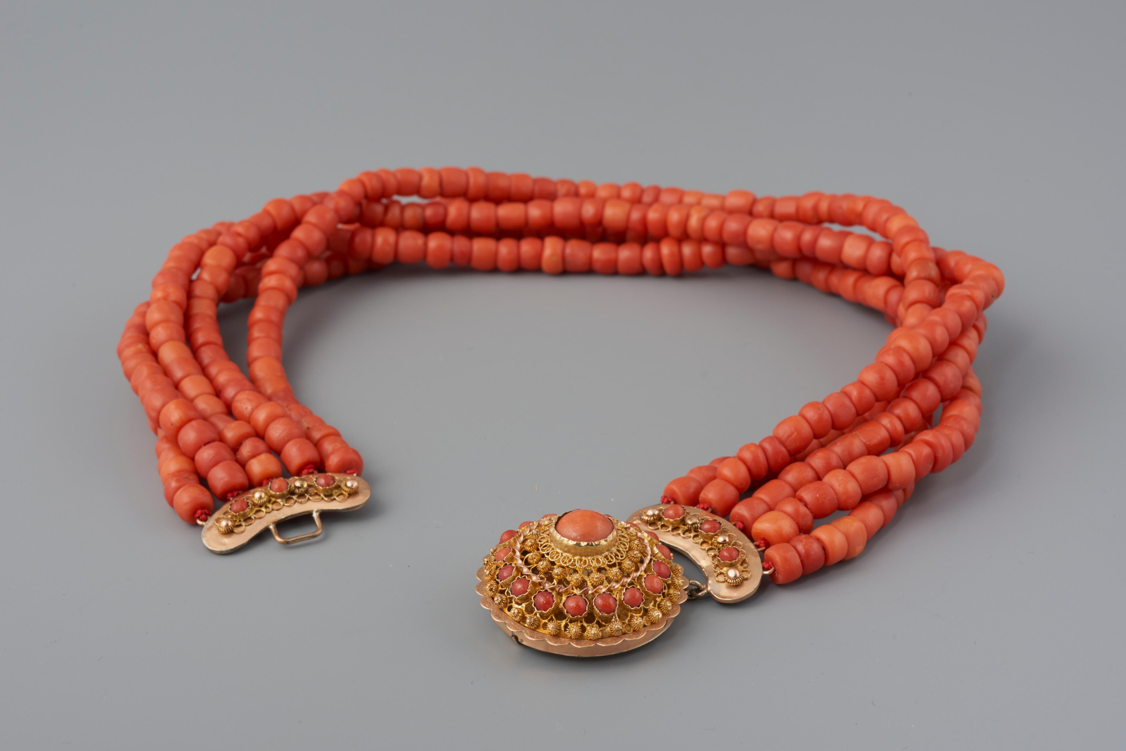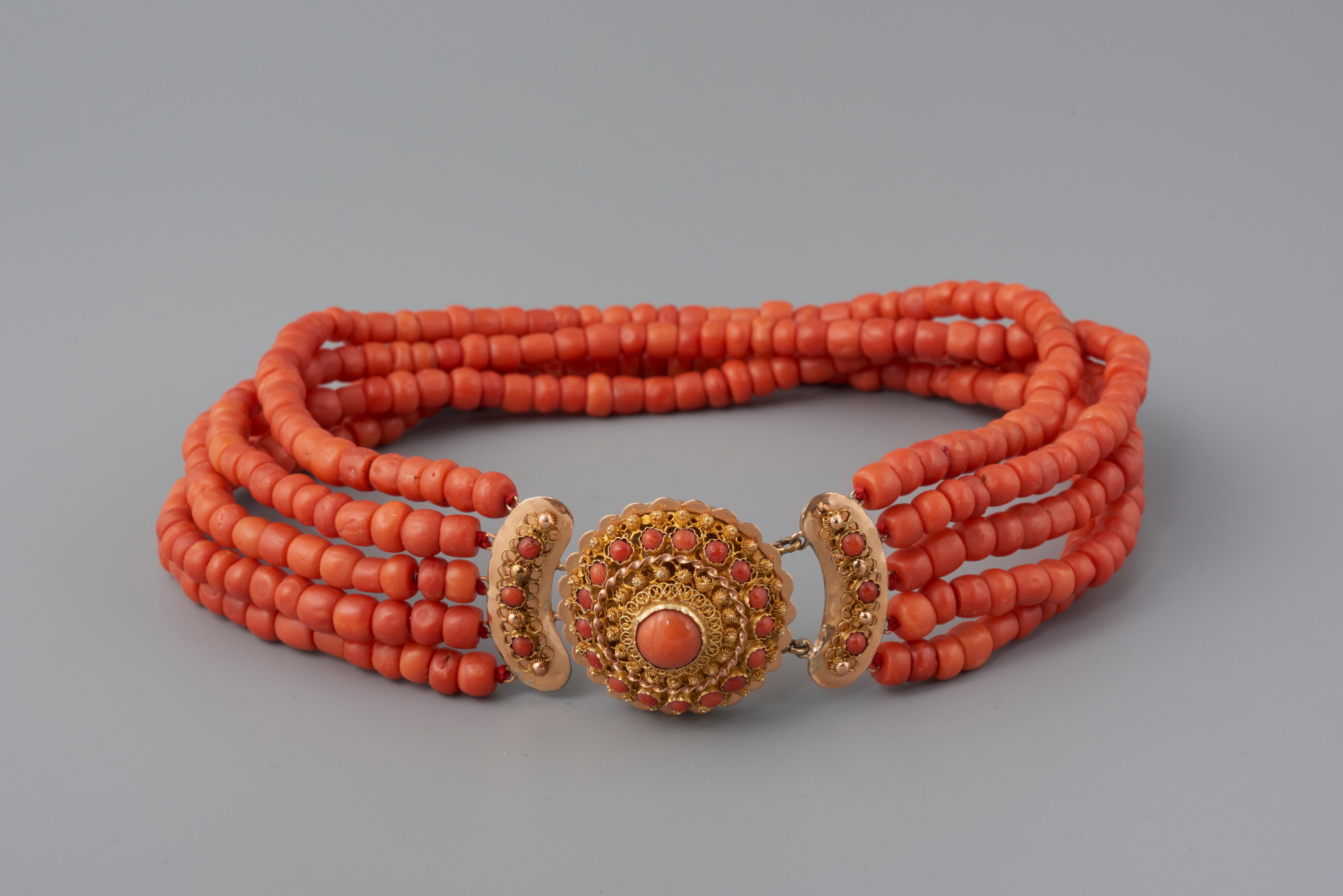 Een halssnoer, bestaande uit vijf strengen kralen van bloedkoraal aan een driedelig 14-karaats gouden slot, gedragen door een vrouw in streekdracht van het eiland Walcheren.