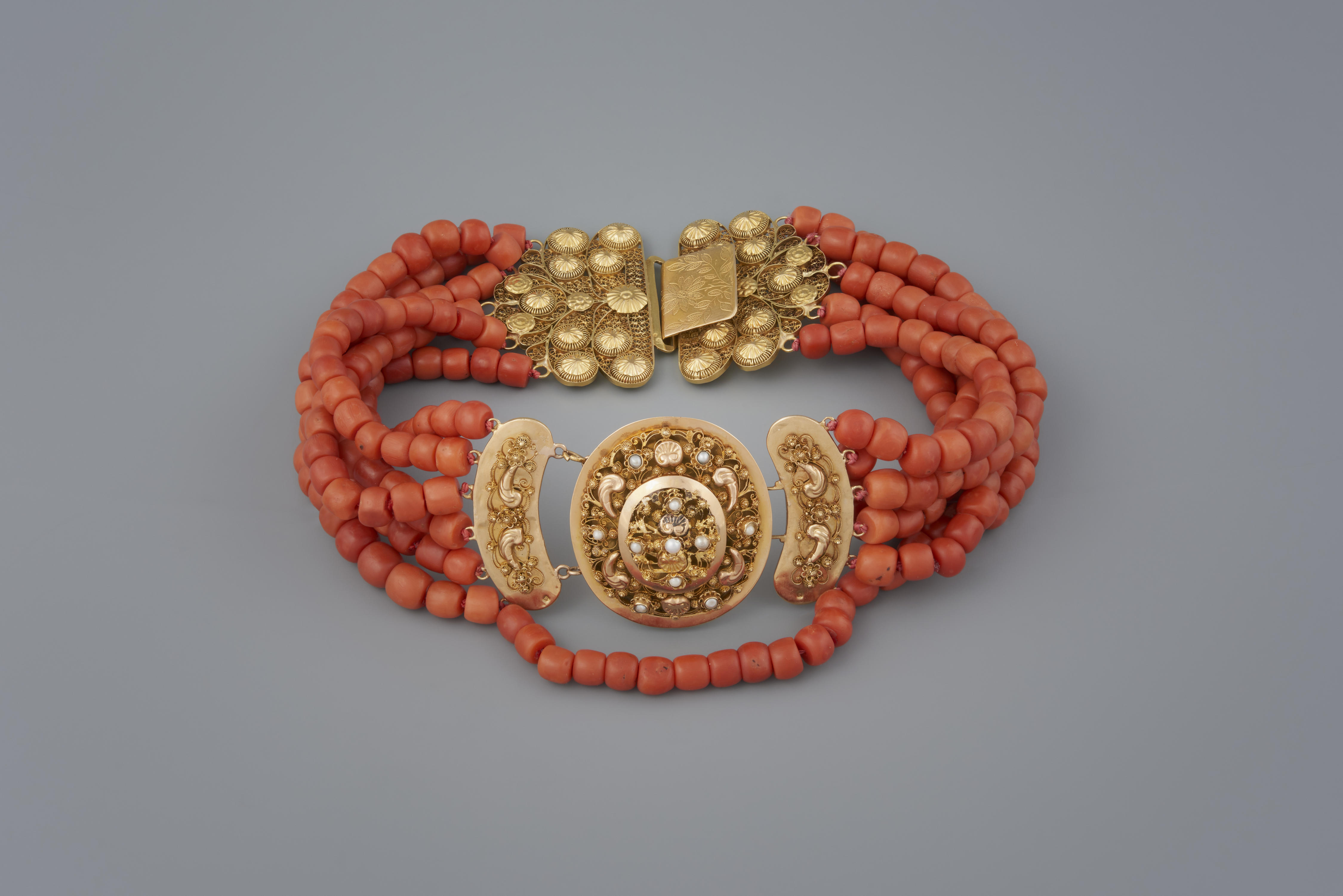 Halssnoer, bestaande uit zes strengen kralen van bloedkoraal en een gouden voor- en achterslot. Het voorslot is niet bedoeld als sluiting, maar is alleen voor de sier. Het meesterteken op het voorslot is onleesbaar. Het achterslot is tussen 1860-1875 vervaardigd door de gebroeders Jan en Evert Schotman uit Dordrecht. Dit type halssnoer is kenmerkend voor ...