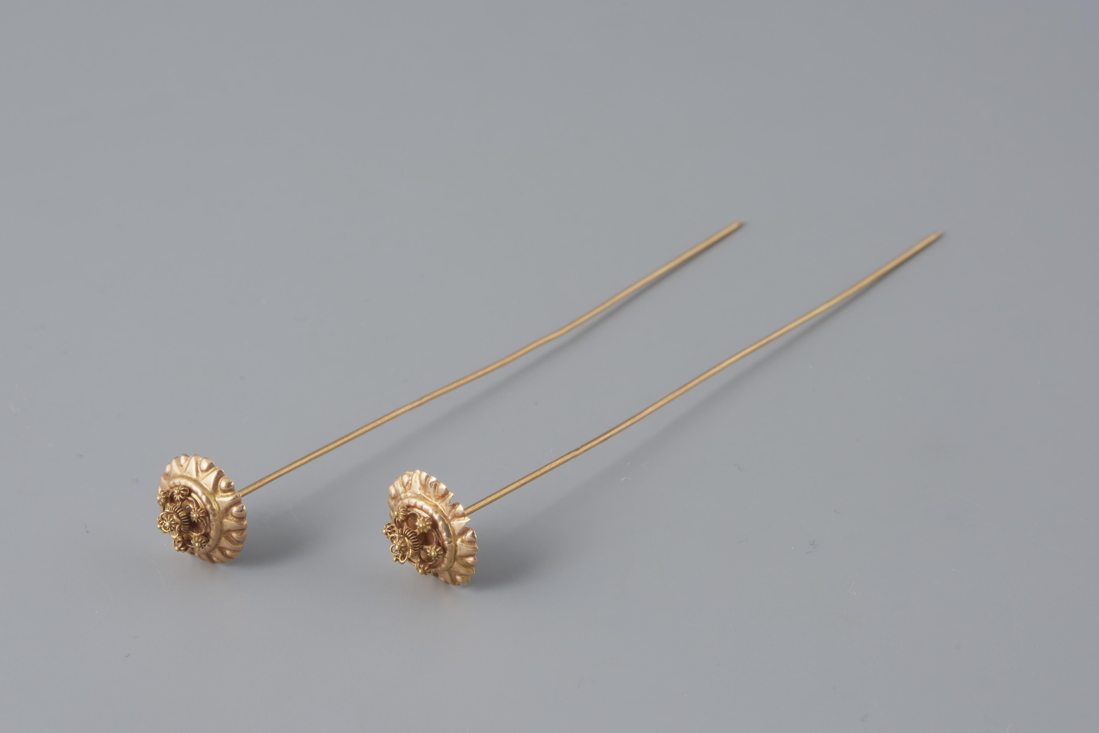 Paar gouden mutsspelden, gedragen in Friesland. De vervaardiger is onbekend. De mutsspelden werden in de muts gestoken, achter de uiteinden van het oorijzer. Ze hebben een gehaltemerk dat gebruikt is tussen 1853 en 1906.