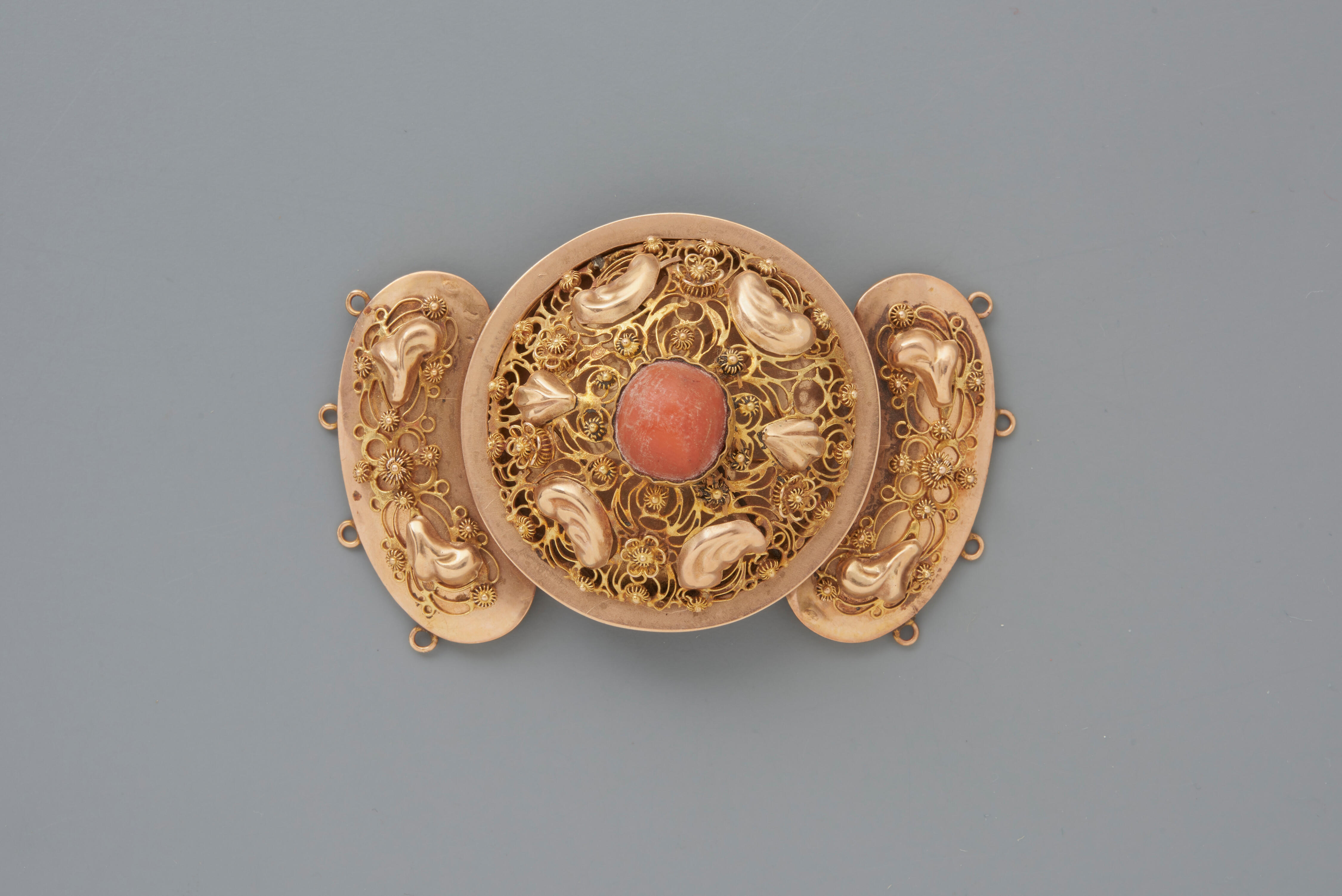 Een driedelig 14-karaats gouden halssnoerslot. In het middenstuk is een bloedkoraal ingezet. Het halssnoerslot is gebruikt door een meisje of vrouw in streekdracht van Walcheren. Het slot is waarschijnlijk vervaardigd door D.H. Greup, werkzaam in Voorburg tussen 1914 en 1924. Aan de oogjes aan weerszijden van de zijstukjes kunnen vier strengen kralen worden gezet.