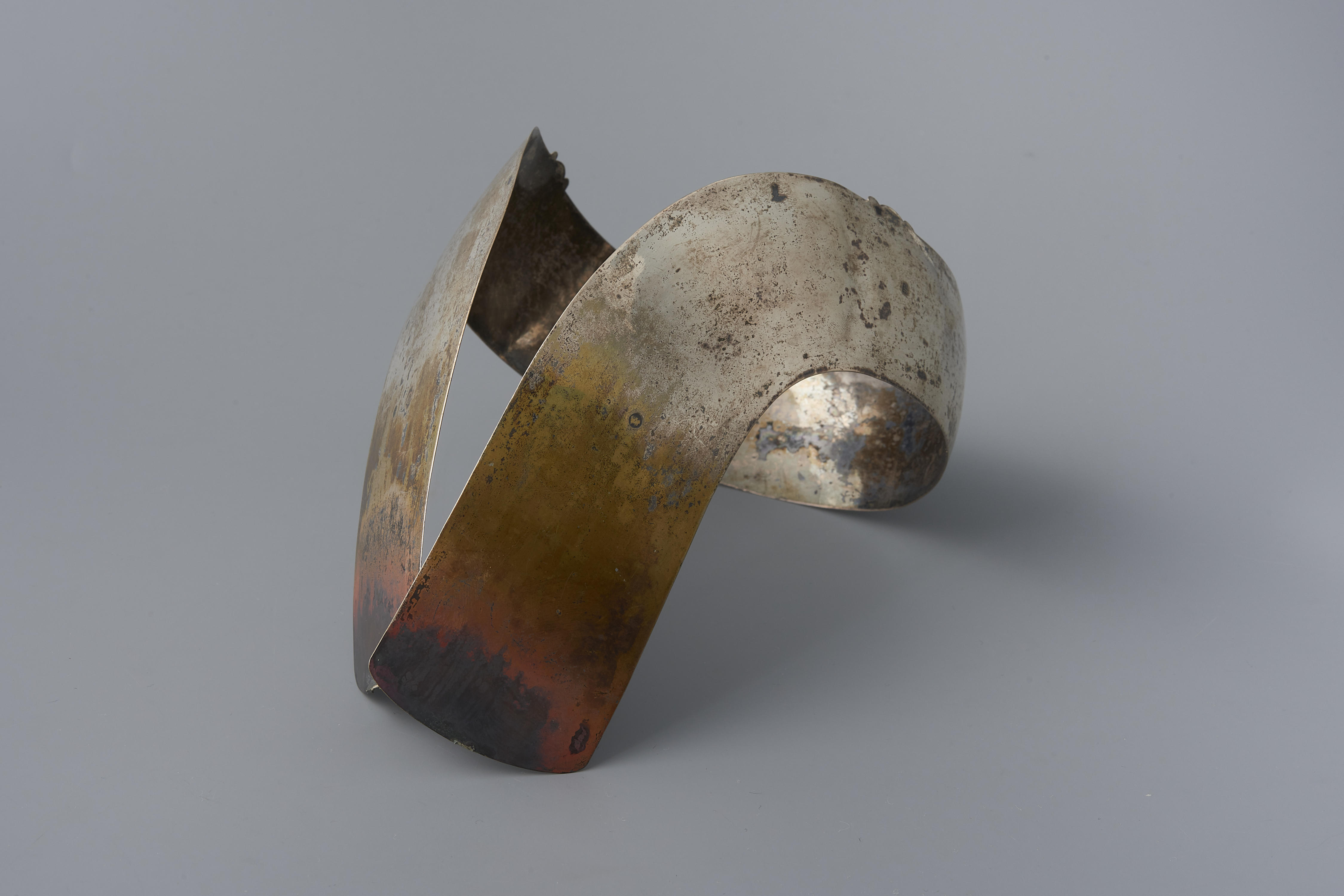 Incompleet oorijzer. Aan de zilveren beugel hebben gouden of vergulde krullen gezeten. Het oorijzer is gedragen door een vrouw in streekdracht van de Noordwest-Veluwe. Op de achterzijde van de beugel staat de inscriptie: '19 H.T.v.d.P. 13'. Dit zijn de initialen van de draagster en het jaar waarin ze het oorijzer kreeg. De beugel heeft een ...