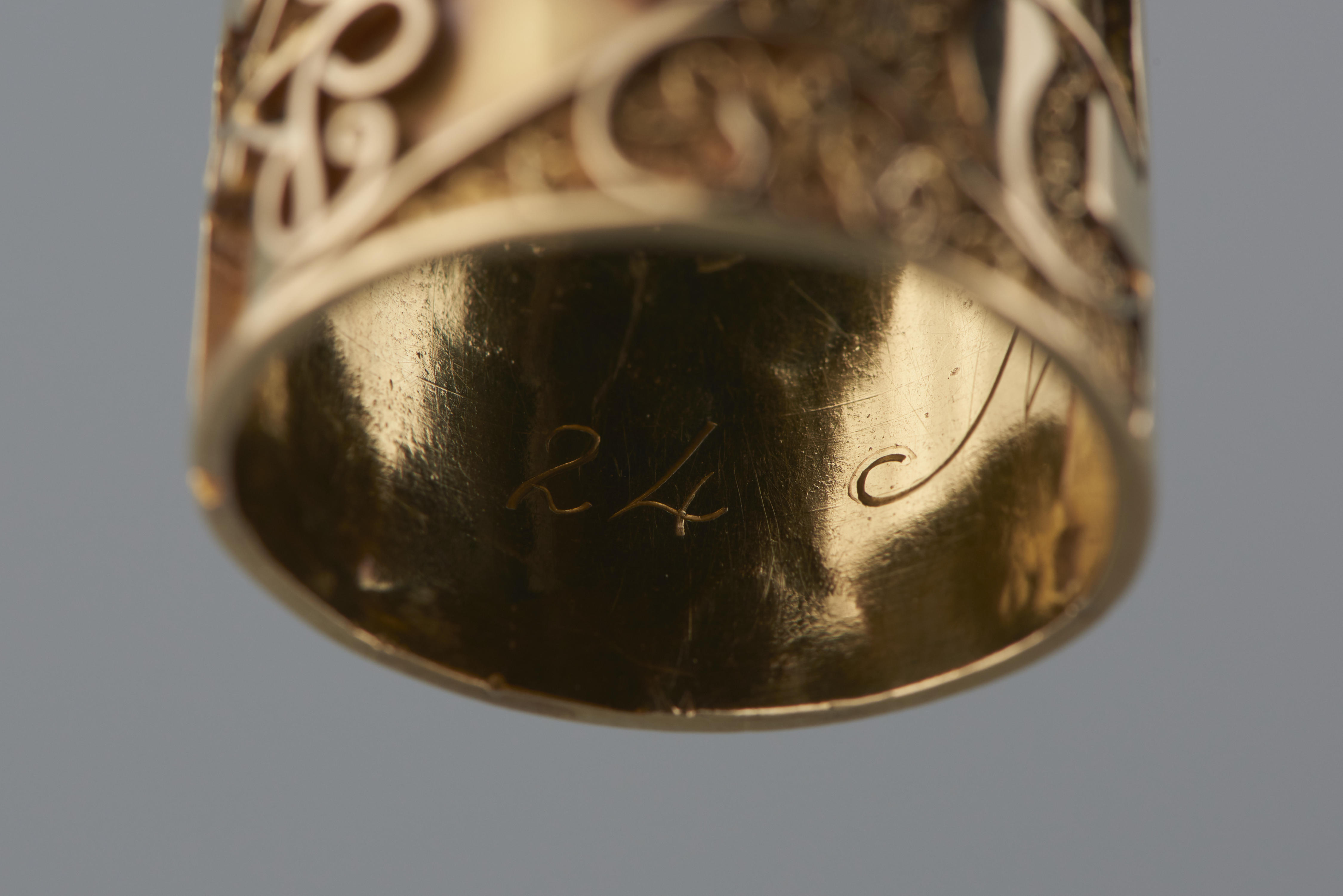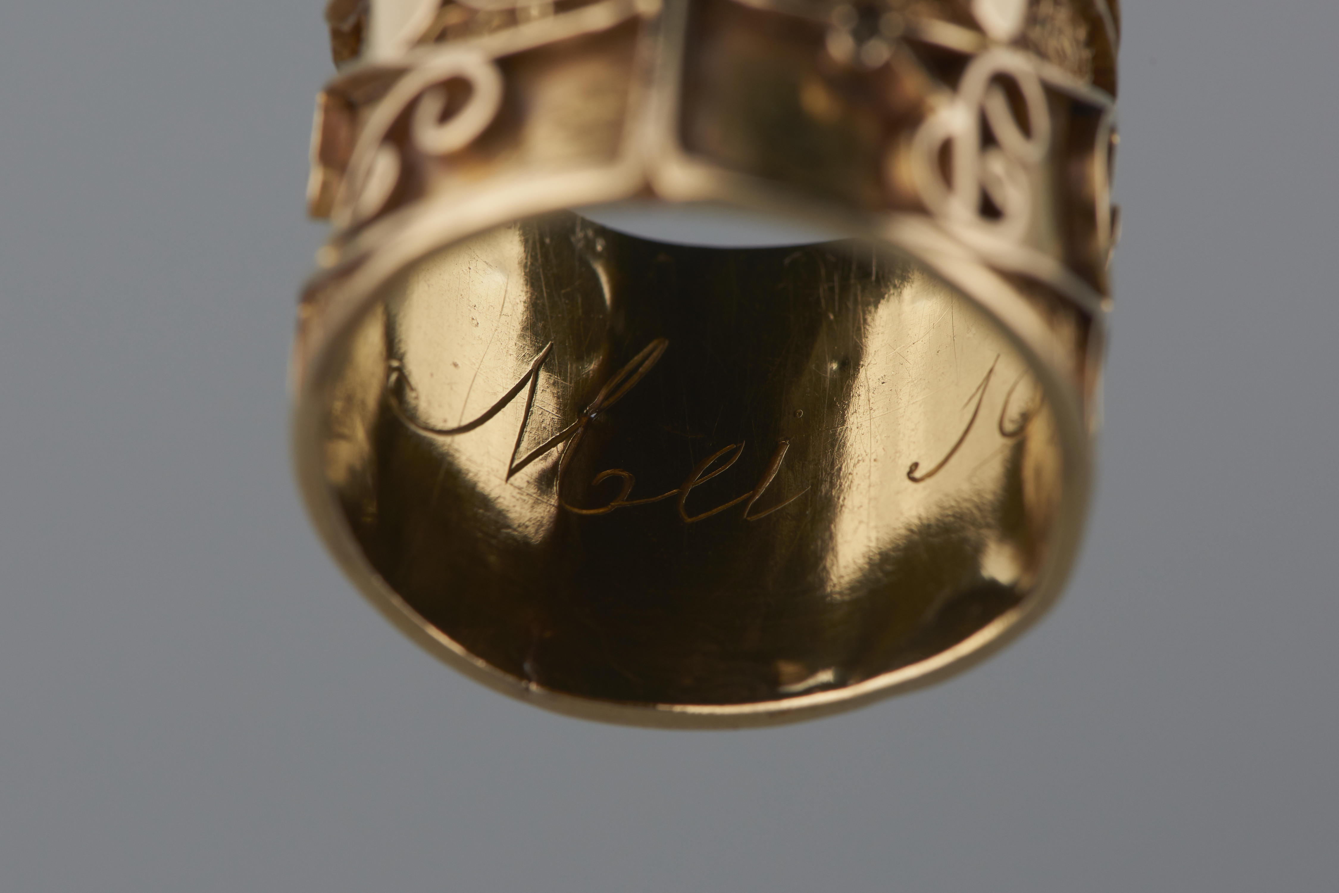 Gouden trouwring van een rijke rooms-katholieke vrouw van Zuid-Beveland. De ring draagt de initialen van de bruid en bruidegom: ‘J.v.d.D.’ en ‘A.D.R.’. Volgens de inscriptie aan de binnenkant van de ring was de trouwdatum 24 mei 1871. Volgens een aantekening in de museumregistratie werd dit soort ringen tot het eind van de negentiende eeuw gedragen ...
