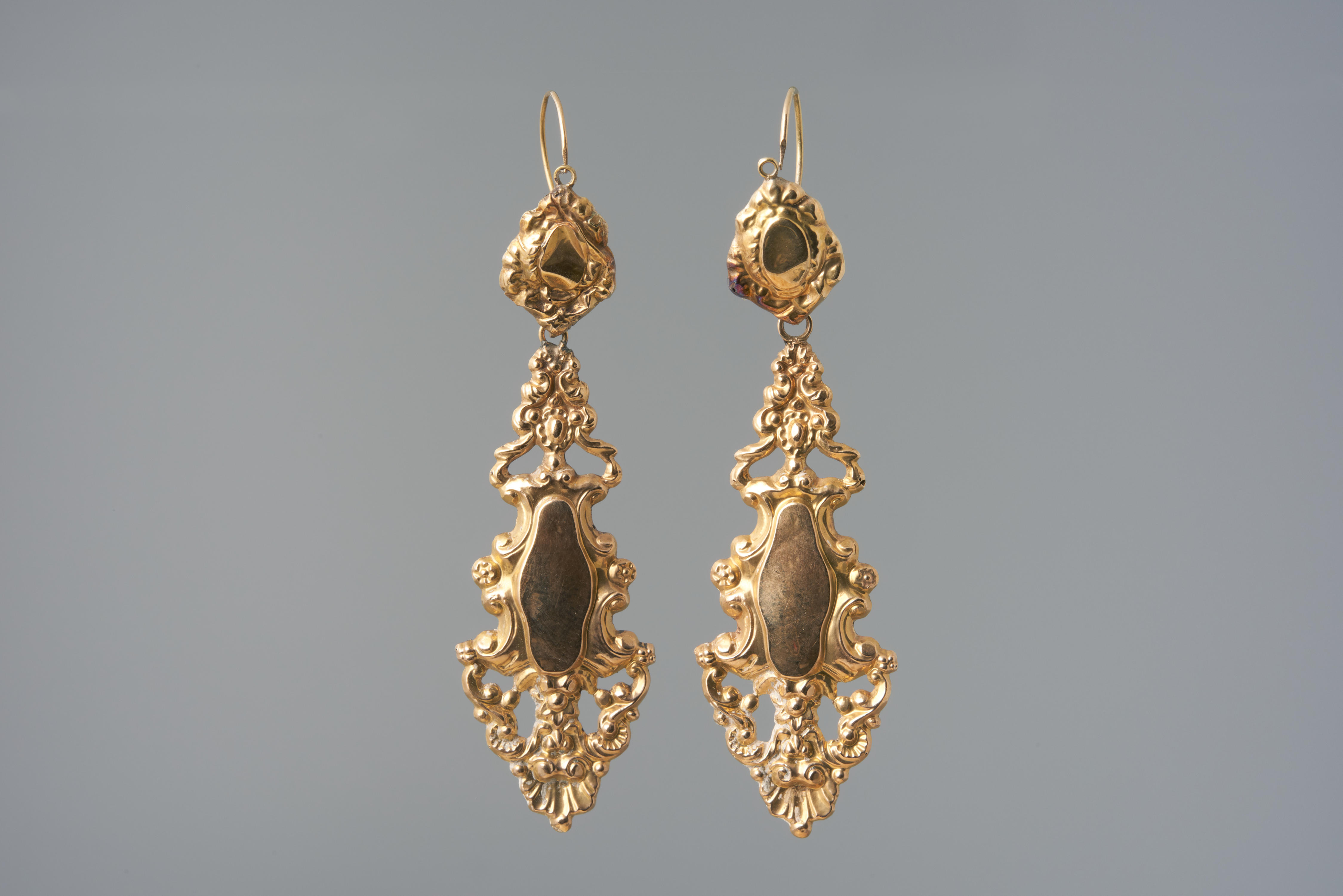 Paar 14-karaats gouden oorhangers, gedragen door een vrouw uit de provincie Noord-Brabant. Eén van de oorhangers is tussen 1821 en 1867 vervaardigd door J.B. Bertina uit Amsterdam. De hanger is in Nederland gekeurd. De vervaardiger van de andere oorhanger is onbekend. Deze hanger is in België gekeurd, tussen 1832 en 1869. Dit type oorhangers werd ...