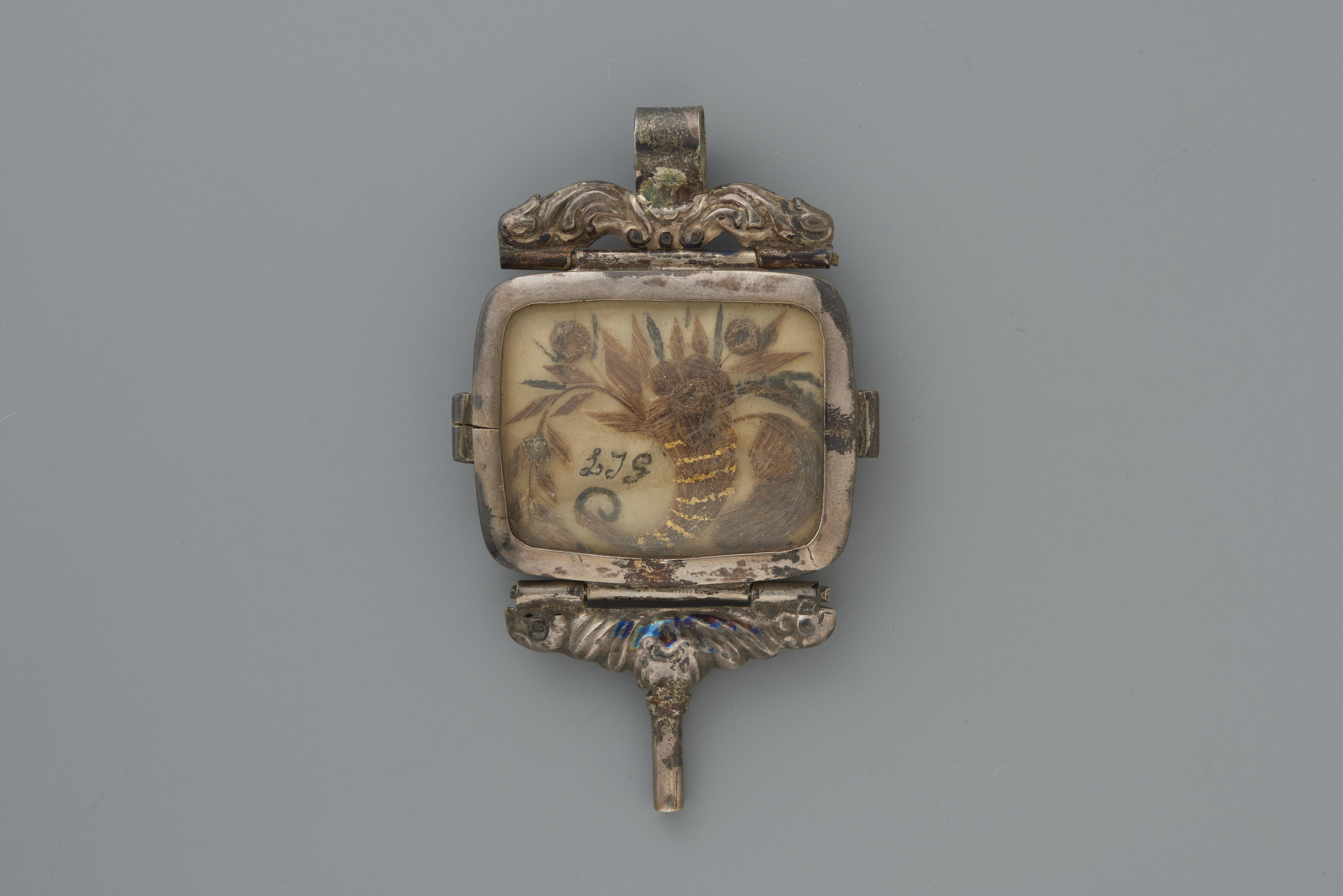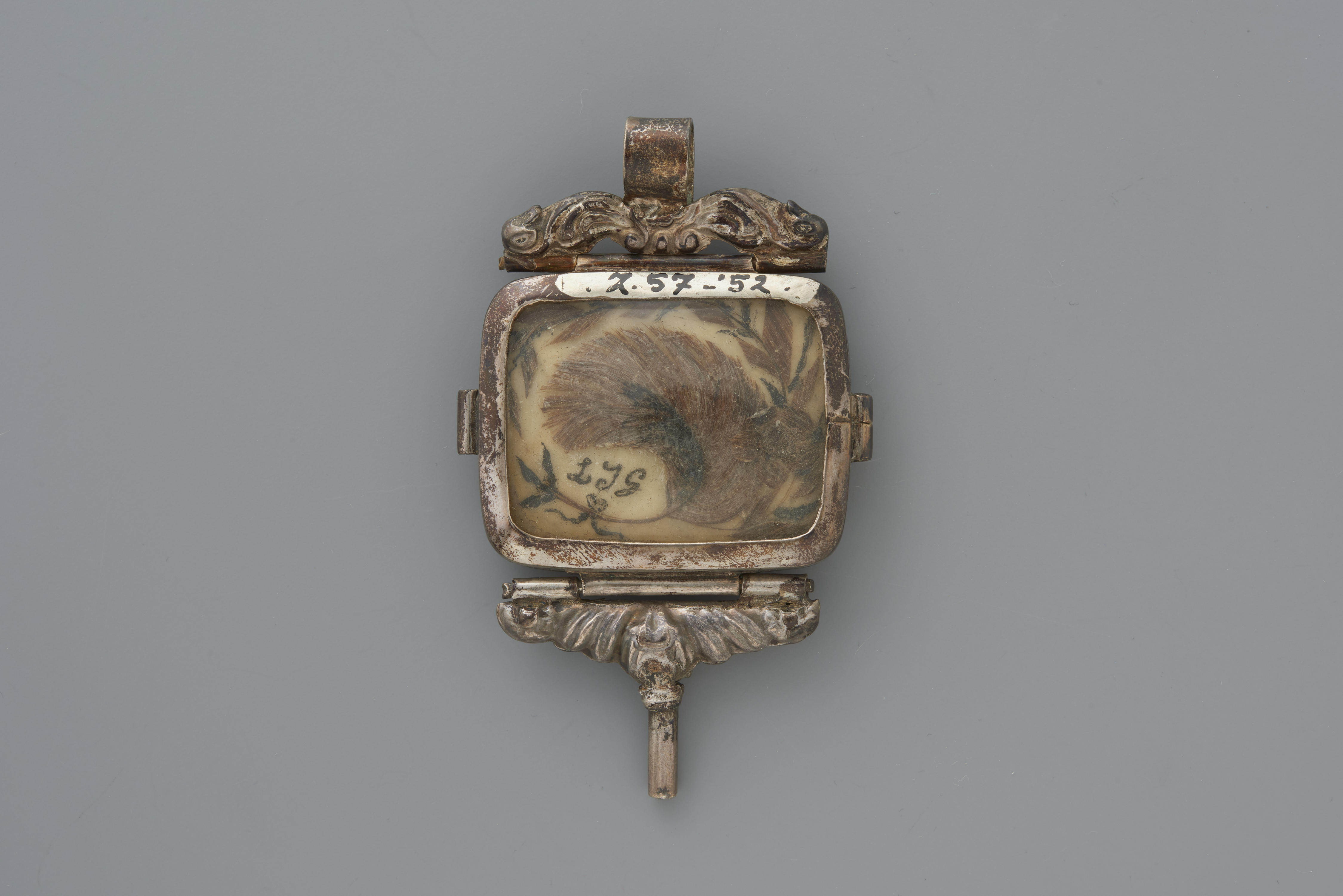 Zilveren horlogesleutel, versierd met haarwerk. De sleutel is aan de ene zijde versierd met bloem- en bladmotieven en aan de andere zijde een hoorn des overvloeds en de initialen ‘L.J.G.’ Dergelijke horlogesleutels werden aan een horlogeketting gedragen. Dit type werd op verschillende plaatsen in Nederland gebruikt. Deze sleutel is afkomstig uit de provincie Groningen. Hij ...