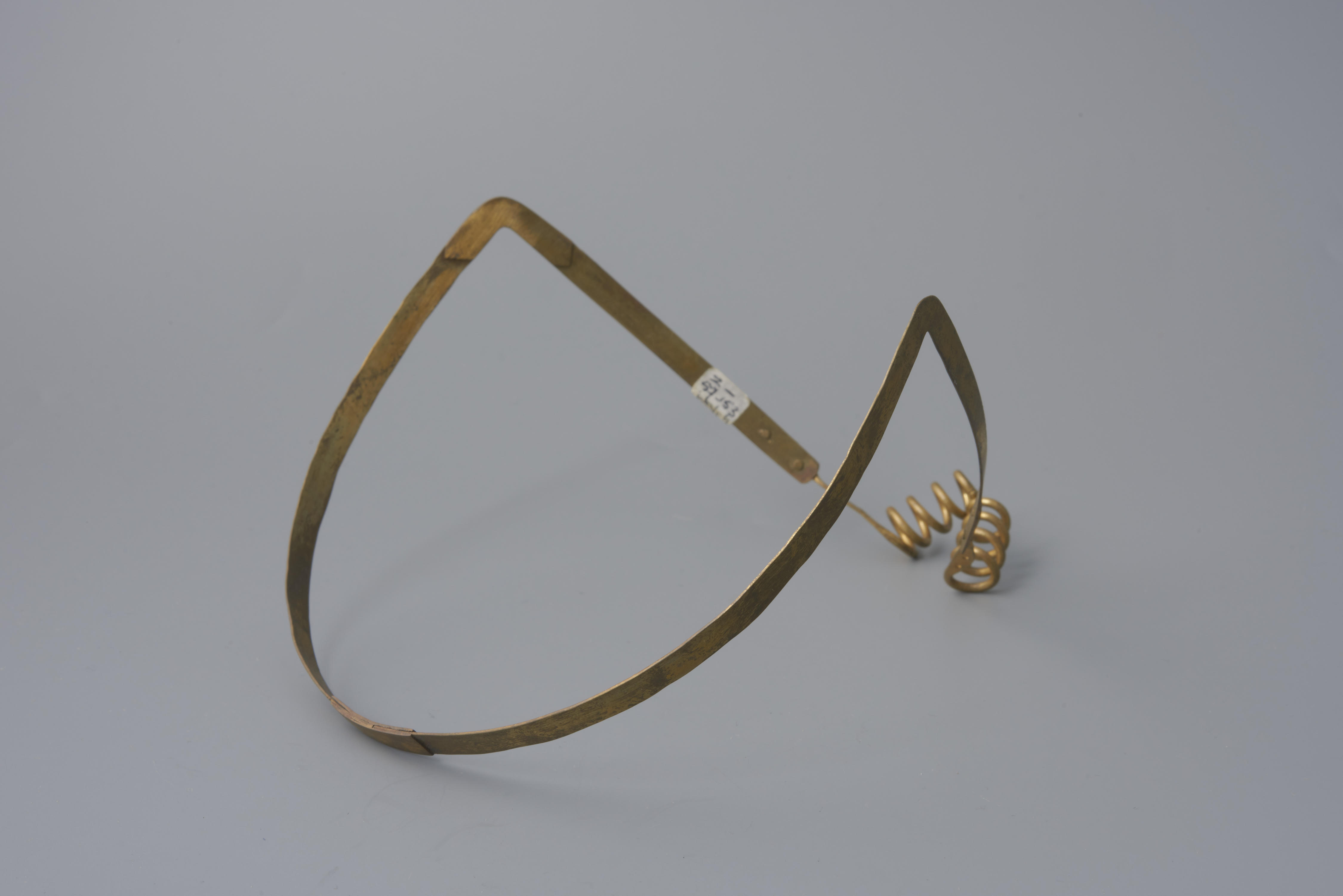 Oorijzer, bestaande uit een messing beugel en twee vergulde messing krullen. Het oorijzer is gedragen door een vrouw in streekdracht van Walcheren. De krullen hebben vier windingen. In de aanzet van de krullen zitten twee gaatjes. Door deze gaatjes kunnen spelden worden gestoken om het oorijzer en de muts aan elkaar vast te maken.