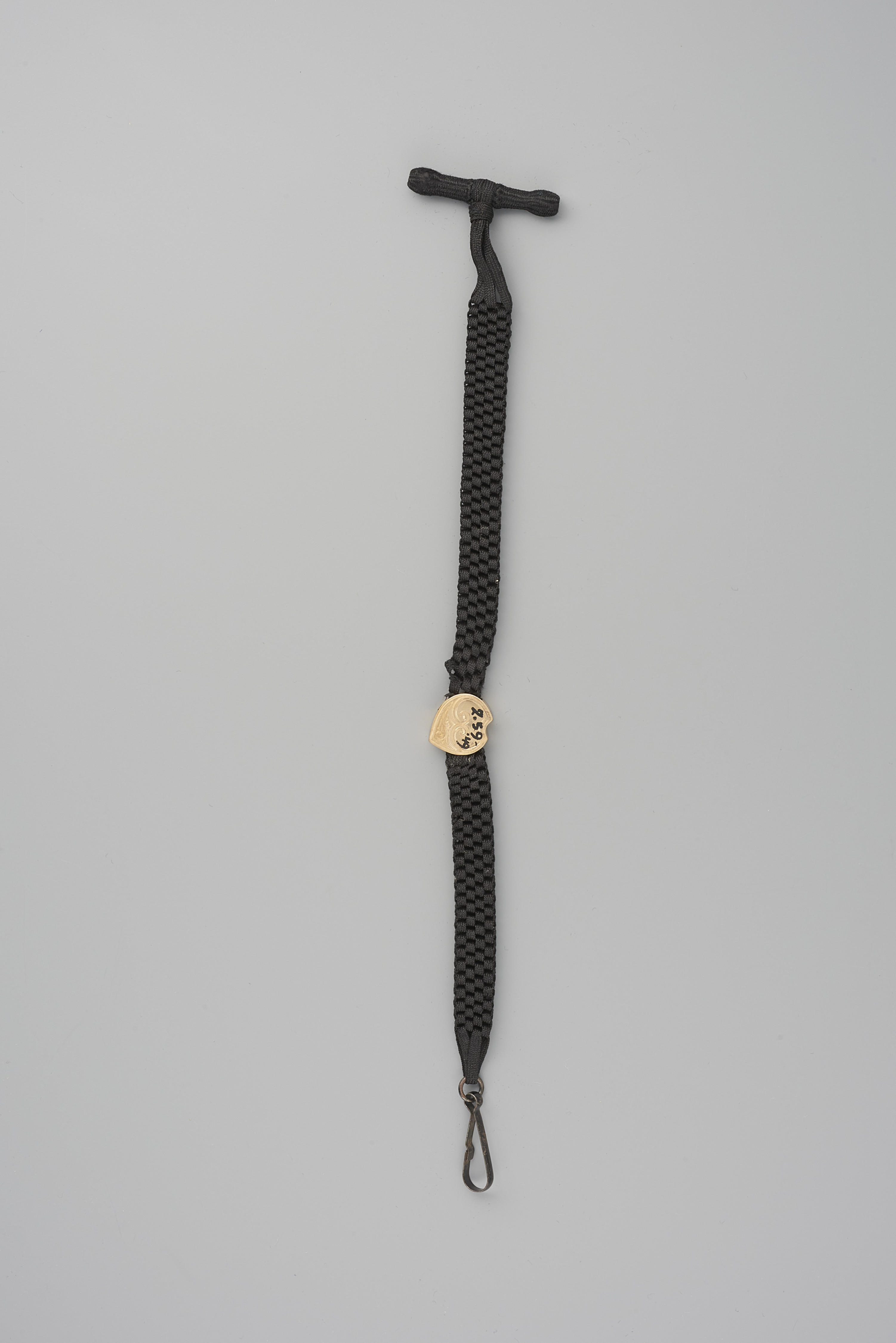 Deze horlogeketting heeft een gevlochten katoenen band met een gouden schuifje. Dergelijke horlogekettingen werden tussen 1880 en 1920 algemeen in Nederland gedragen. Dit exemplaar komt uit Terborg in de IJsselstreek. De vervaardiger is onbekend.