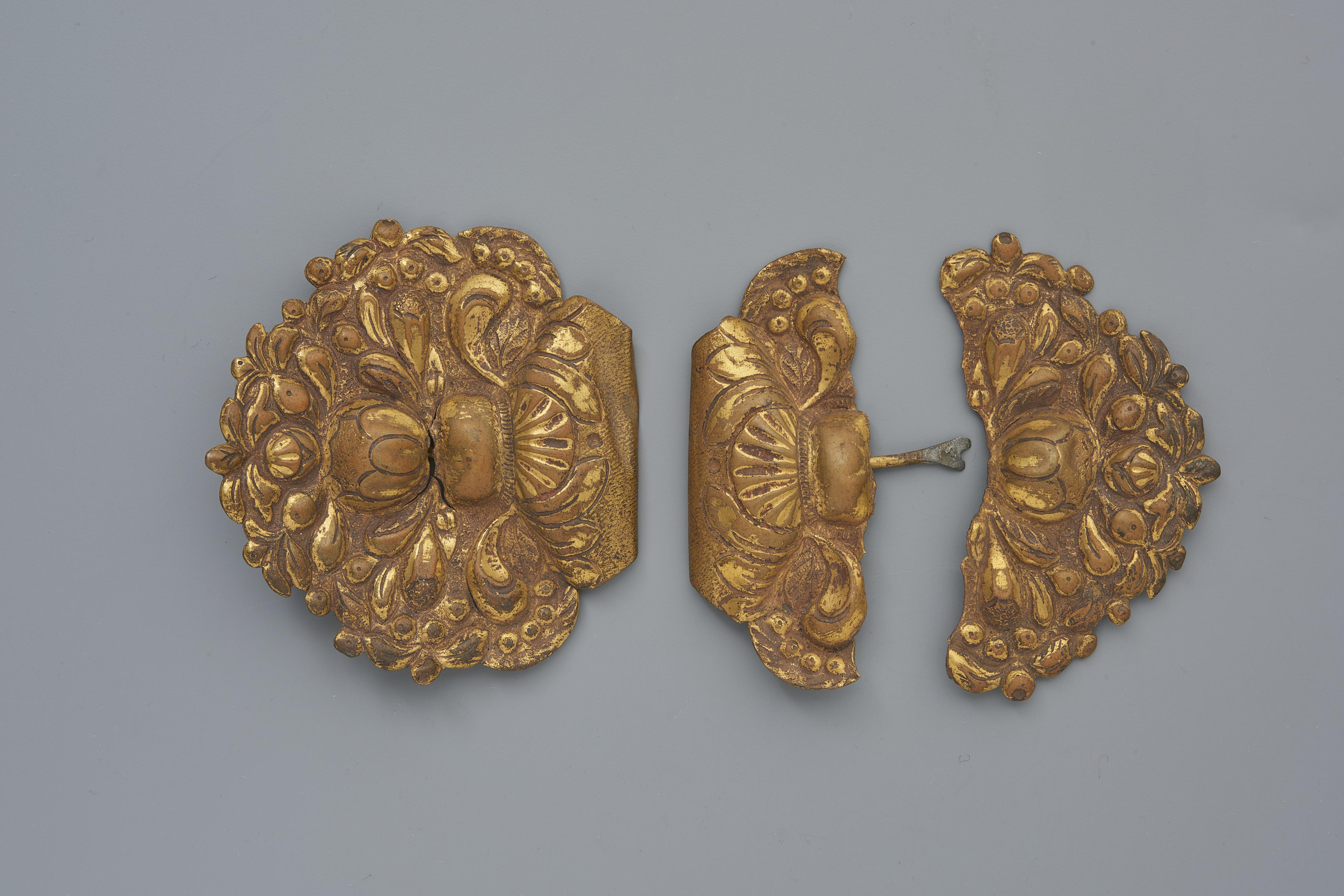 Paar vergulde messing oorijzerstiften. Ze zijn afkomstig van een oorijzer uit Friesland. Dit type oorijzerstift wordt in Friesland 'bloempotknop' of 'potknop' genoemd.