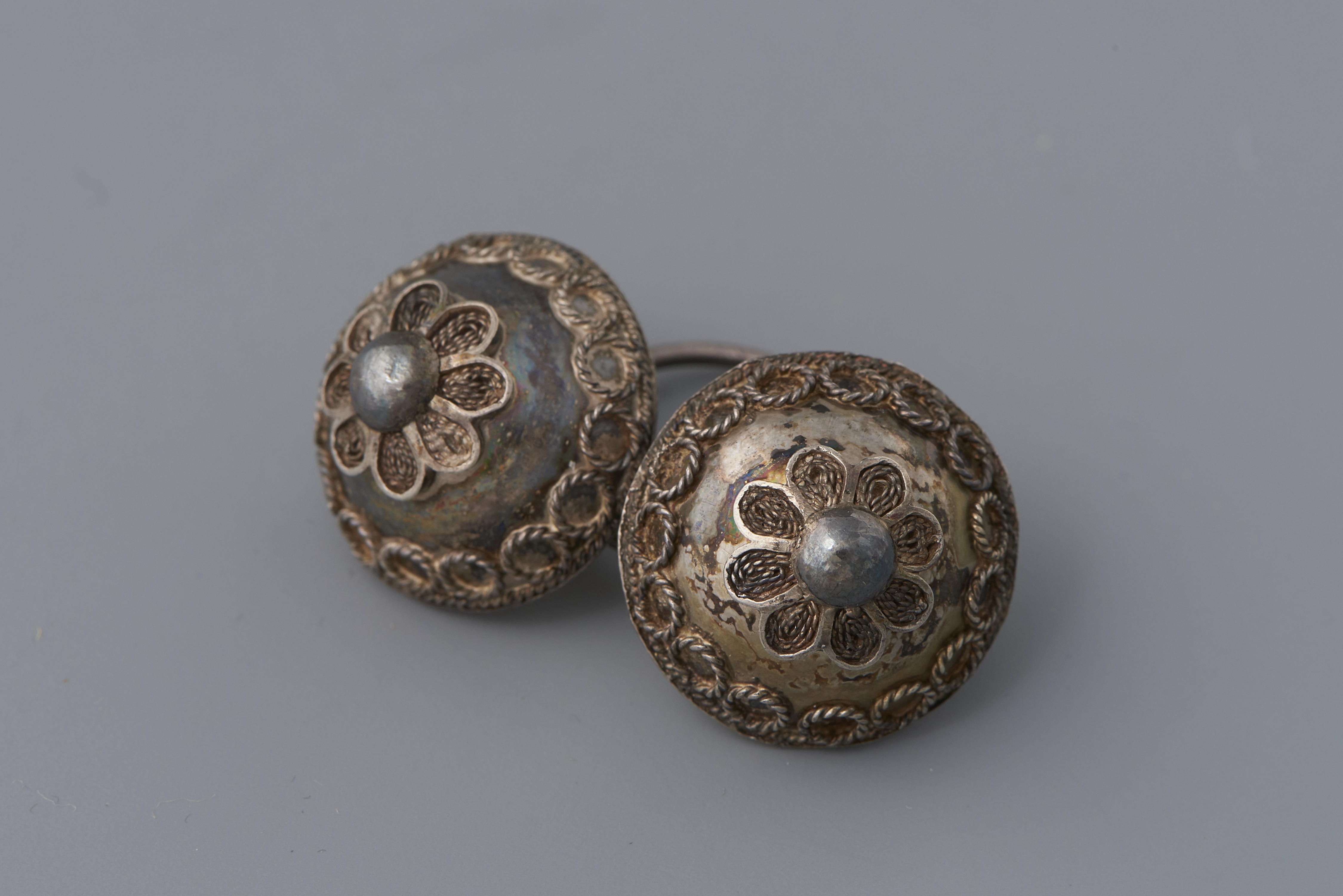Paar zilveren keelknopen, gedragen door man of jongen in Volendam. De vervaardiger is onbekend.