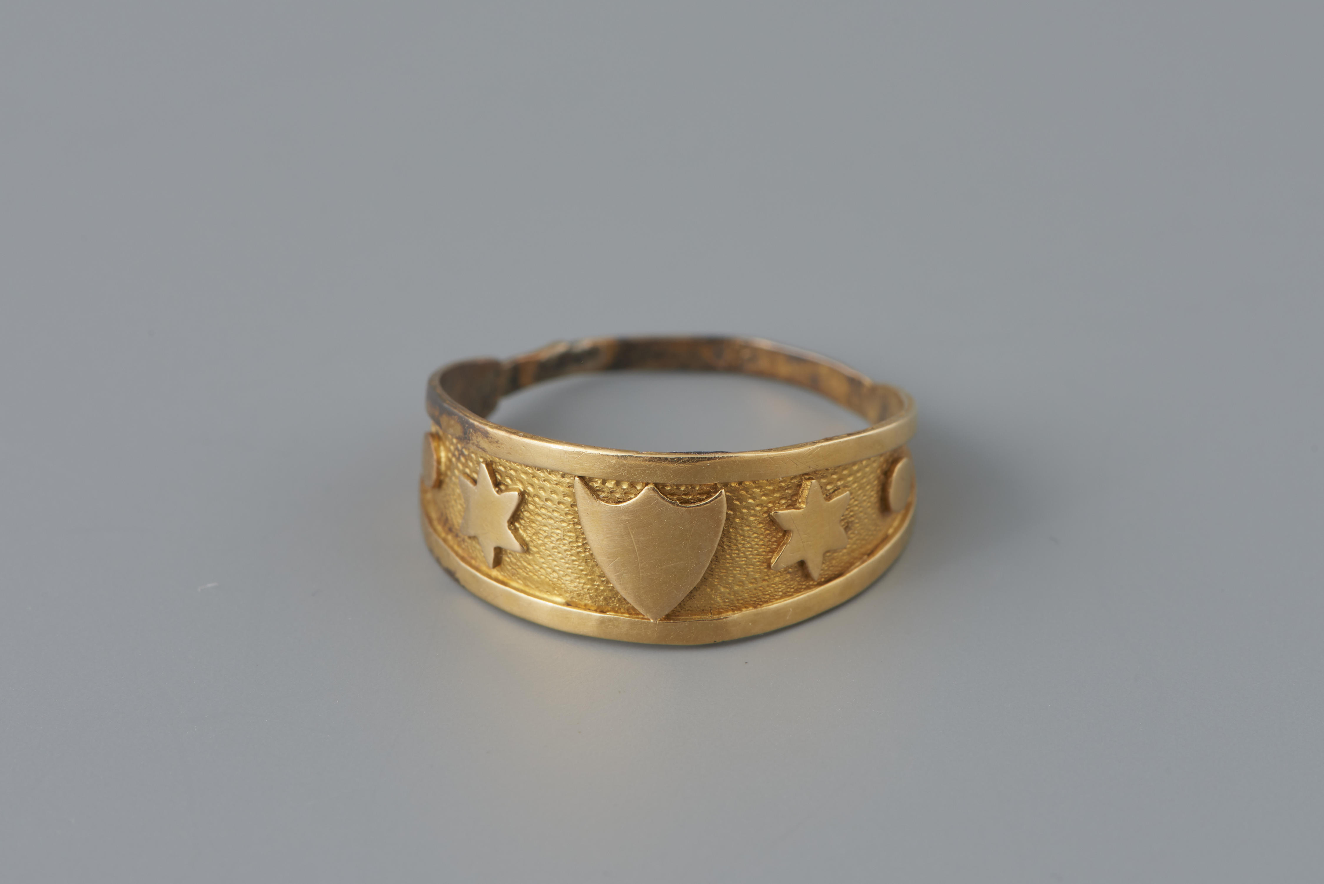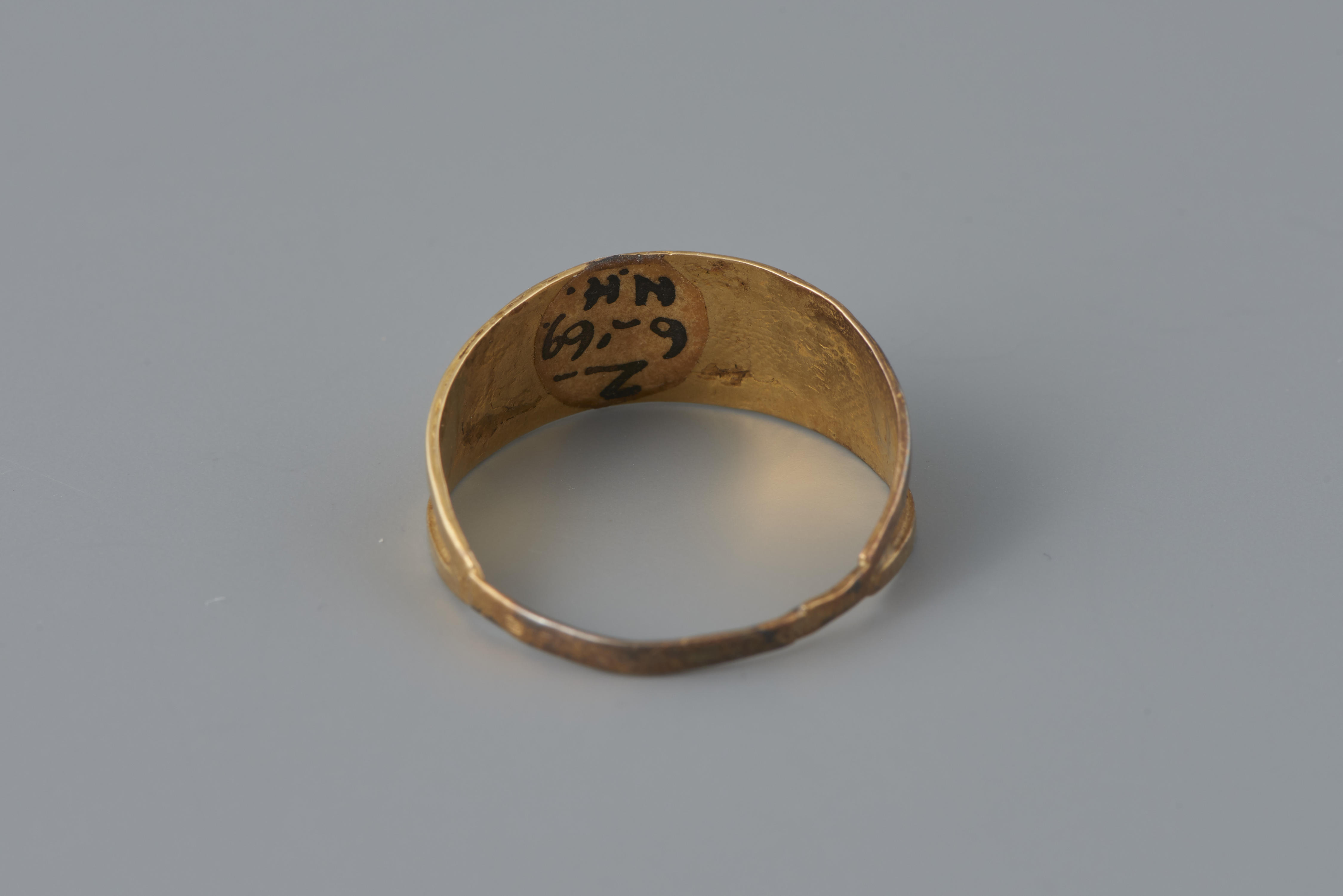 Ring van 14-karaats goud, gedragen door een vrouw uit Noord-Holland. De ring is tussen 1812 en 1829 vervaardigd door P. Beck in Alkmaar. Hij is na 1955 herkeurd.