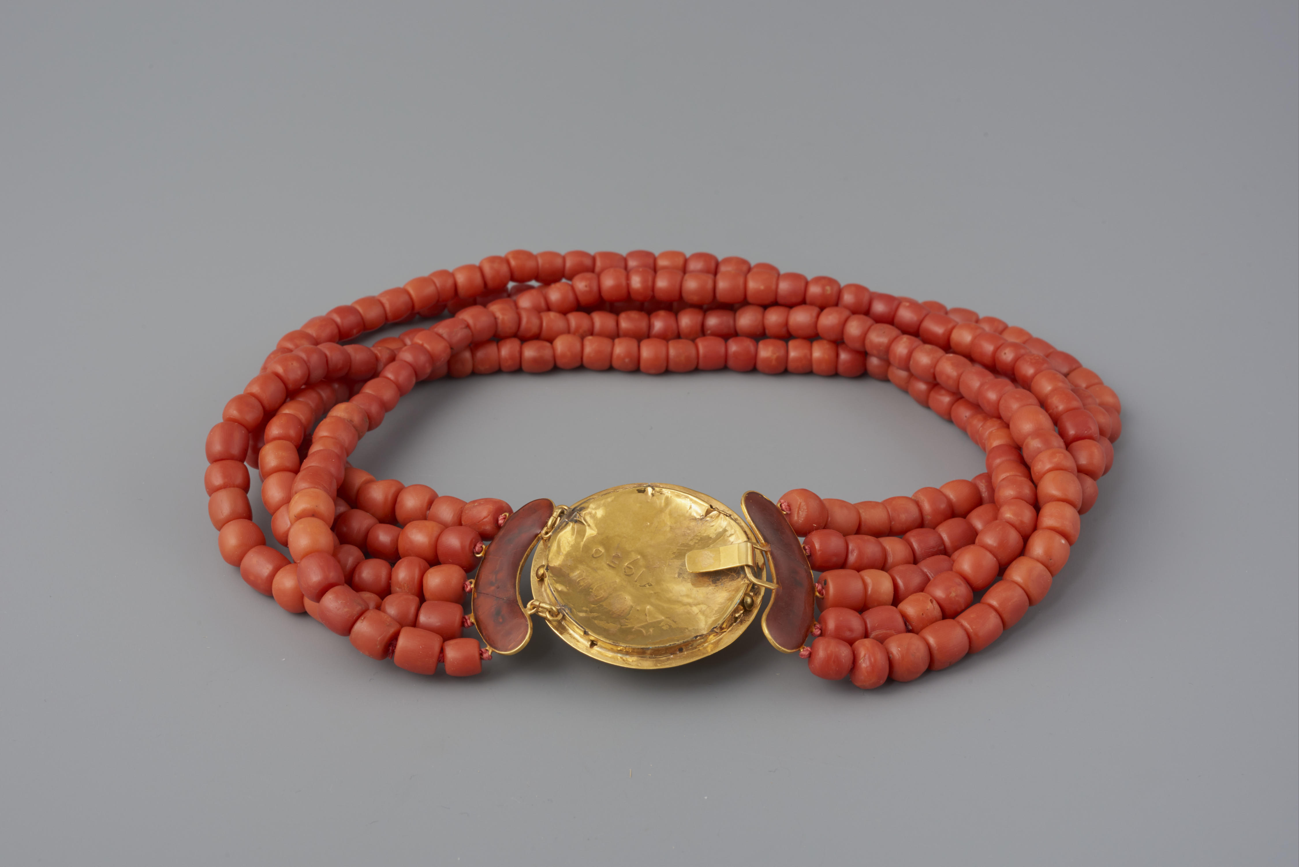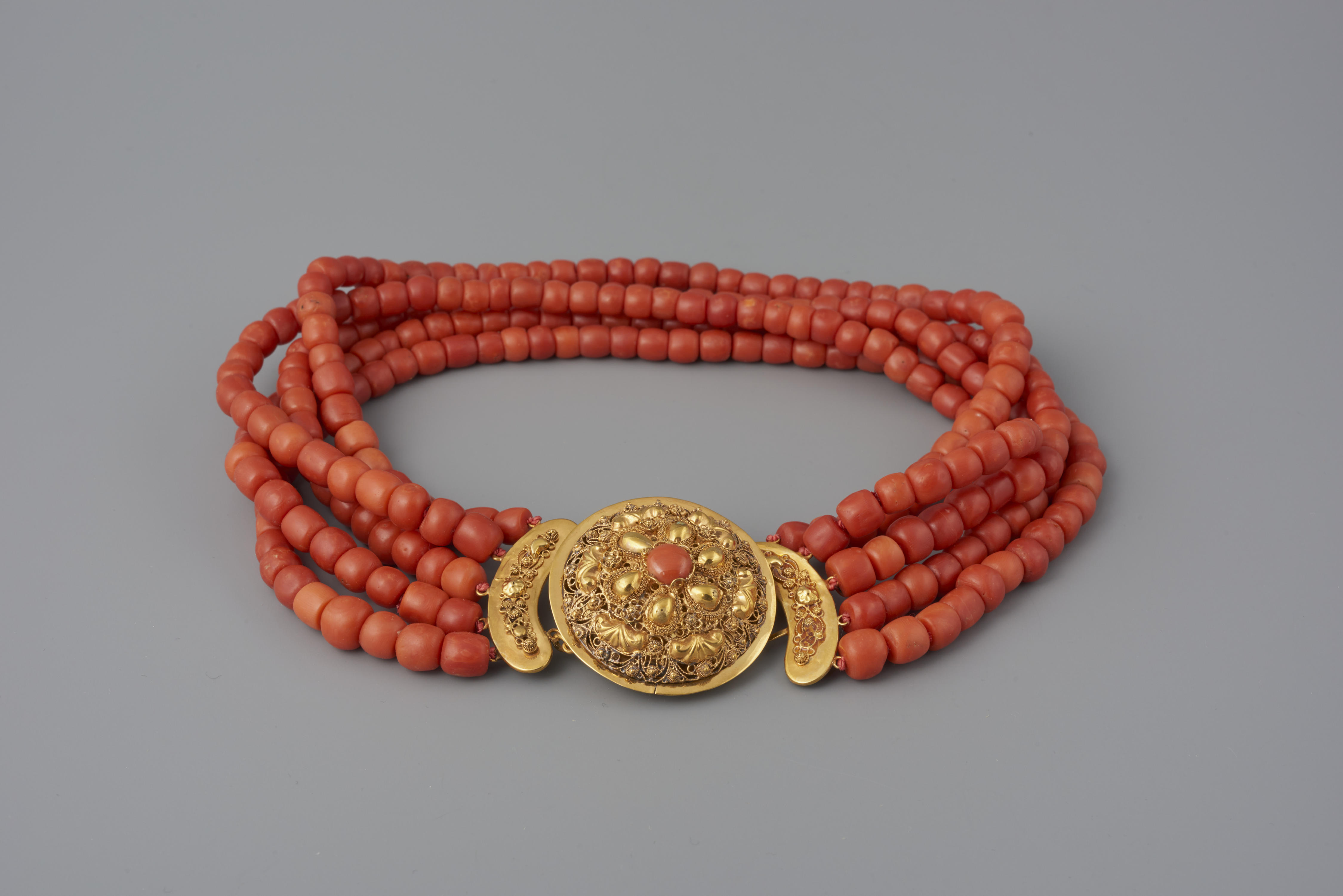 Halssnoer, bestaande uit een 14-karaats gouden slot en vijf strengen kralen van bloedkoraal. De oorspronkelijke kralen zijn in het museum voor andere doeleinden gebruikt. In 1955 zijn de huidige kralen aan het snoer gezet. Het slot is gedragen door een vrouw van het Kampereiland. De vervaardiger is onbekend.