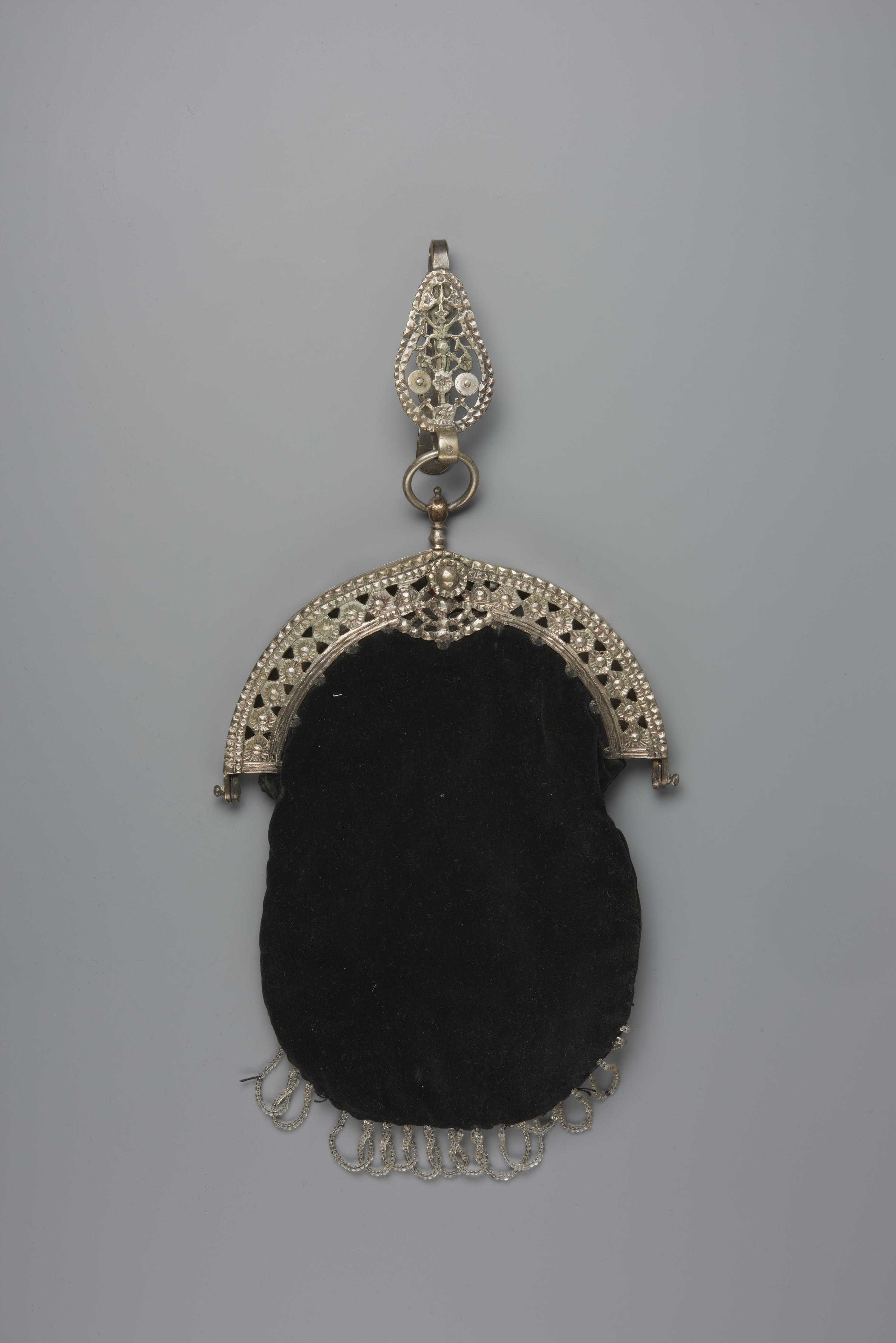 Beugeltas, gedragen door een vrouw uit Kampen. De tasbeugel en tashaak zijn van tweede gehalte zilver en de tas is van fluweel. De tasbeugel heeft een jaarletter uit 1856. Op de achterzijde is het opschrift 'J.I.D.B. 1887' ingegraveerd. Het meesterteken is te veel uitgesleten om de maker te kunnen achterhalen.