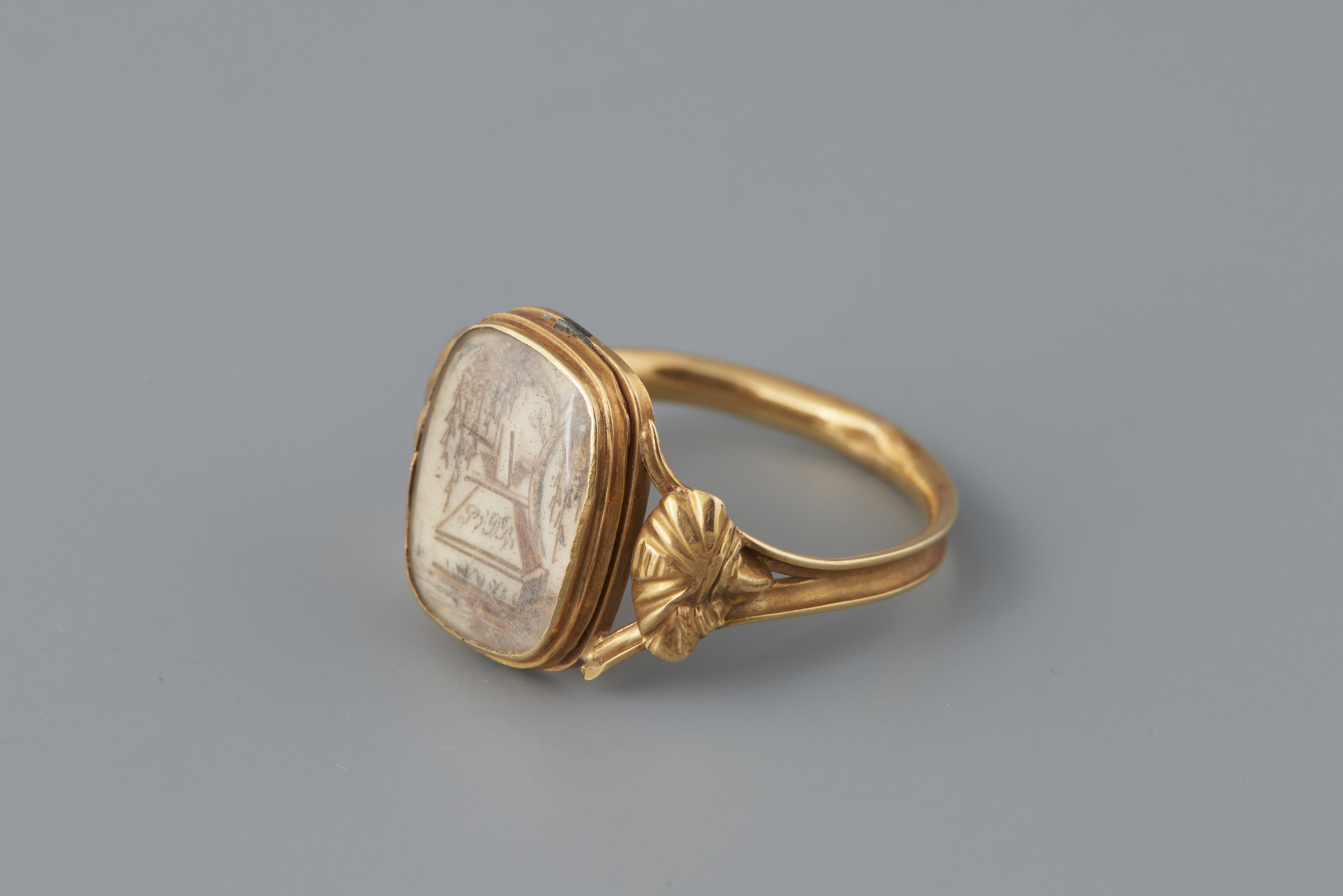 Deze ring van 18-karaats goud heeft een afbeelding van haarwerk. De afbeelding bestaat uit een graftombe met treurwilg en de initialen ‘PVDR’. Deze ring is door het museum aangekocht in Zeeland. Dit soort ringen werd bij de Zeeuwse streekdrachten echter niet algemeen gedragen. De ring is waarschijnlijk gedragen door een vrouw in modedracht. De maker ...