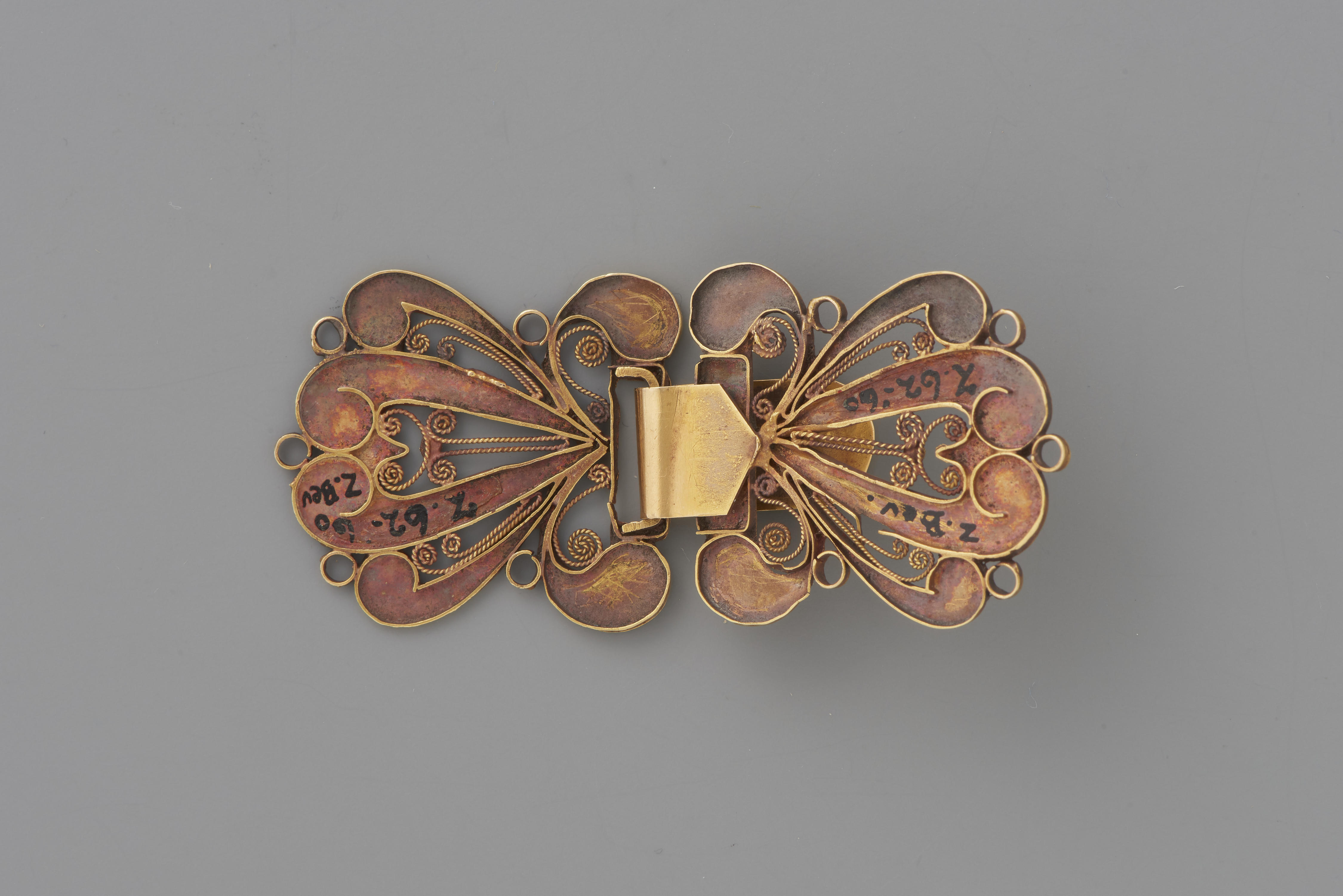 Gouden haak en oog, waarschijnlijk gebruikt als 'mantelineslot' door een vrouw uit Zeeuws-Vlaanderen. Het slot heeft een Belgisch gehalteteken dat gebruikt is tussen 1832 en 1869.