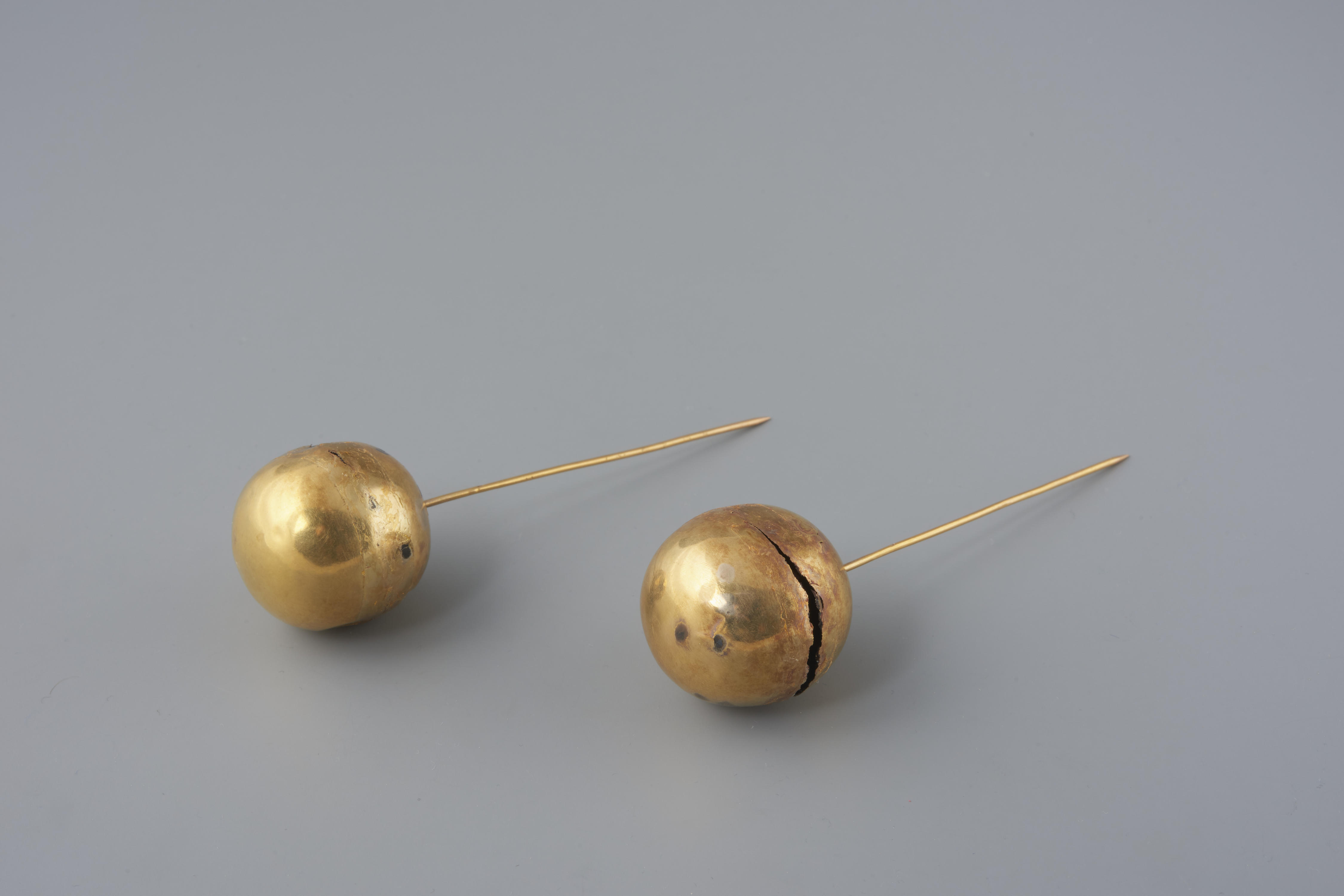 Paar vergulde messing 'bolspelden' met gouden steekspelden. Dergelijke mutsspelden zijn de gehele negentiende eeuw op Zuid-Beveland gedragen en omstreeks 1915 uit de mode geraakt. In de loop van de tijd zijn de spelden steeds groter geworden. Vrijwel iedereen droeg vergulde messing exemplaren. Slechts een enkele welgestelde vrouw droeg bolspelden van goud. Soms zijn de vergulde ...