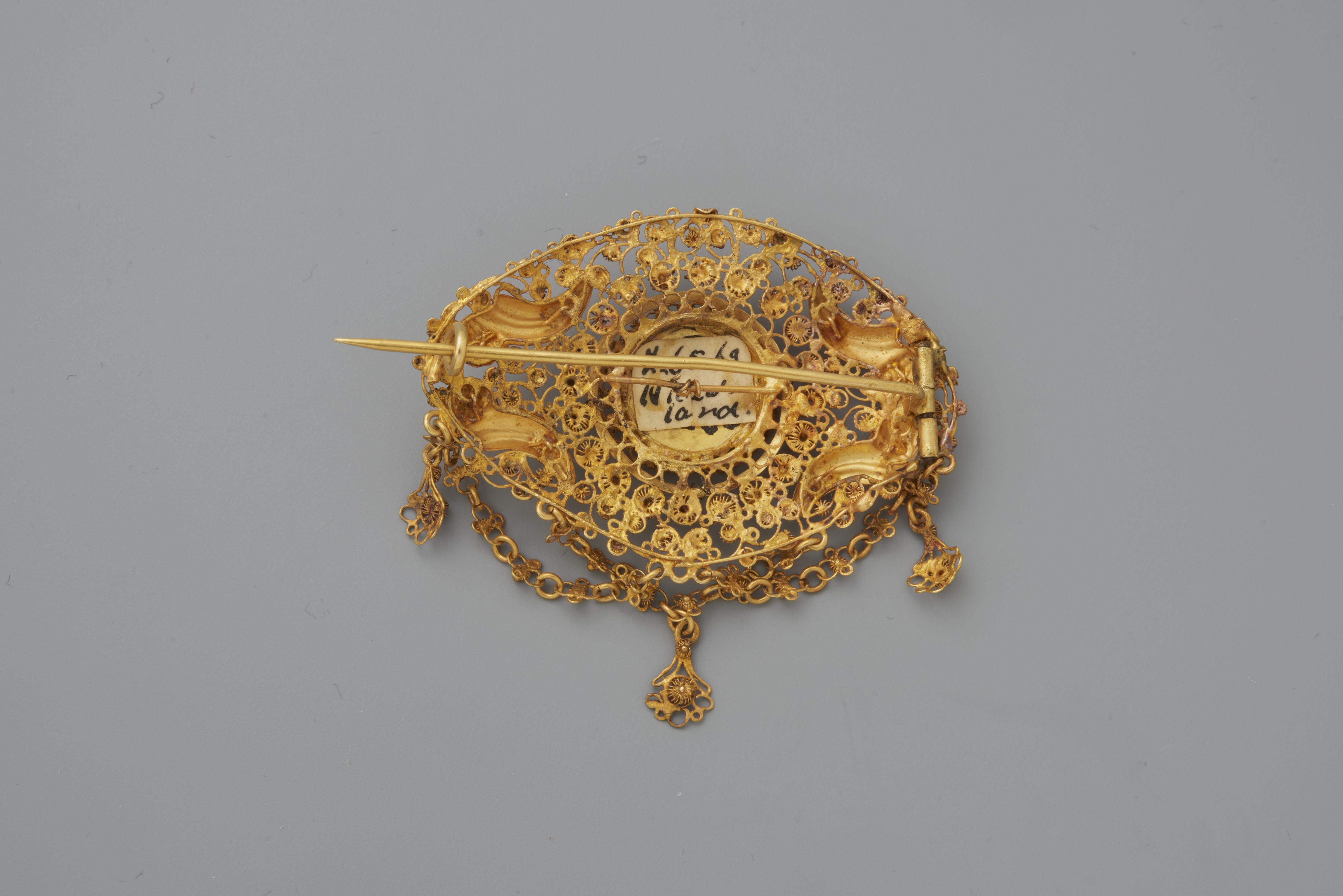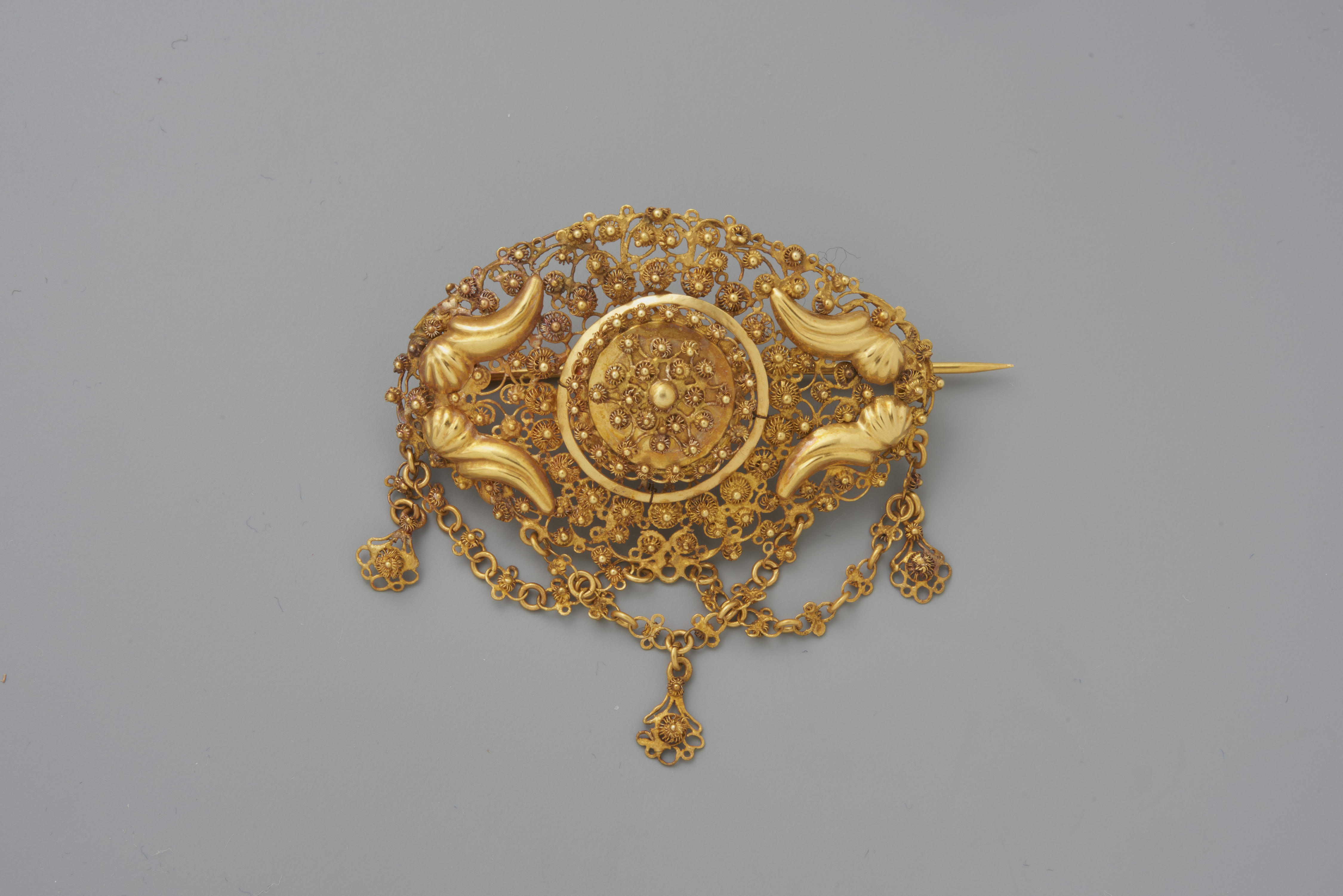 Broche of 'borstzeuge' van ongewaarborgd goud, gemaakt omstreeks 1870. De broche is gedragen door een vrouw uit Nieuwland. Dit soort broches werd ook in Noord-Brabant, op de Zuid-Hollandse eilanden en in Zuid-Beveland gedragen. De vervaardiger is onbekend.
