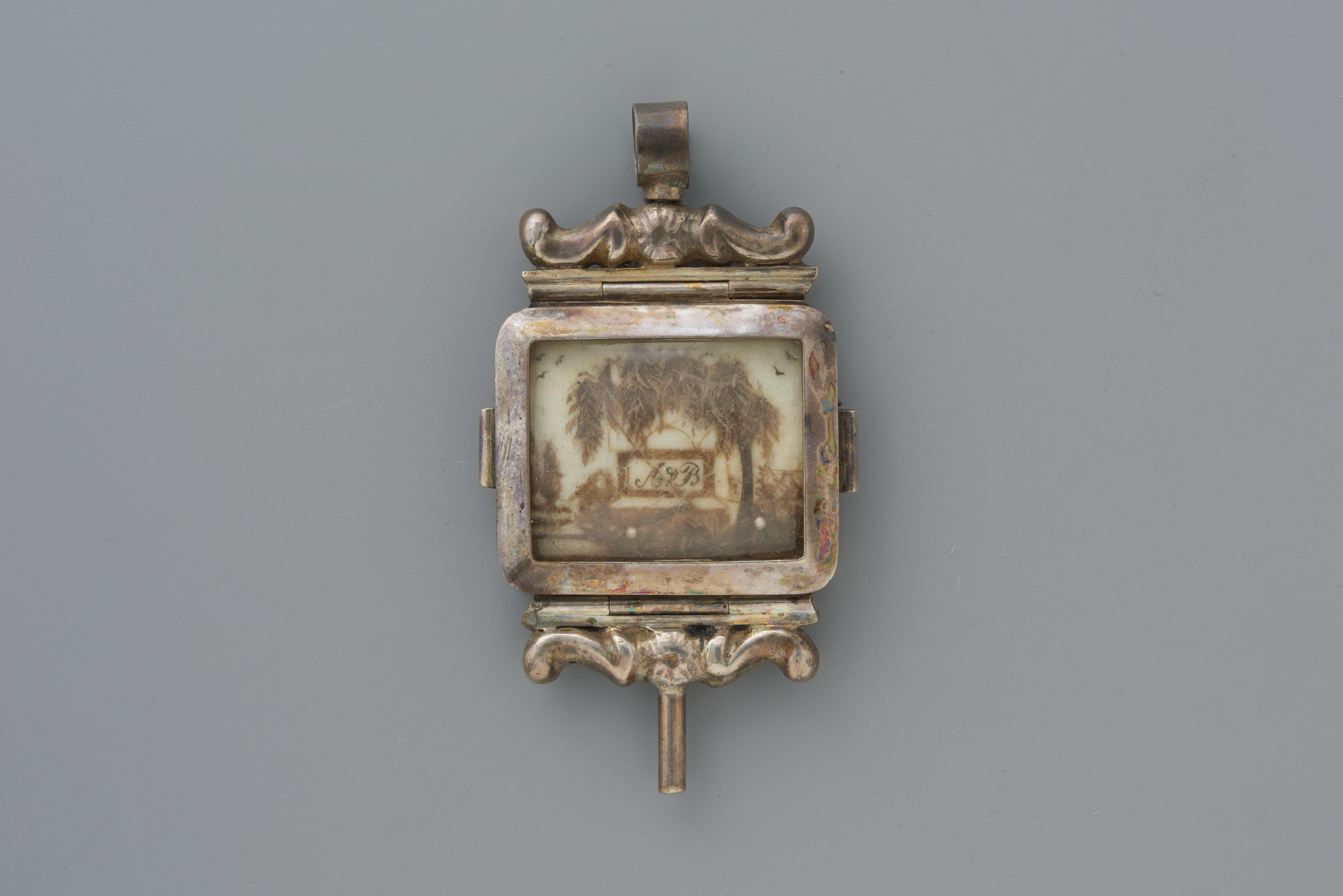 Zilveren horlogesleutel versierd met haarwerk, waarschijnlijk vervaardigd rond 1860. De versiering bestaat uit onder andere een treurboom en de initialen ‘A.v.B.’ Dergelijke horlogesleutels werden aan een horlogeketting gedragen. Dit type werd op verschillende plaatsen in Nederland gebruikt. Deze sleutel is afkomstig uit de provincie Groningen. De vervaardiger is onbekend.