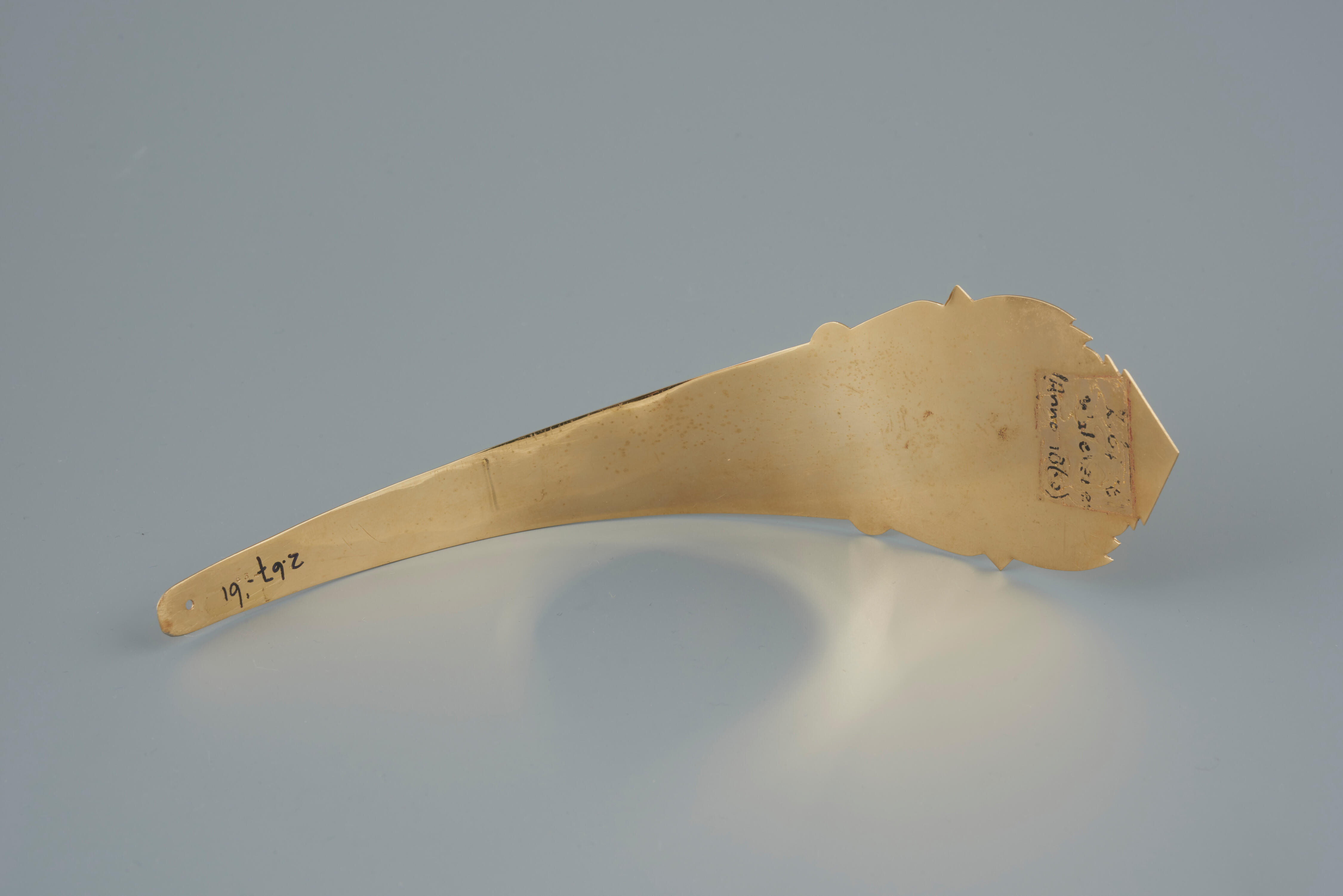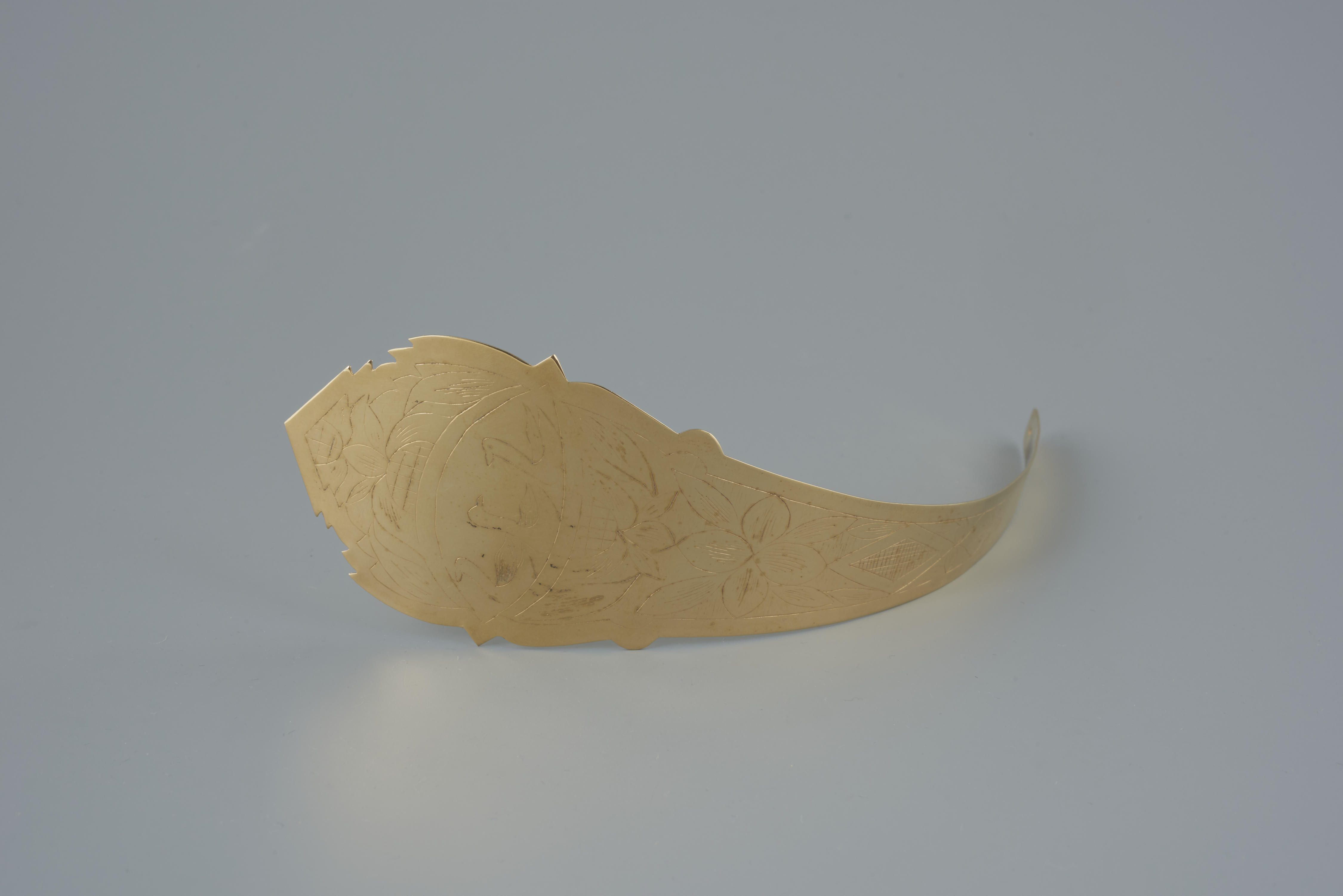 Voorhoofdsnaald van verguld messing, gedragen door een meisje of vrouw in streekdracht van Walcheren. De voorhoofdsnaald draagt geen meesterteken.