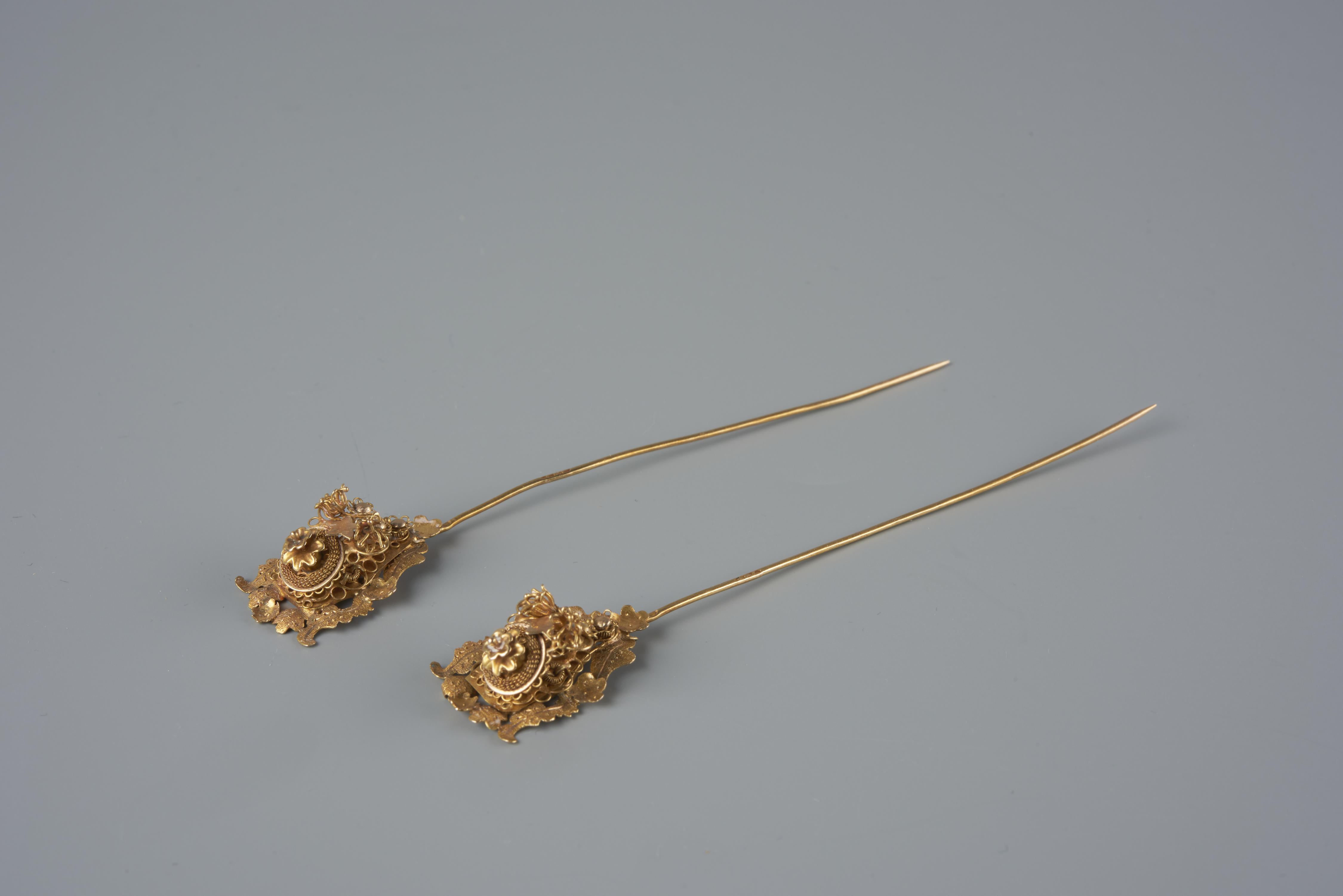 Paar 14-karaats gouden kapspelden, gedragen door een vrouw uit Rijn- of Delfland. Deze mutsspelden zijn tussen 1873 en 1906 vervaardigd door J.P.J. Driessen uit Leiden. Dit soort spelden werd verticaal in de muts gestoken, aan weerzijden van het voorhoofd.