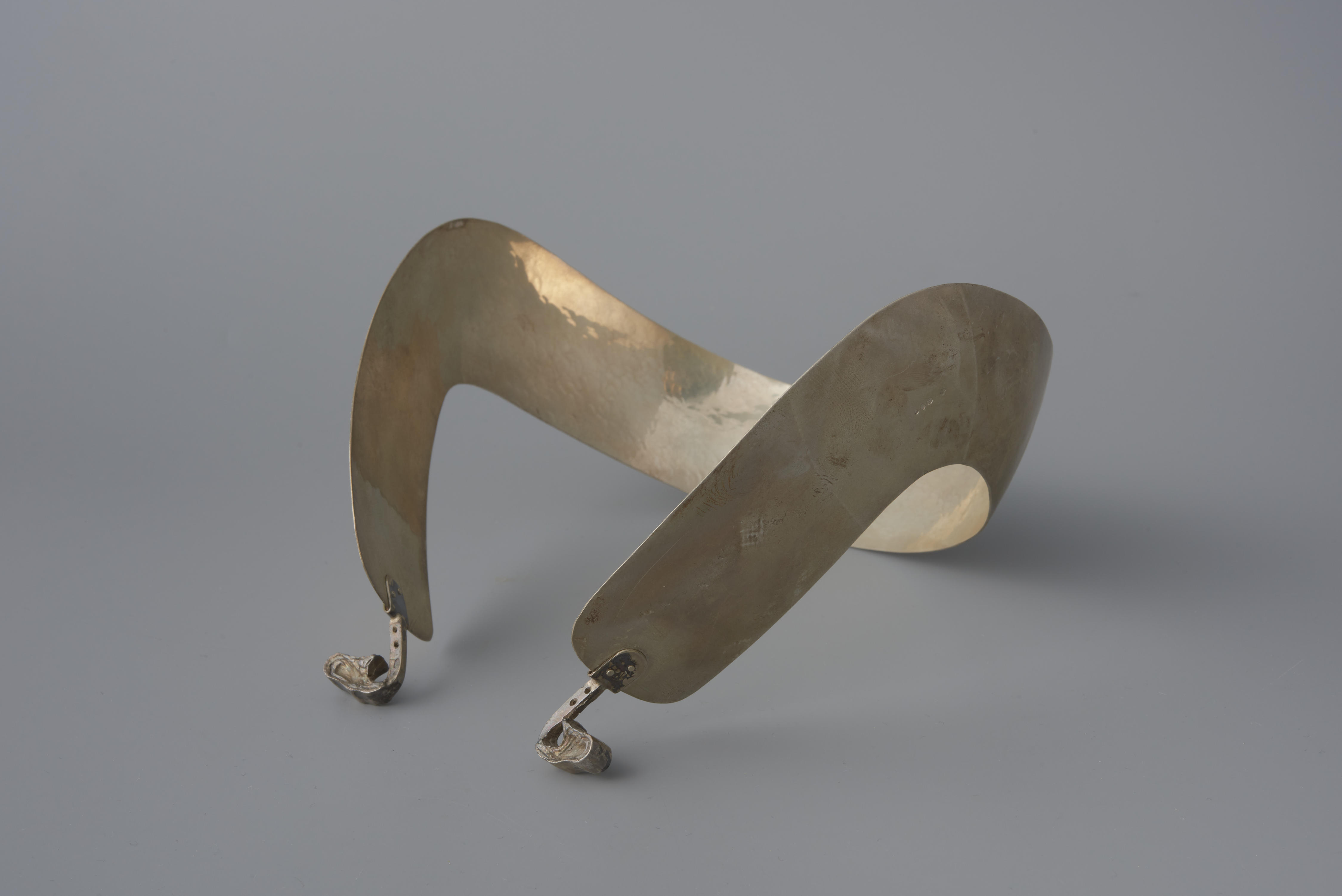 Een zilveren oorijzer, in 1978 op verzoek van het museum vervaardigd als Urker vrouwenoorijzer. Aan de uiteinden van de beugel zijn twee gegoten zilveren 'knoppen' bevestigd. In de aanzet van de knoppen zitten twee gaatjes, waardoor spelden gestoken kunnen worden om de muts aan het oorijzer vast te steken. De uiteinden van het Urker oorijzer ...