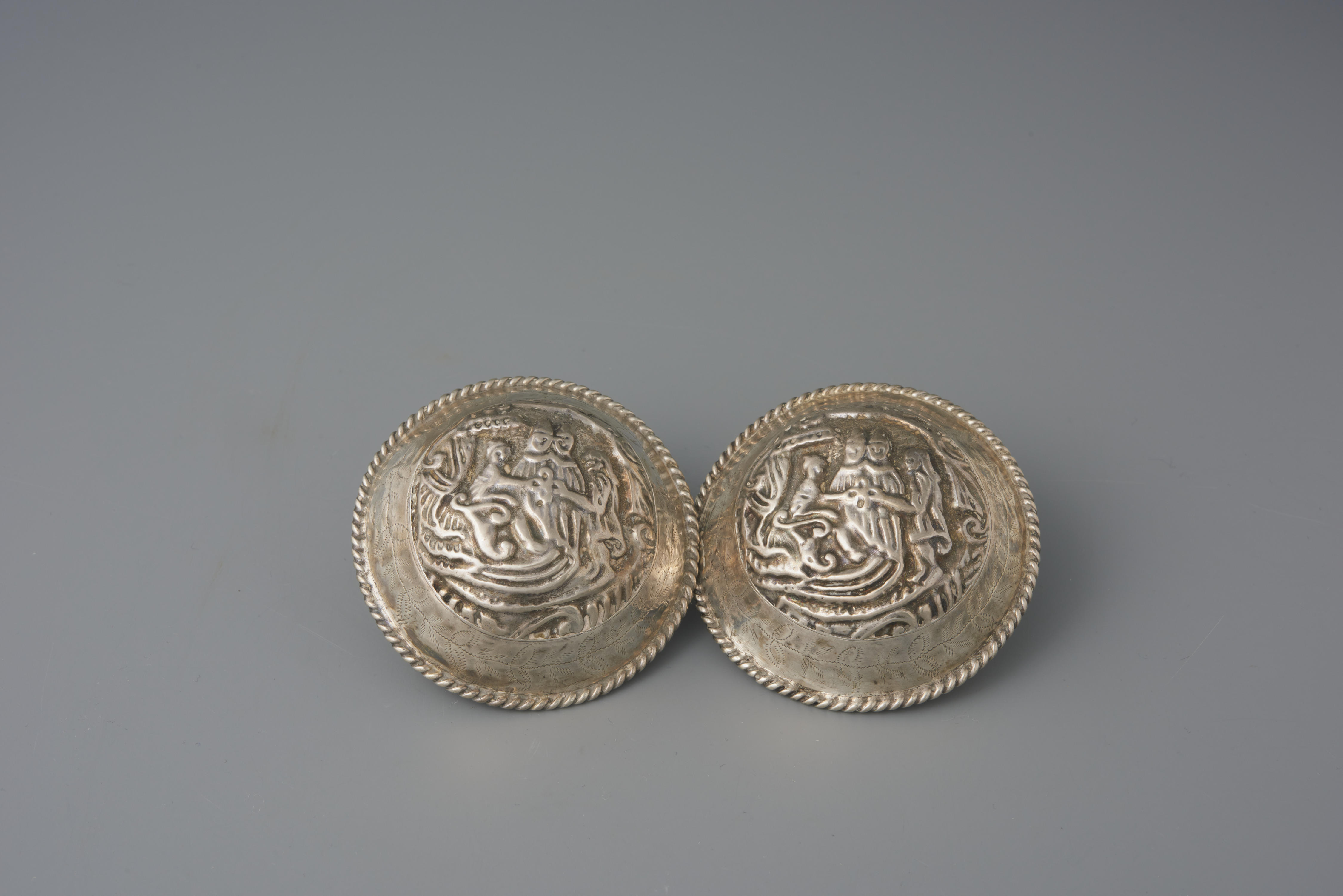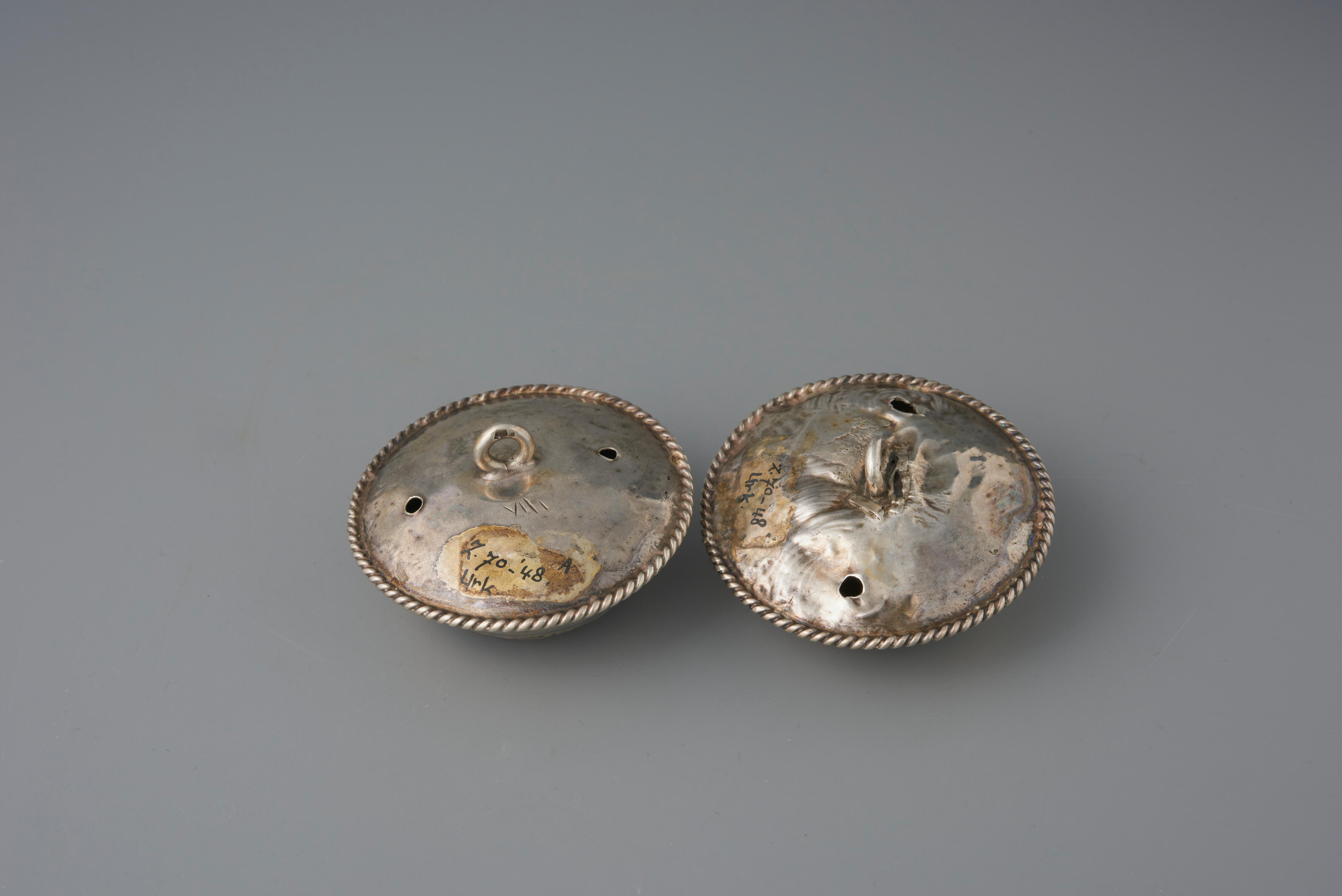 Een paar zilveren broekstukken, gedragen door een man of jongen in streekdracht als sluiting van de broeksboord. Dergelijke broekstukken werden gedragen door mannen en jongens op Urk en Zuid-Beveland. De voorstelling wordt op verschillende manieren geïnterpreteerd: Judas ontvangt de dertig zilverlingen van het Sanhedrin (Mattheus 26: 15-16), Salomo's oordeel (1 Koningen 3:16-28), Jozef voor de ...