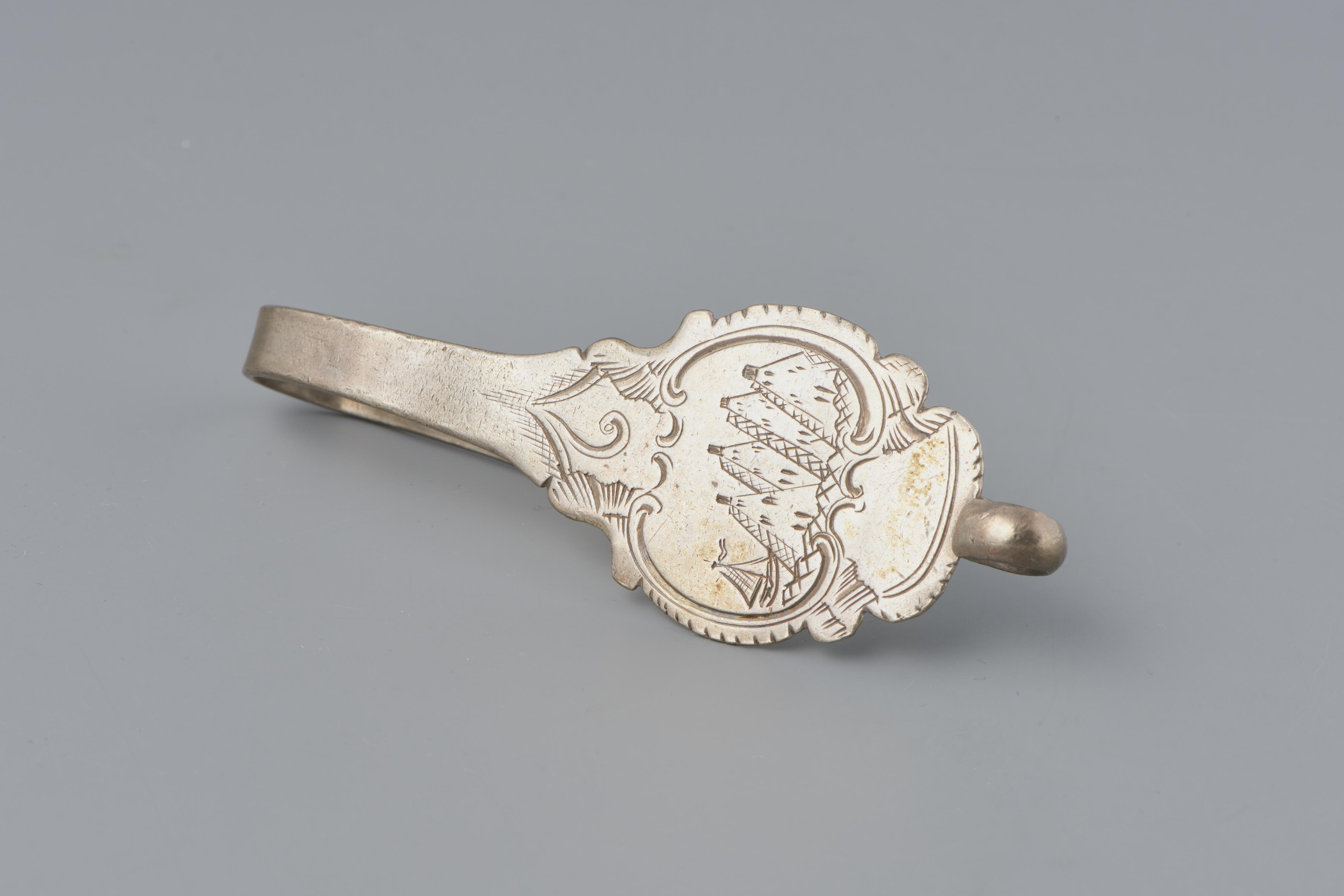 Zilveren tashaak, in 1795 vervaardigd door Jacobus Koppenol in Schoonhoven. De haak heeft een herkeuringsteken van 1807 en een gekroond monogram ‘ET’, een keurteken uit 1812-1813. Aan het oog wordt de beugeltas bevestigd, waarna de haak over de boord van de rok gehangen wordt.