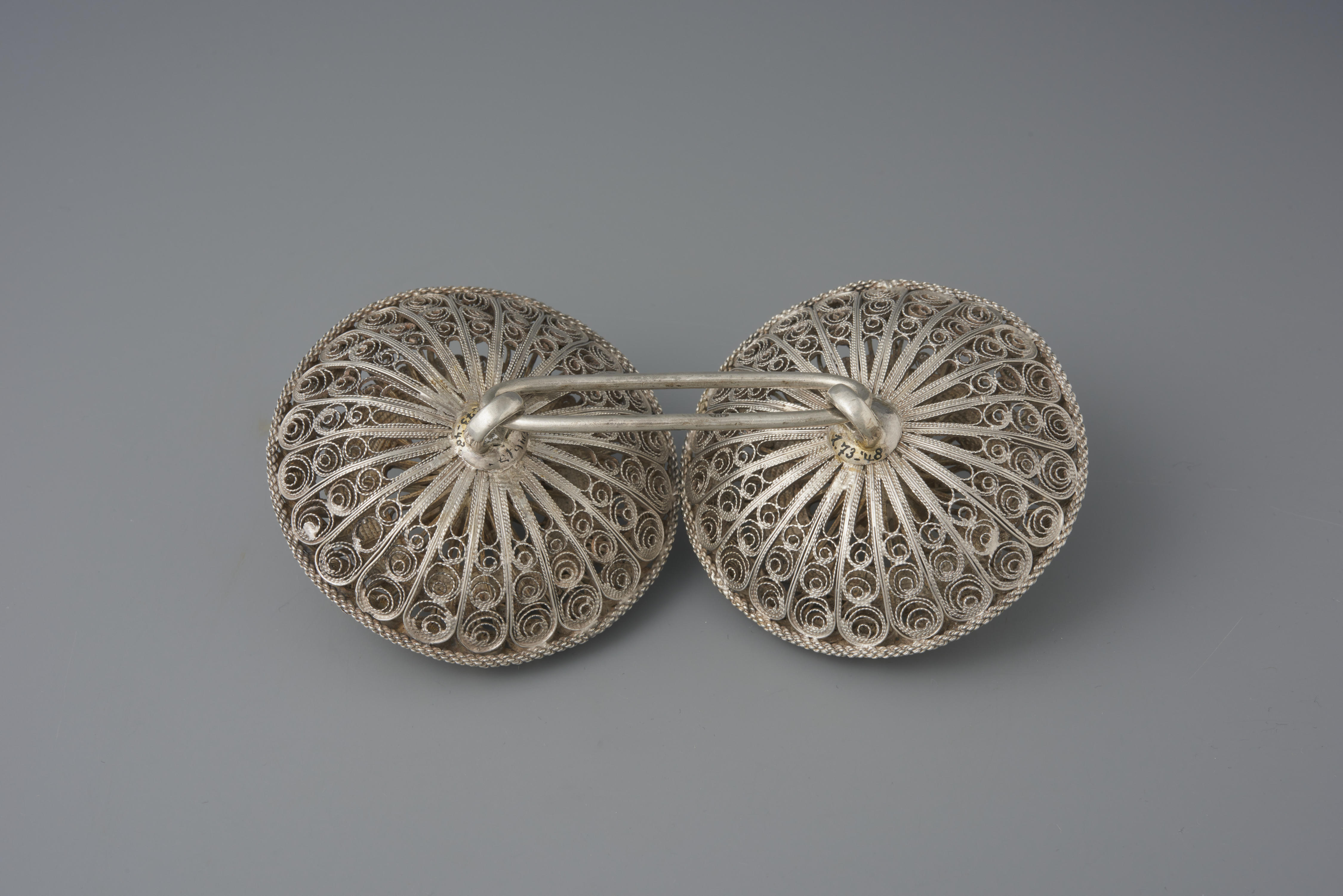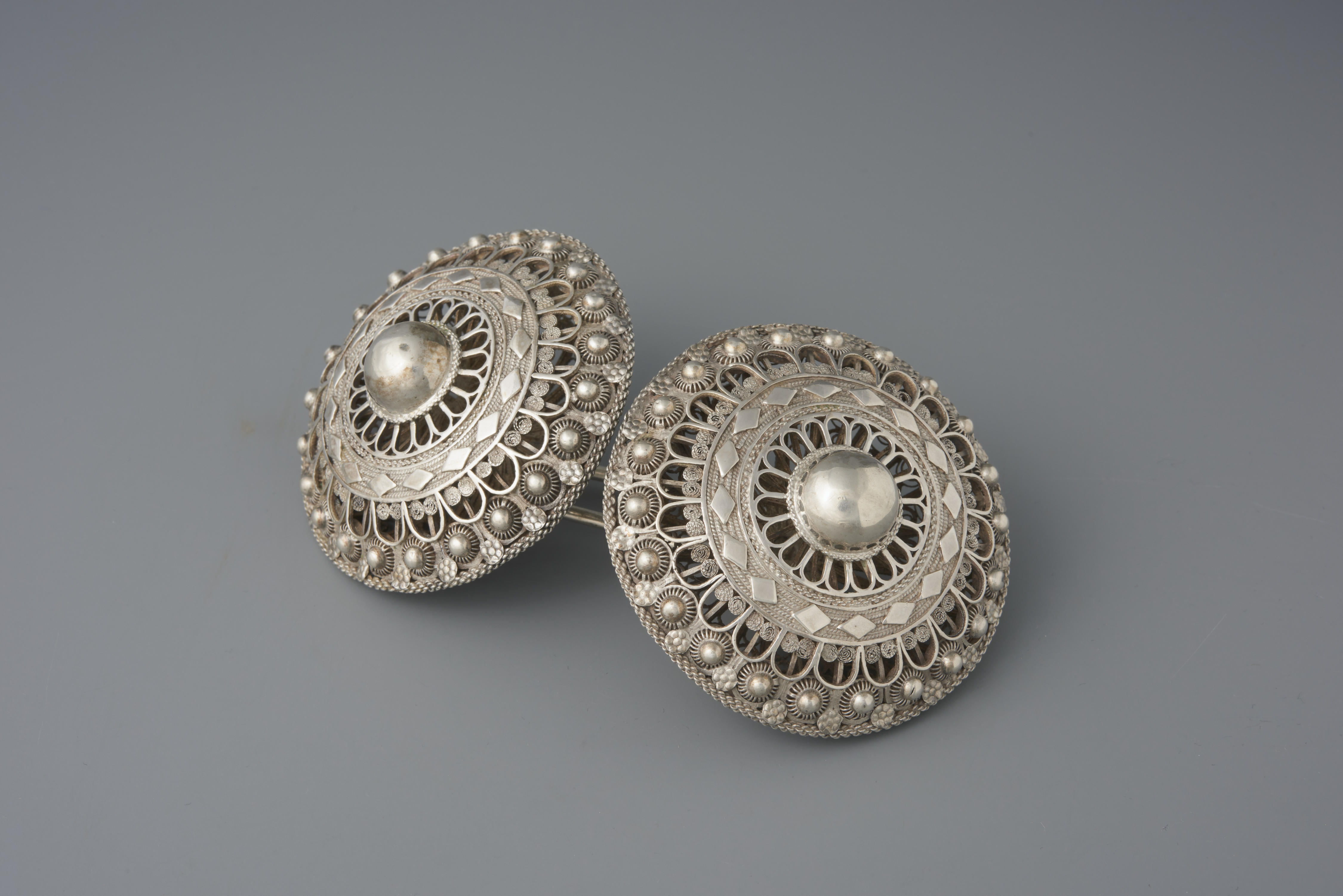 Broekstukken, de sluiting voor een mannenbroek. De twee zilveren knopen hebben een diameter van acht centimeter en zijn aan de achterkant met elkaar verbonden door een ovale ring. In de tailleband van de broek zat aan beide kanten van het split een groot knoopsgat. Daardoor gingen de knopen en zo werd de tailleband aan de ...