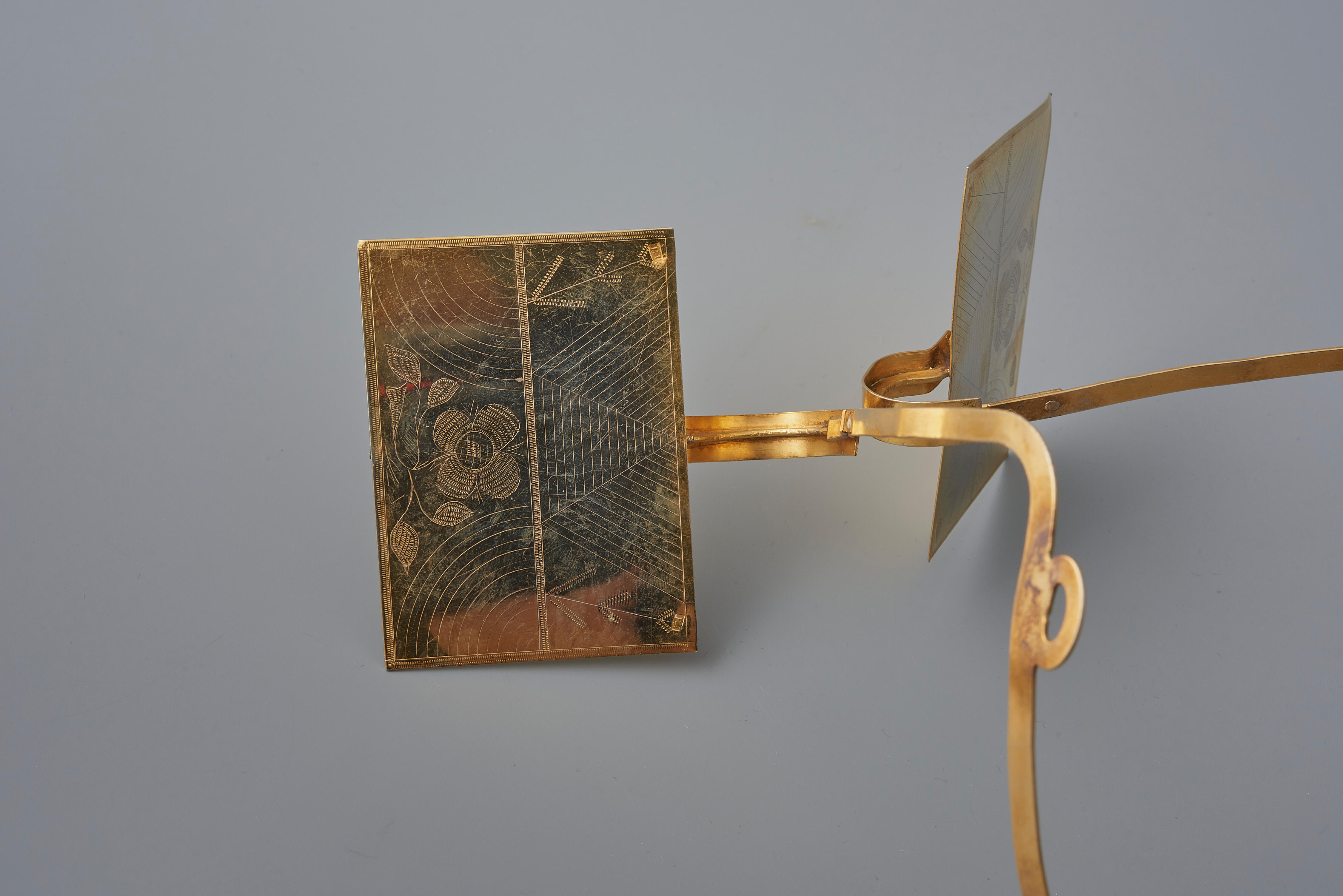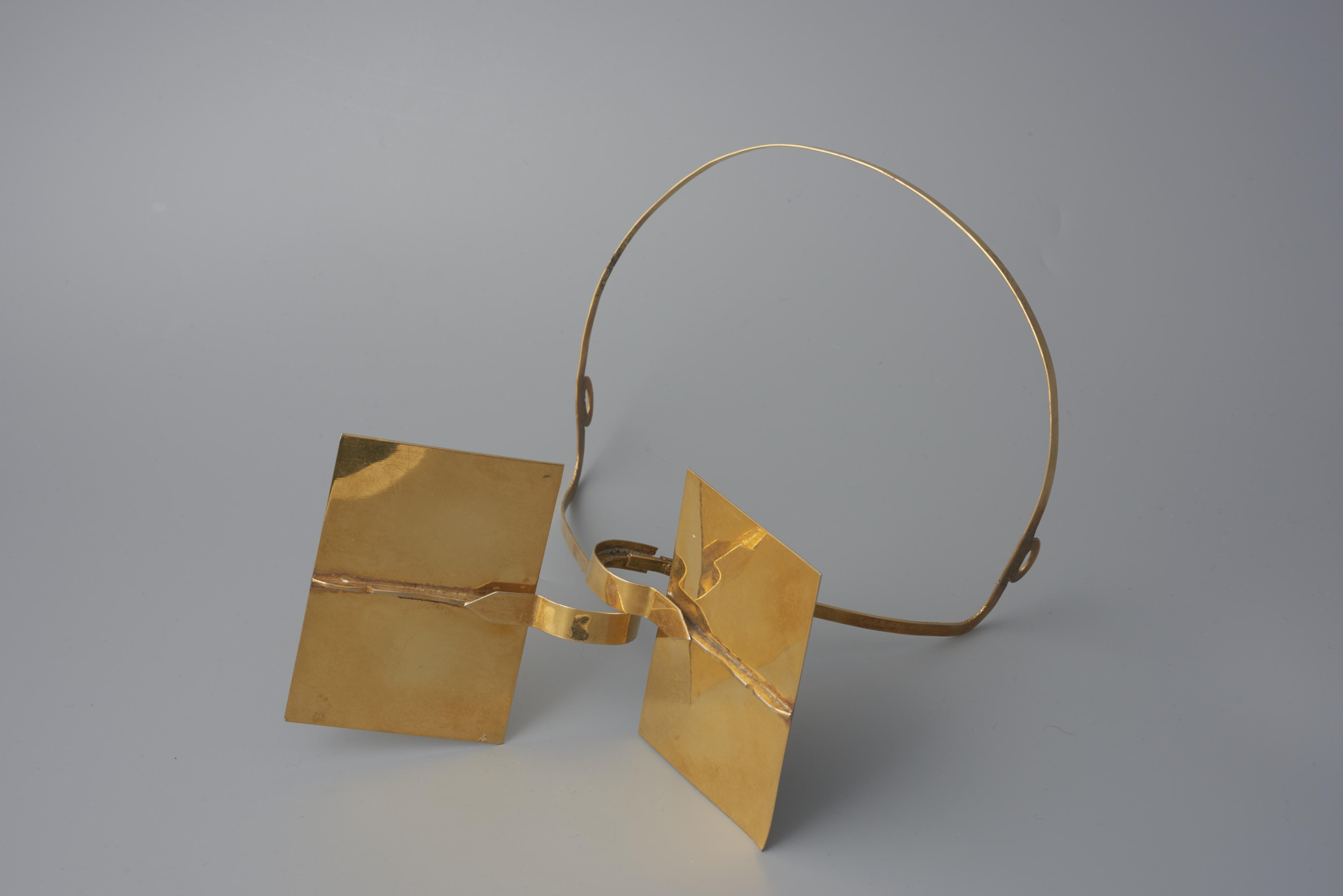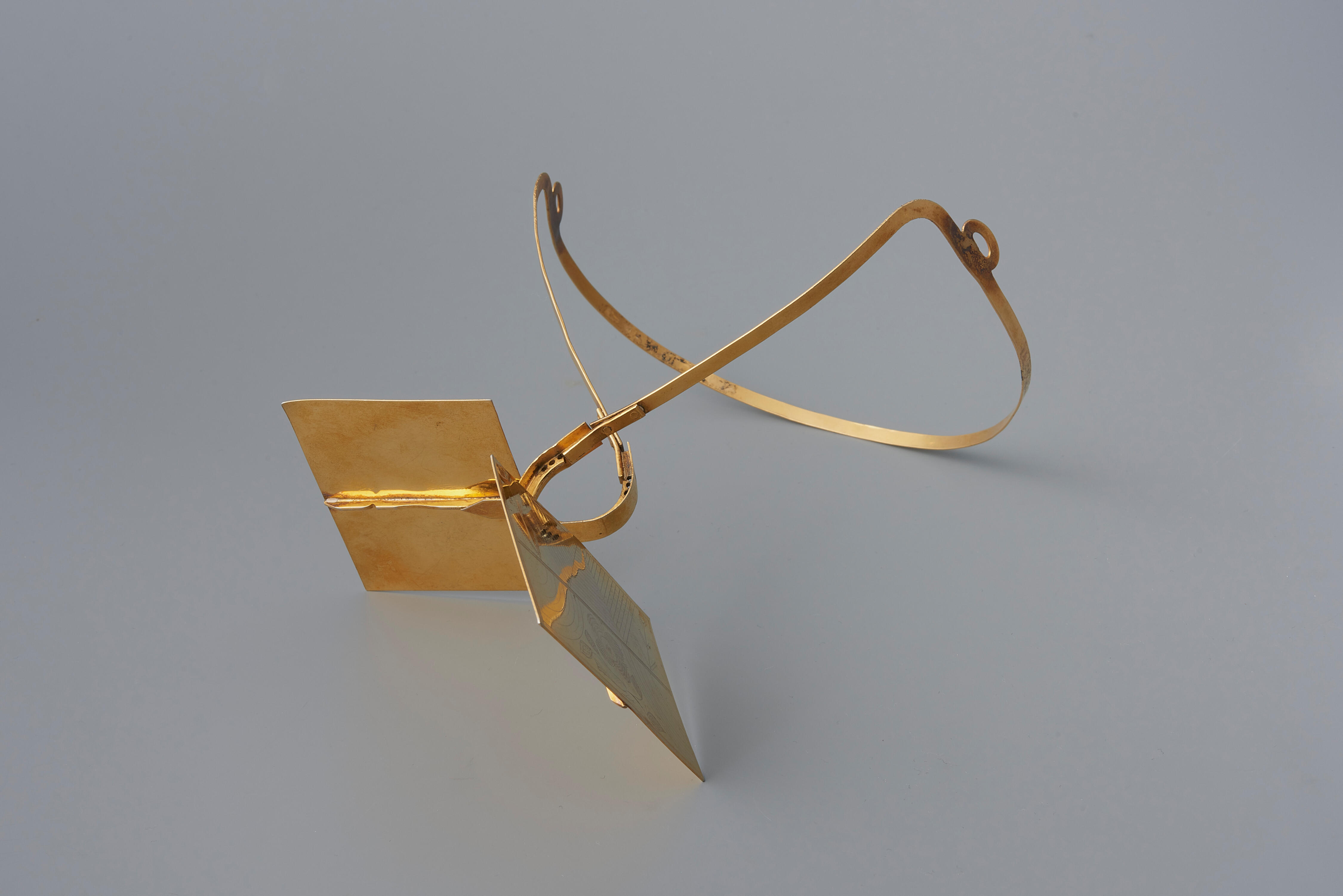 Oorijzer, gedragen door een vrouw in rooms-katholieke Zuid-Bevelandse streekdracht. Het oorijzer bestaat uit een messing beugel en twee messing ‘stikken’ (rechthoekige oorijzeruiteinden). De stikken zijn aan de achterzijde versierd met graveerwerk. In 1960 is het oorijzer in opdracht van het Nederlands Openluchtmuseum verguld. Op de stikken staat het merk JT. Het merk JT schijnt in ...