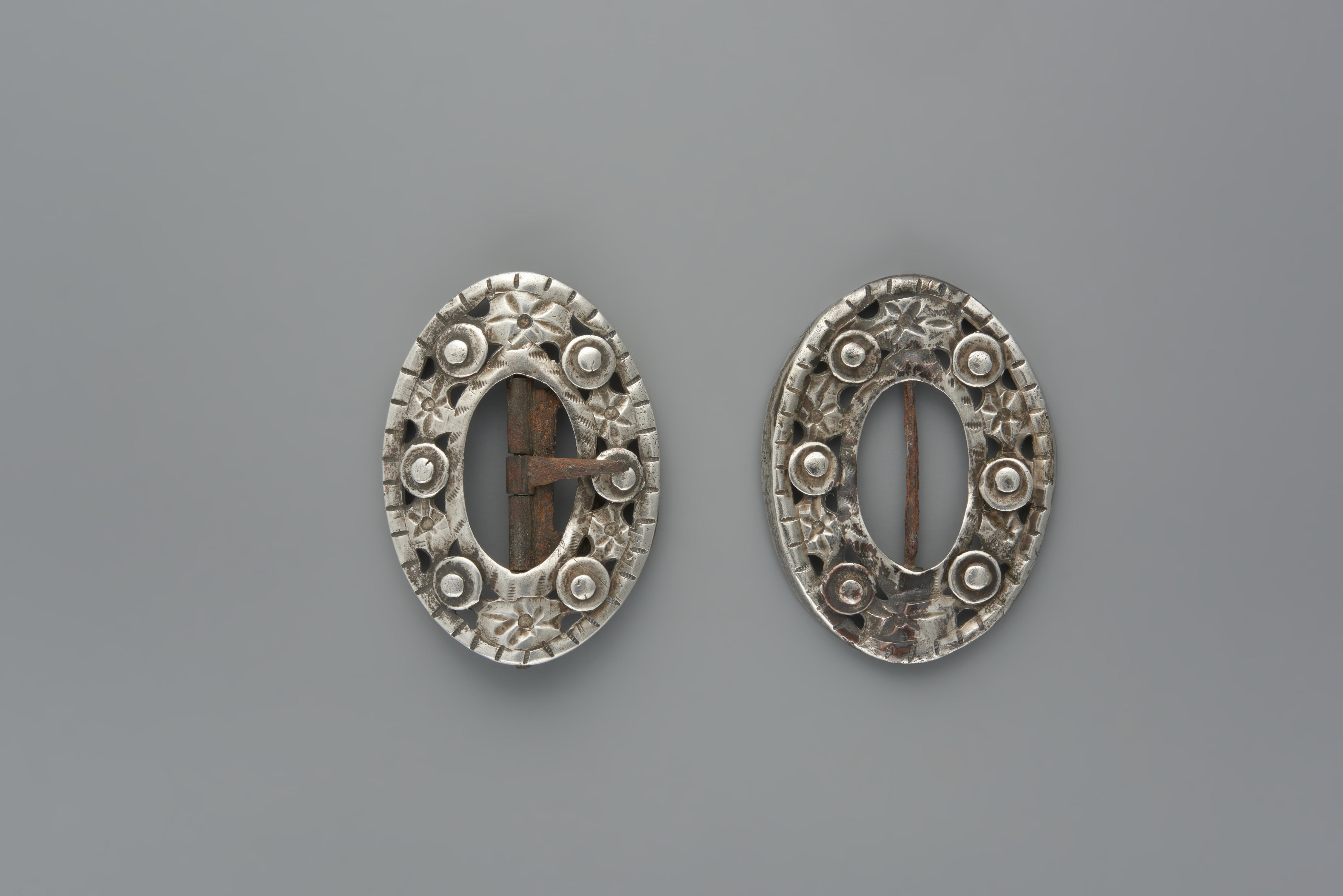 Paar ovale zilveren kuitgespen, volgens het waarborgteken gemaakt tussen 1814 en 1906. De gespen dragen geen meesterteken. Kuitgespen werden gebruikt om de broekspijpen van de kuitbroek aan de onderzijde te sluiten. Nadat de kuitbroeken uit de mode zijn geraakt werden zulke gespen in de twintigste eeuw wel hergebruikt als schoengespen voor een meisje of vrouw ...