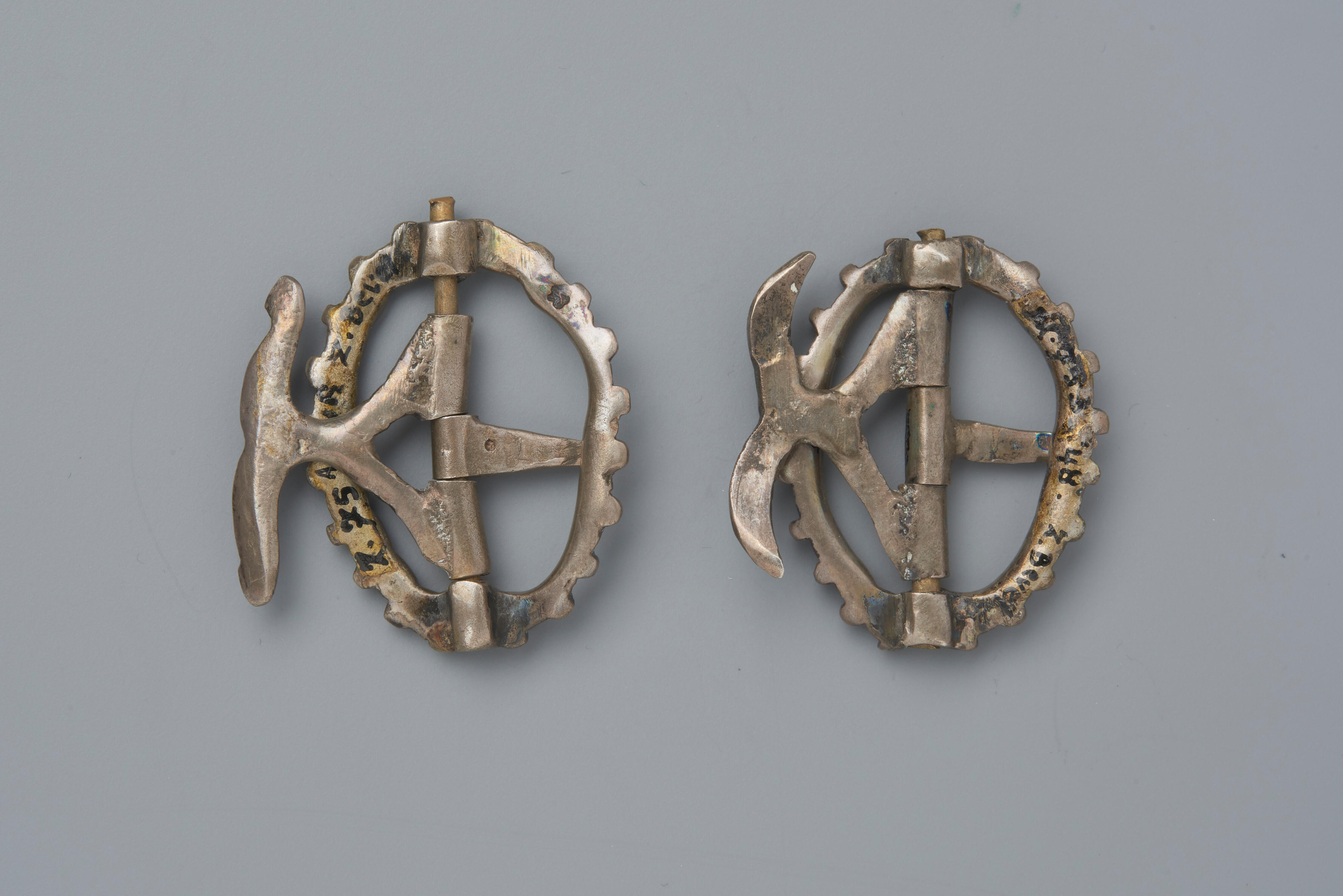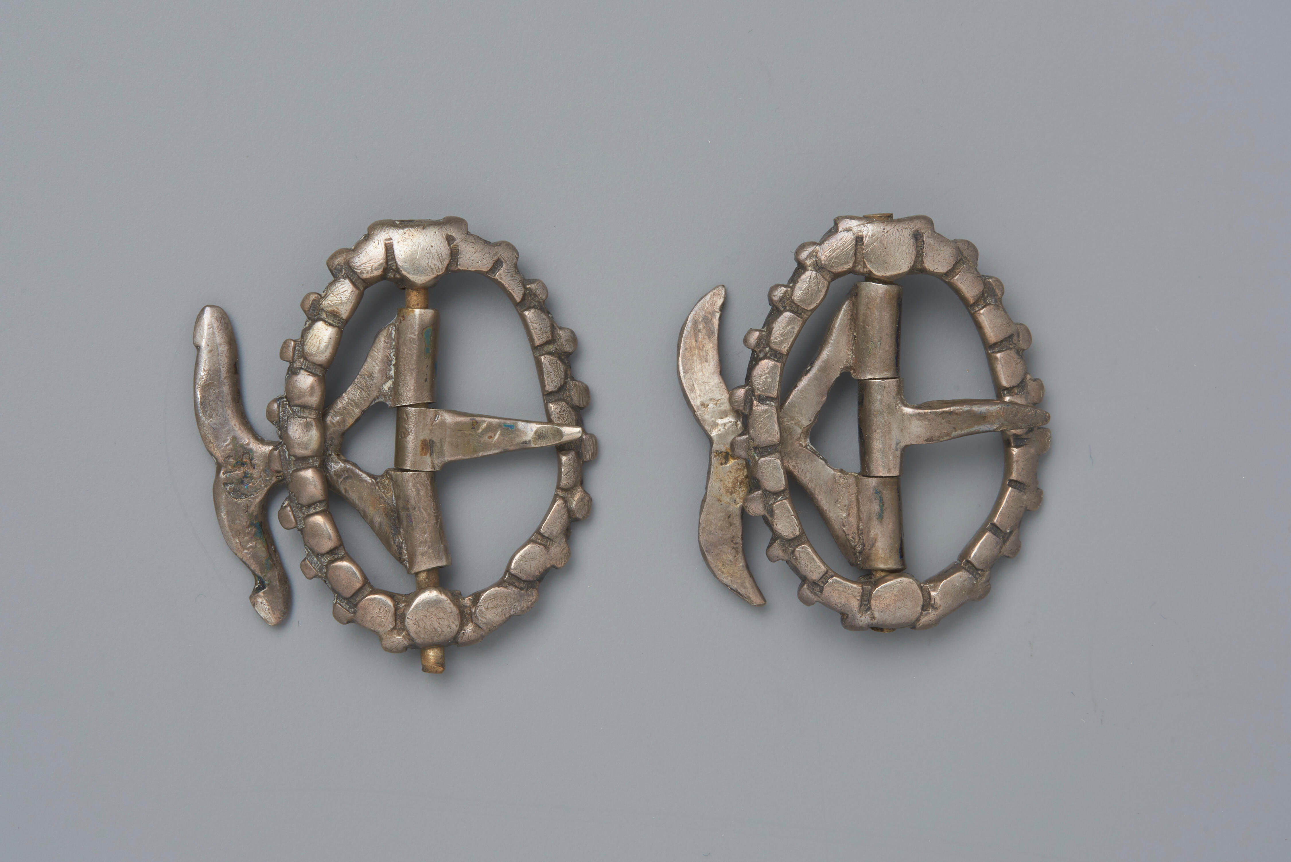 Een paar ovale zilveren kuitgespen, verworven op Zuid-Beveland. Kuitgespen werden gebruikt om de broekspijpen van de kuitbroek aan de onderzijde te sluiten. De gespen zijn vervaardigd in 1820. De vervaardiger is onbekend, want het meesterteken is onduidelijk.