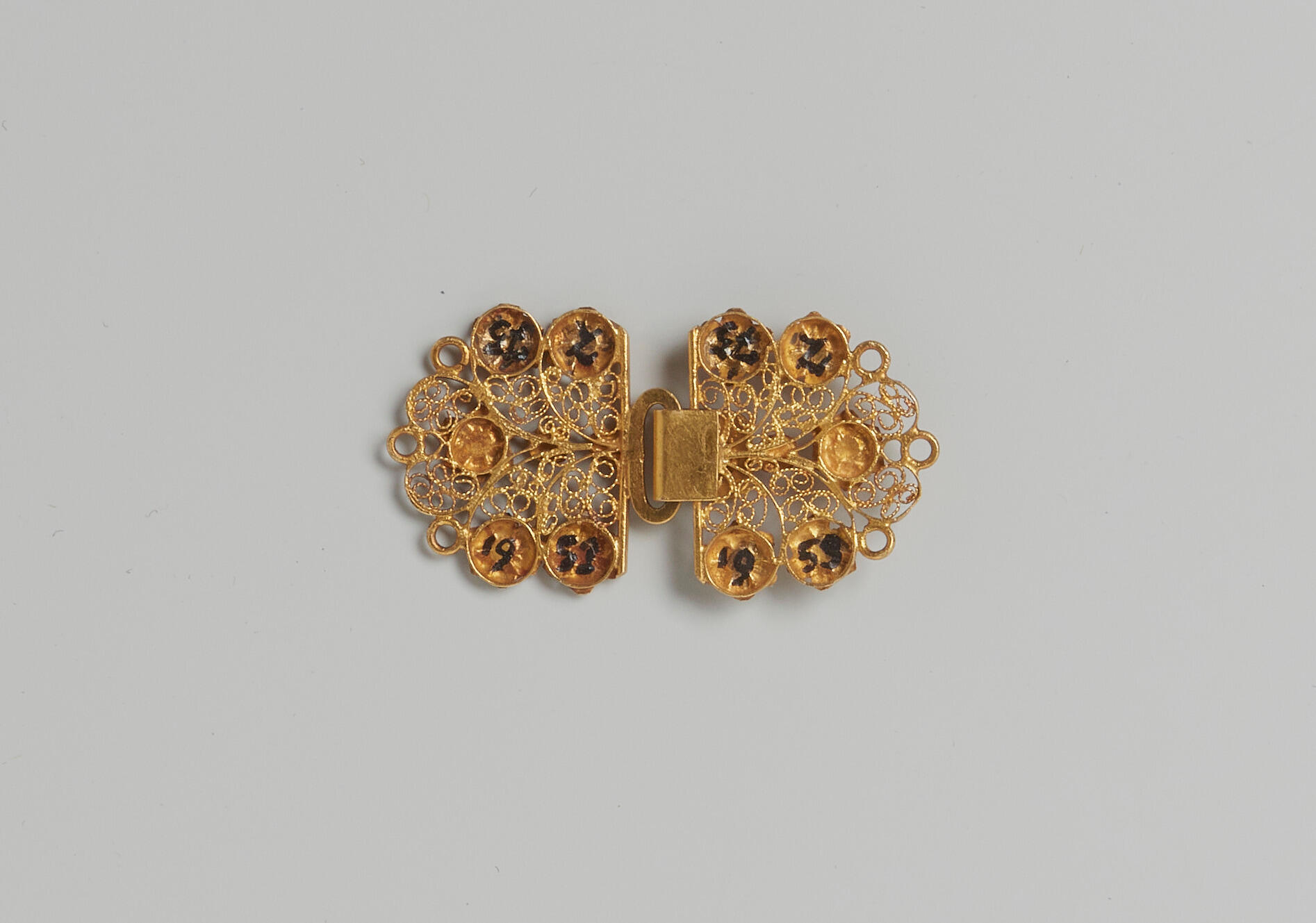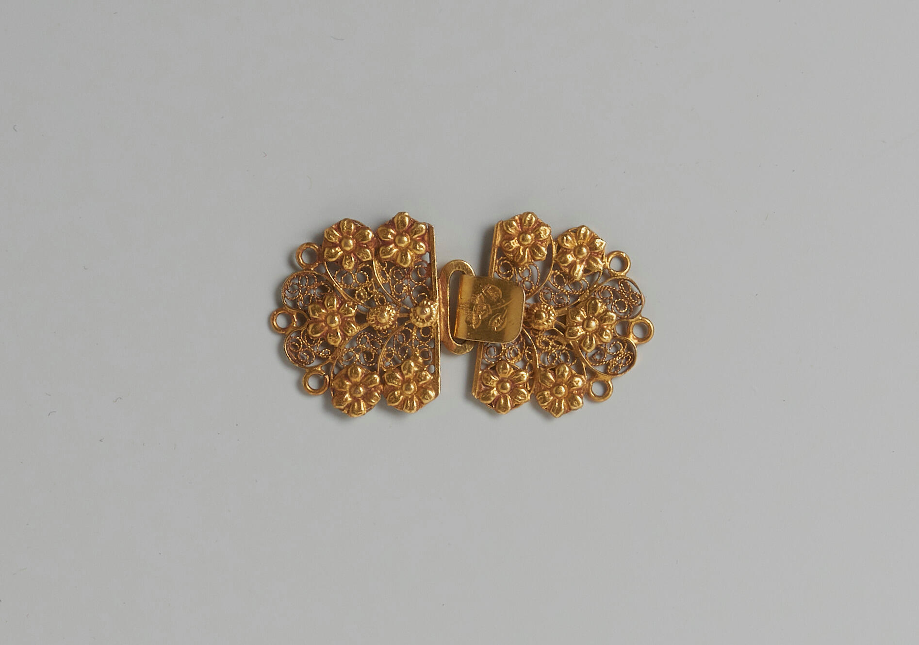 Een vergulde messing haak en oog. Ze zijn waarschijnlijk gedragen door een pop in Walcherse streekdracht tijdens de tentoonstelling 'Nationale Kleederdrachten van Harer Majesteits onderdanen' in 1898. Haak en oog dragen geen meesterteken. Dergelijke haakjes werden gebruikt voor het sluiten van de achterlinten van een kaphoed door een meisje of vrouw in streekdracht van het ...