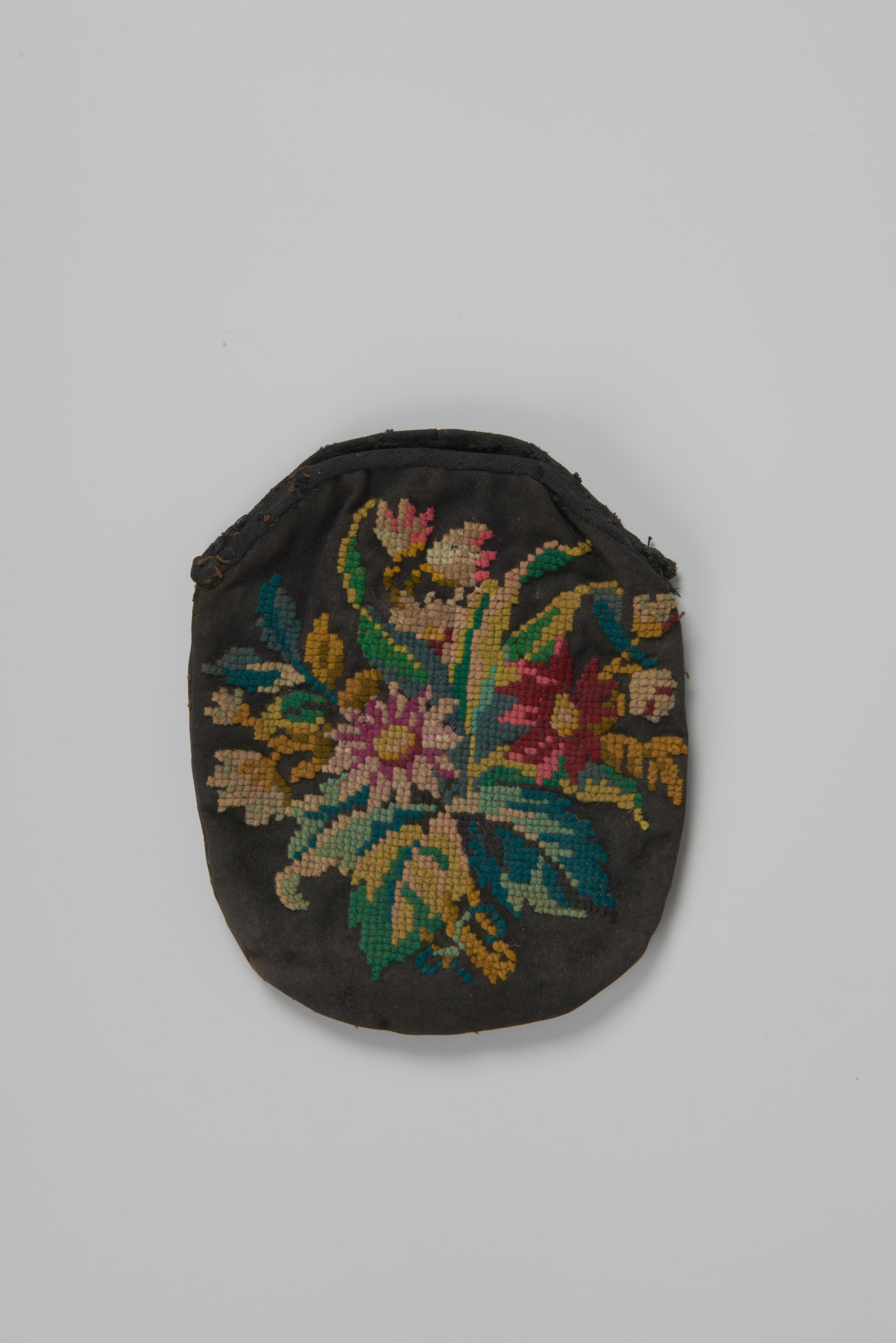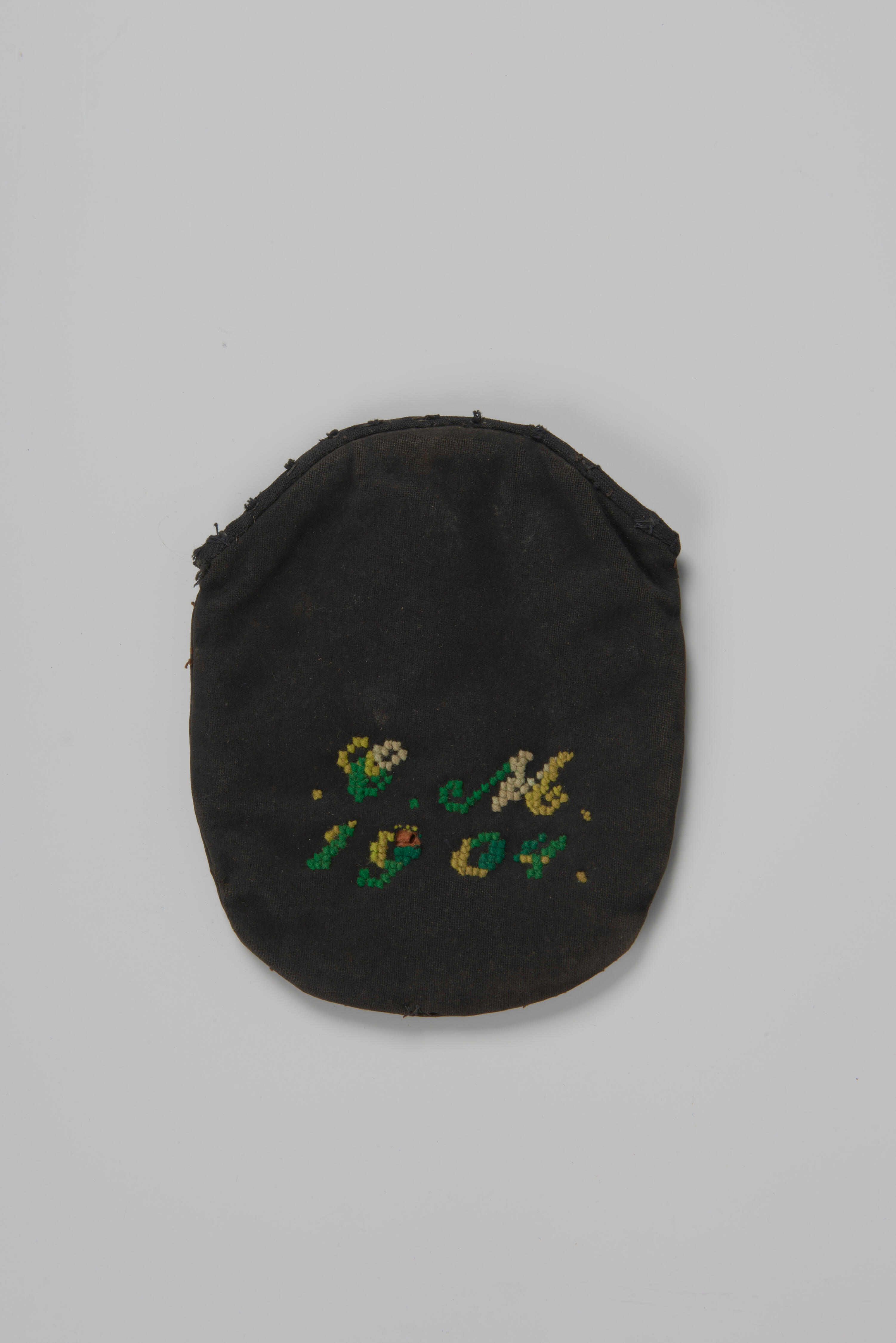 Een tas, afkomstig van een beugeltas, gebruikt door een meisje of vrouw in streekdracht van Walcheren. De tas is van zwarte wollen stof. Aan de voor- en achterkant is de tas versierd met kruissteekborduurwerk in wol. Op de voorzijde staan bloemmotieven en op de achterzijde de initialen C.M en het jaartal 1904. De tas is ...