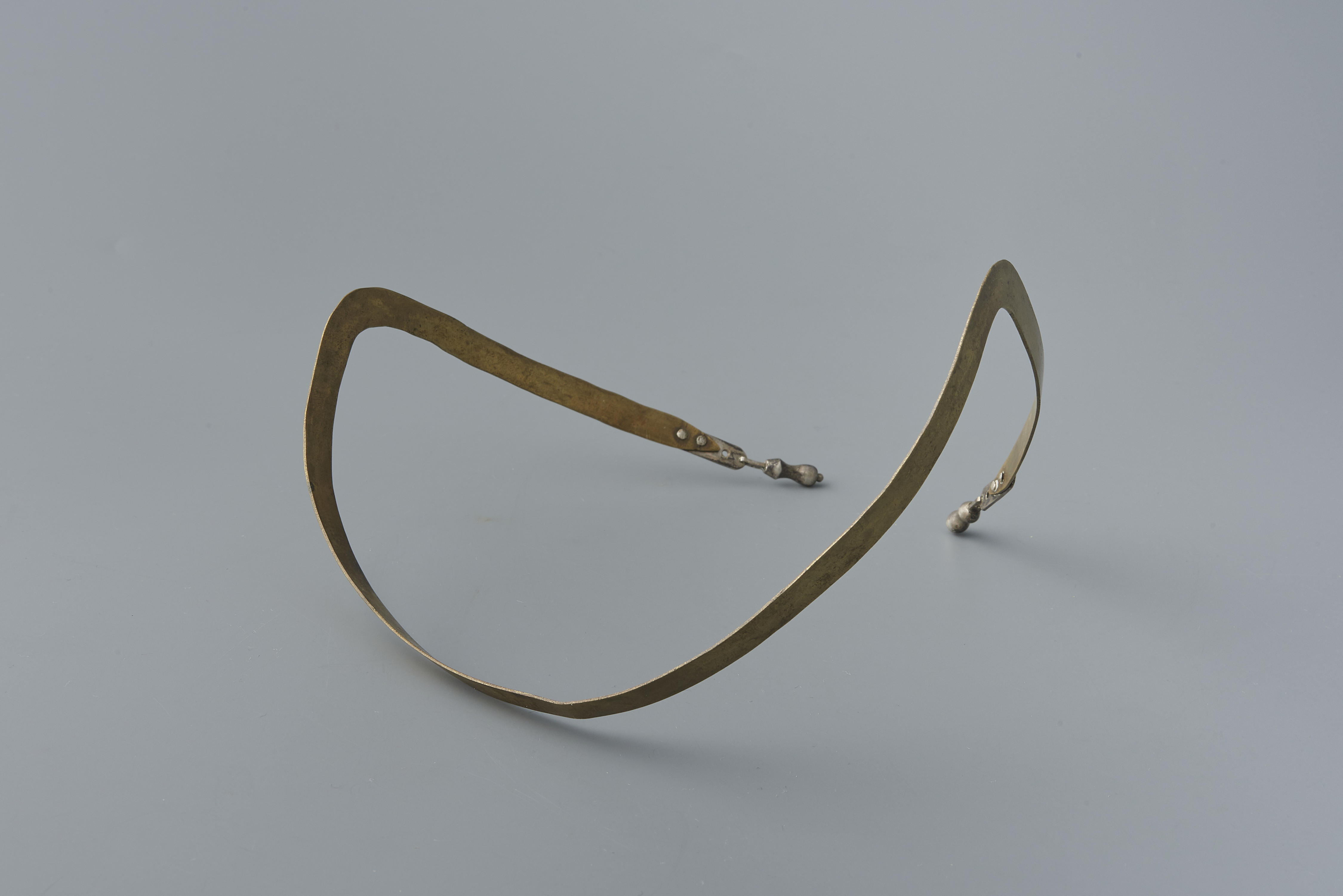 Reconstructie van een oorijzer naar het modebeeld van 1640. Om het publiek objecten te tonen die niet in de museumcollectie aanwezig waren, zijn voornamelijk in de jaren vijftig en zestig van de twintigste eeuw replica's gemaakt of bestaande collectiestukken aangepast om het gewenste beeld te bereiken. In dit geval zijn in 1960 nieuwe zilveren knoppen ...