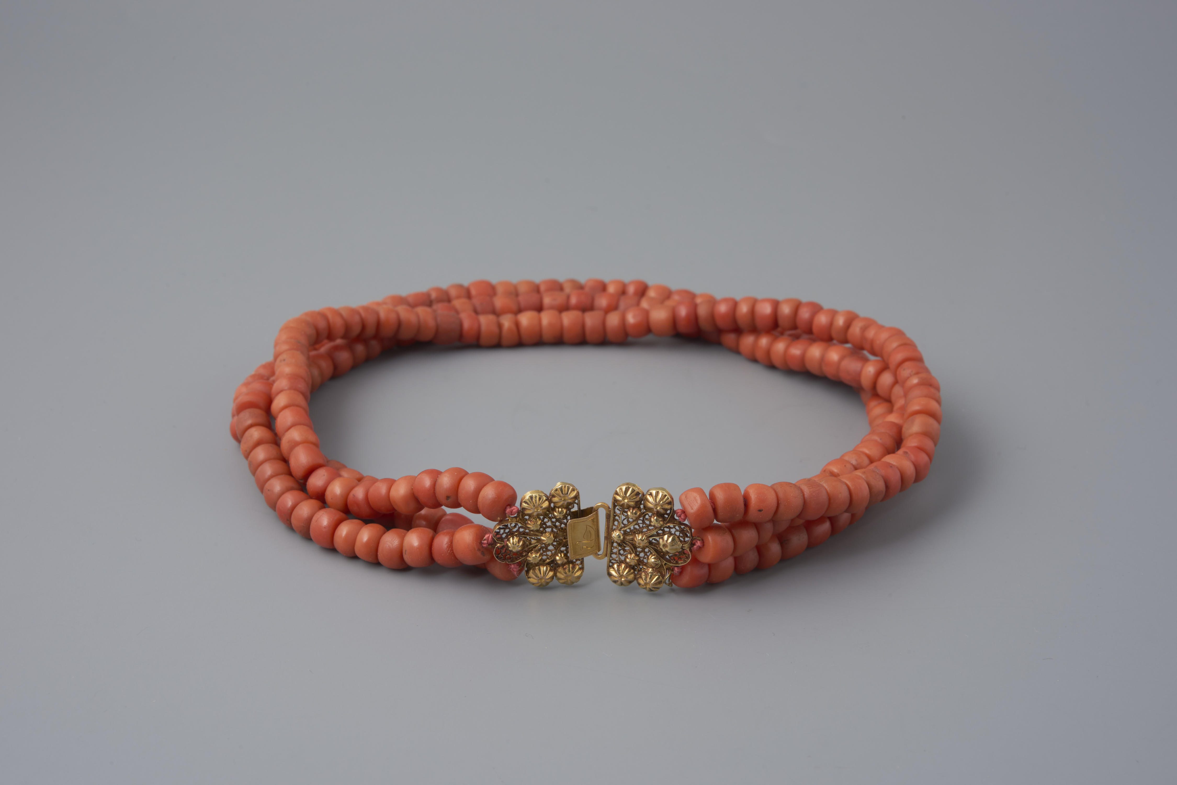 Halssnoer, bestaande uit een 14-karaats gouden 'kraalhaak' met drie strengen kralen van bloedkoraal. Het halssnoer is gedragen door een vrouw van Zuid-Beveland. De kraalhaak is waarschijnlijk omstreeks 1875-1880 vervaardigd door Evert Schotman uit Dordrecht. Het slot heeft een gehaltemerk dat gebruikt is tussen 1853 en 1906.