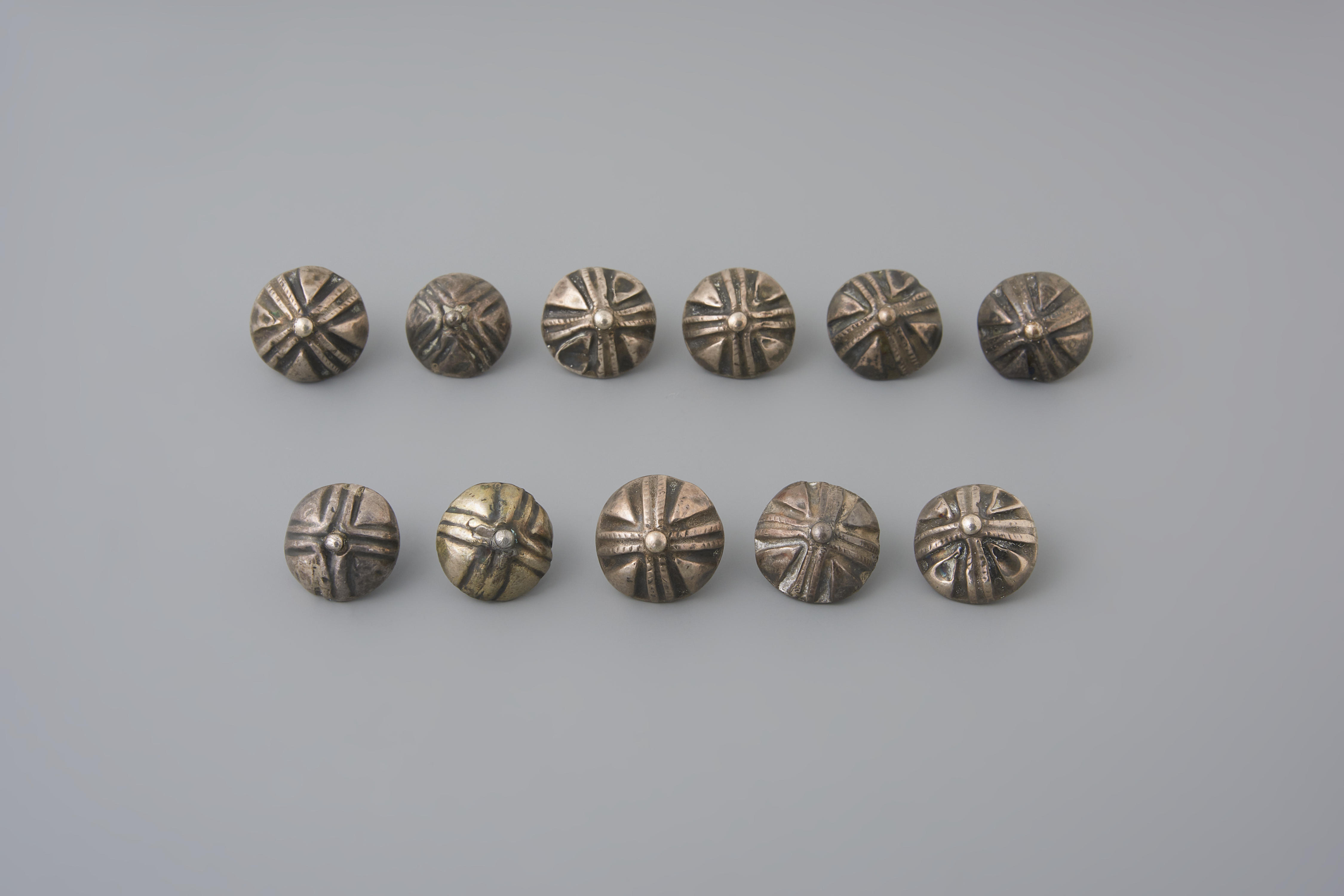 Zilveren knopen zoals deze van een achttiende-eeuws model zijn in verschillende delen van het land gedragen. Ze zijn ook verwerkt tot keelknopen. Twee van de knopen op de foto zijn latere kopieën.