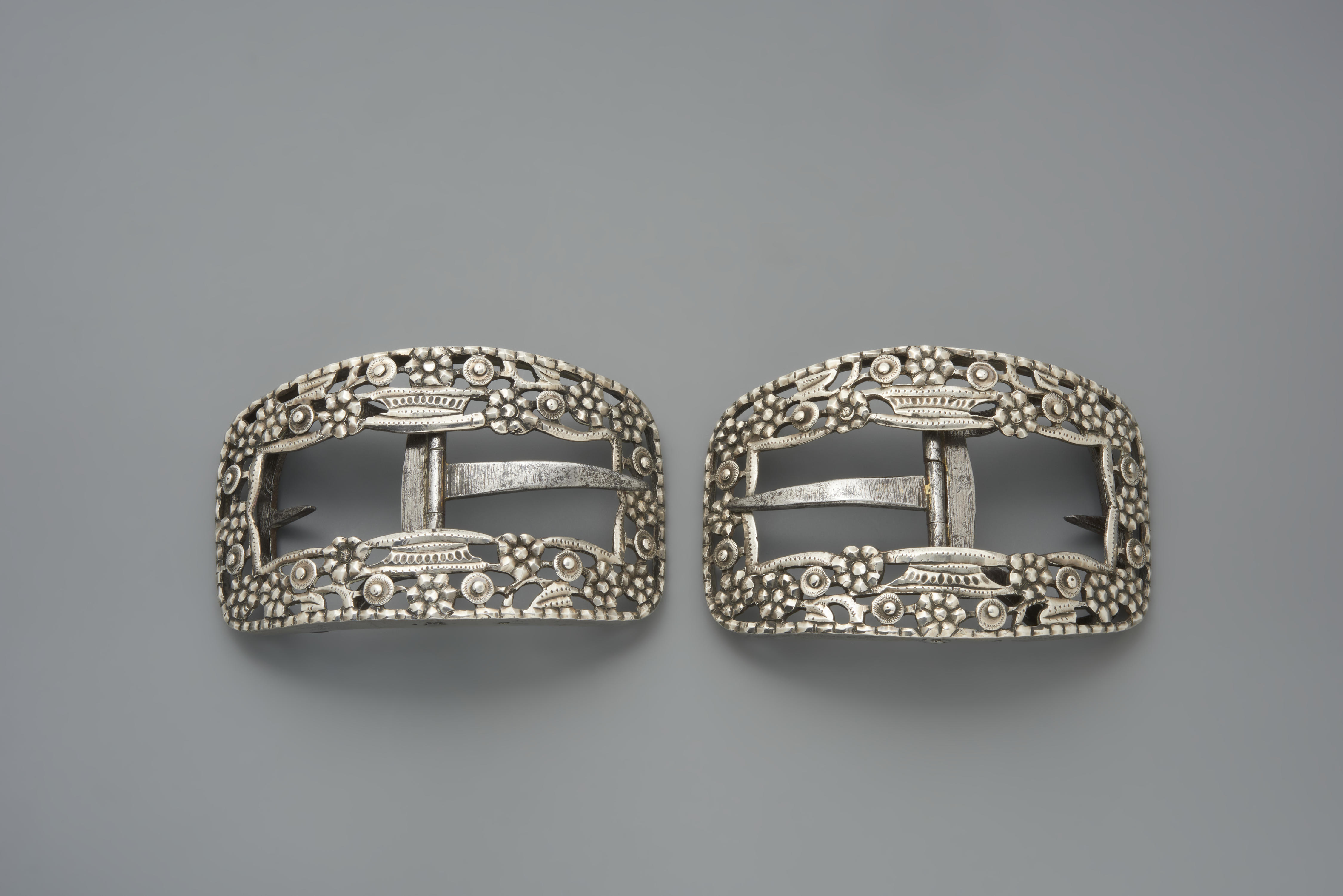 Paar zilveren schoengespen, gedragen door een vrouw van de Veluwe. De gespen hebben een jaarletter van 1894.