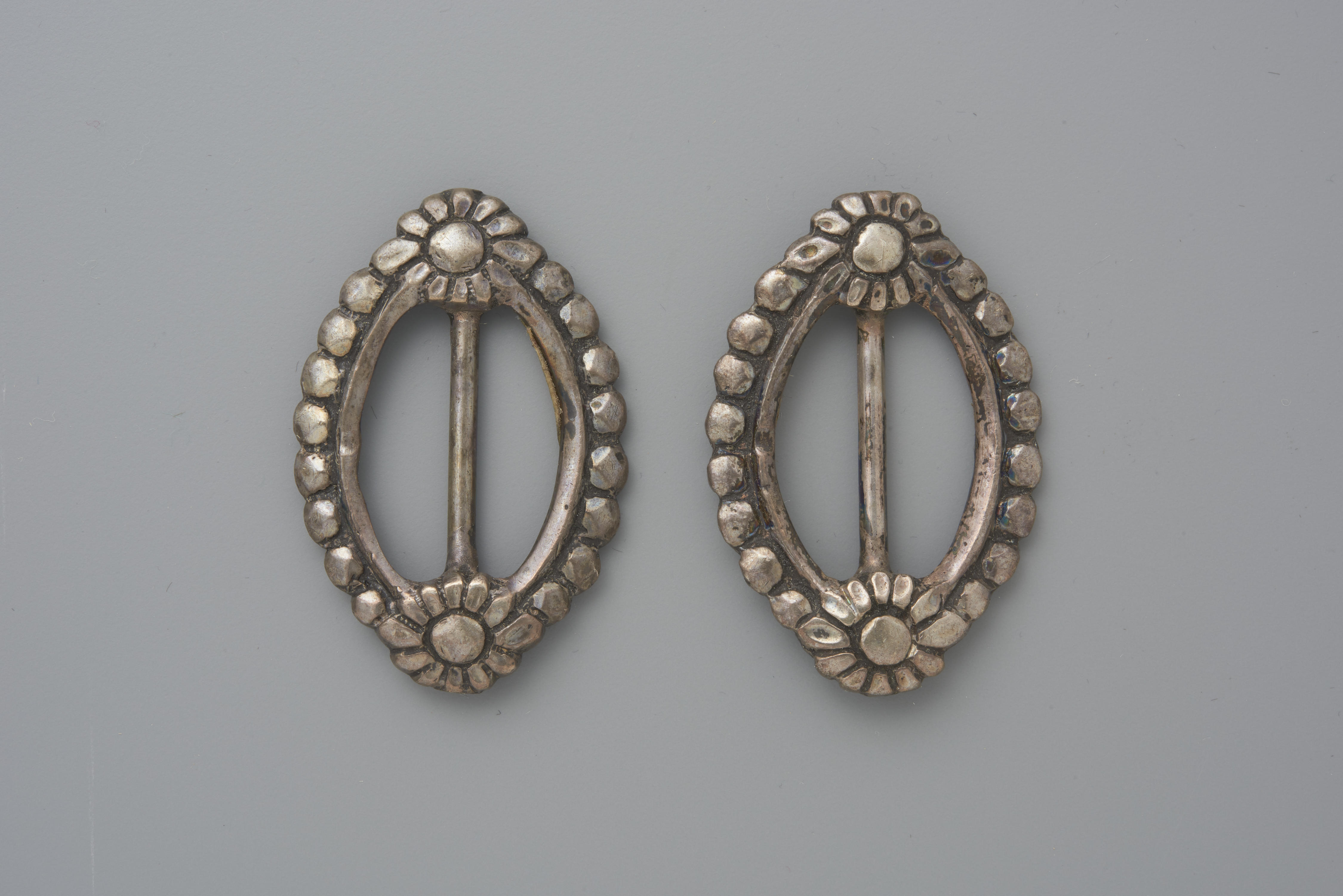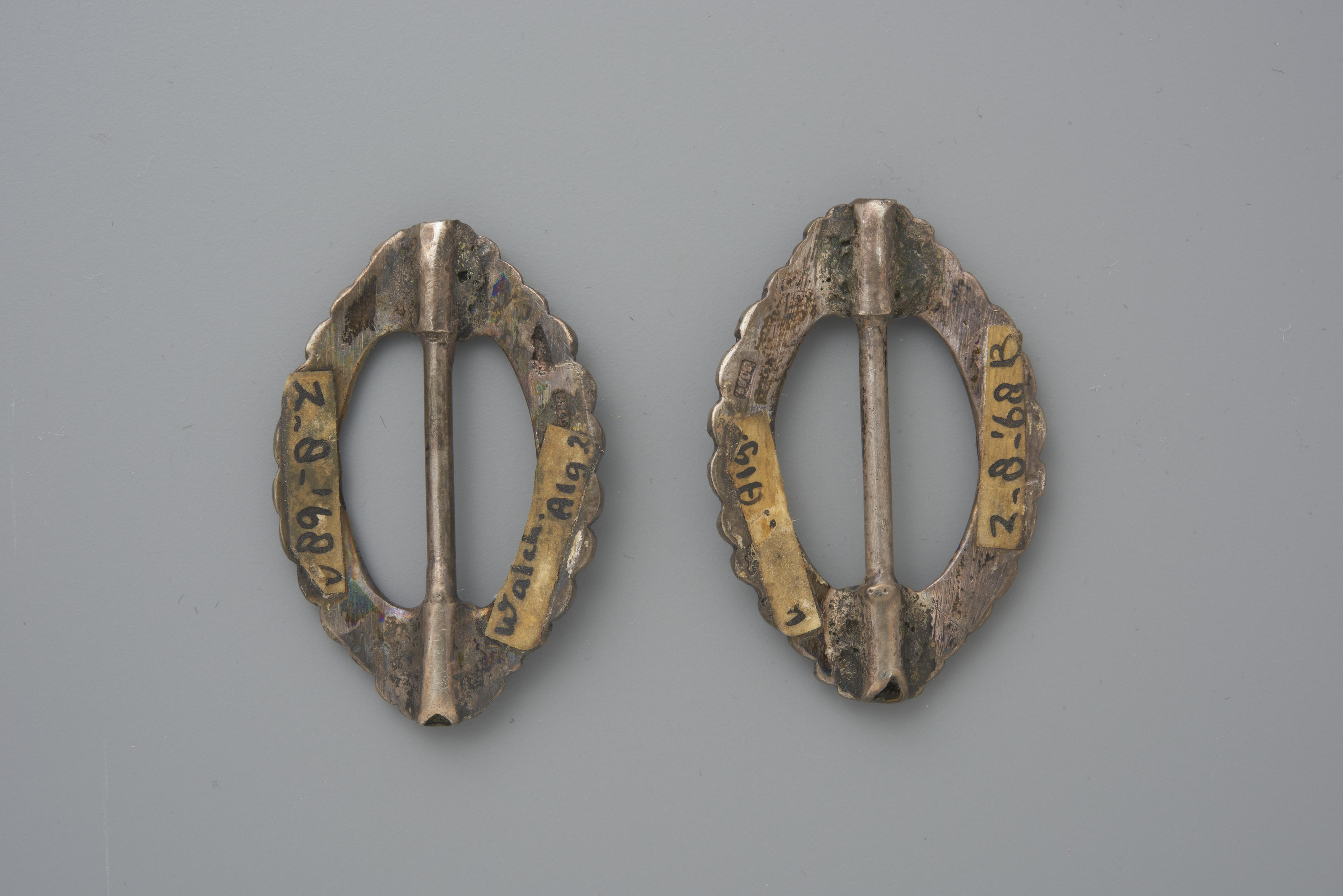 Paar zilveren kuitgespen. De kuitgespen zijn gemaakt door Jan Jonker uit Meppel, werkzaam tussen 1853-1890. Bij binnenkomst in het museum zijn de gespen toegeschreven aan Walcheren. Dit model is daar echter niet algemeen gedragen. Kuitgespen werden gebruikt om de broekspijpen van de kuitbroek aan de onderzijde te sluiten.