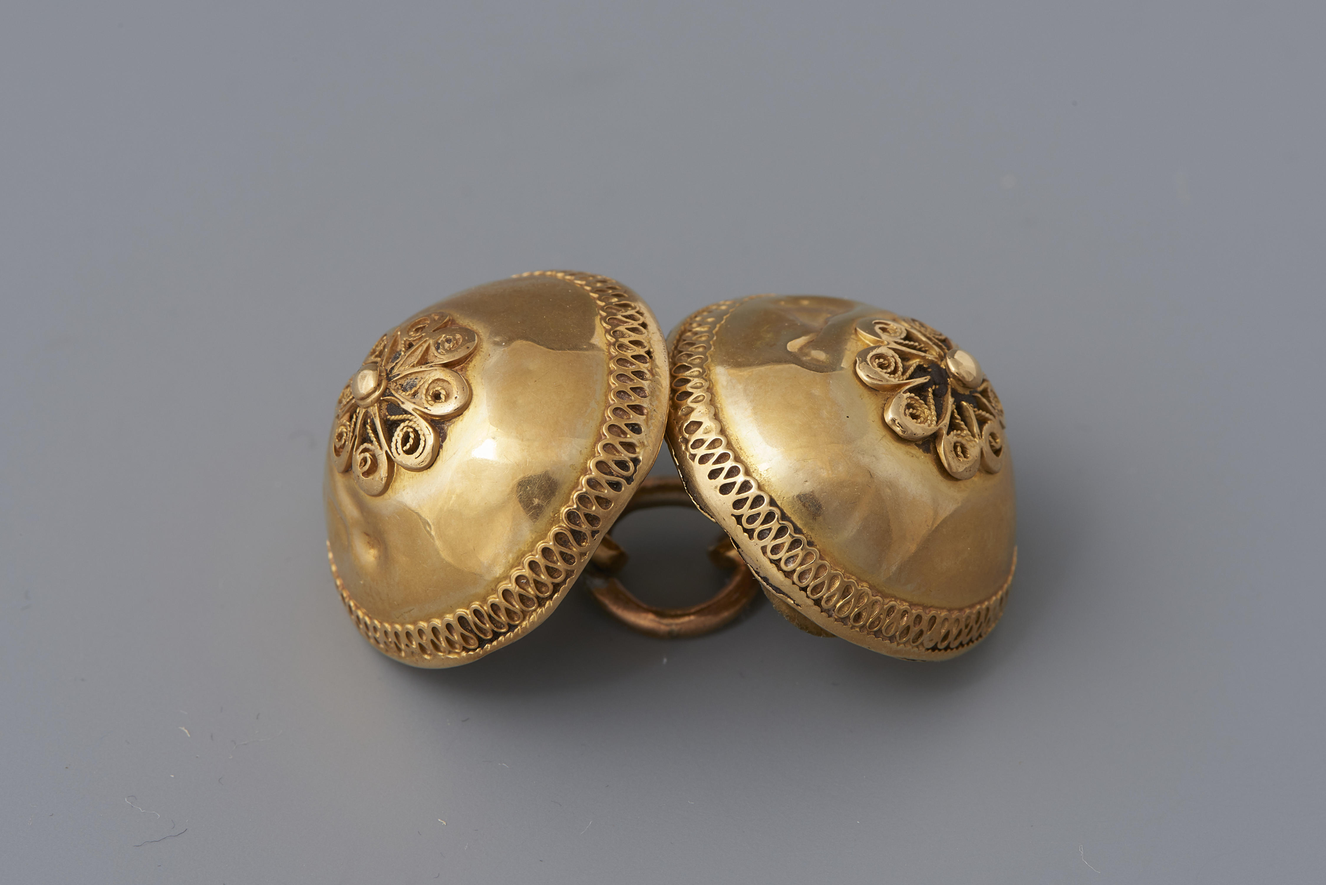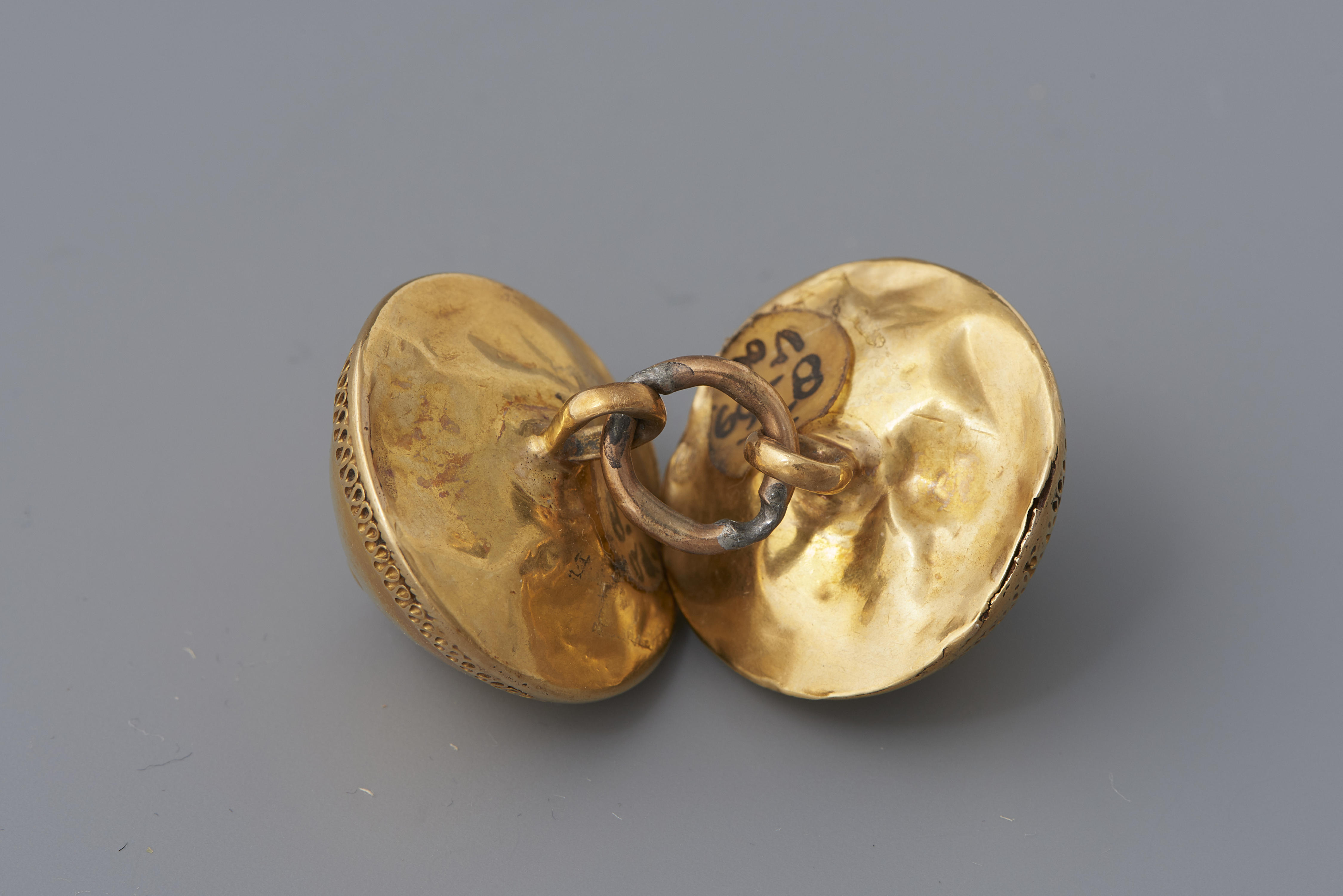 Paar keelknopen van ongewaarborgd goud, gedragen in Volendam. De knopen zijn waarschijnlijk gemaakt rond 1870-1875. De vervaardiger is onbekend. Keelknopen worden gebruikt om de halsboord van het hemd te sluiten.