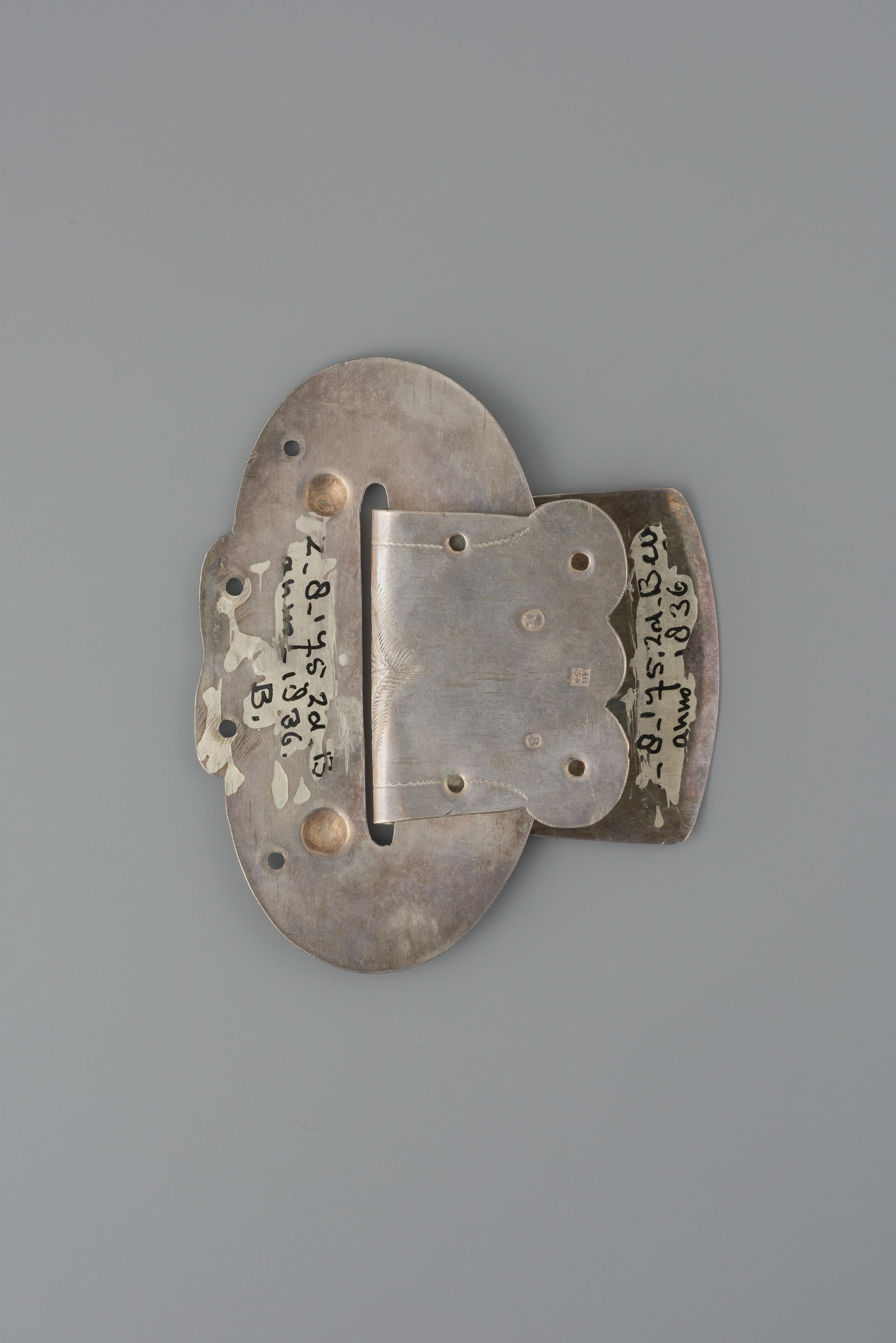 Schortenslot, gedragen achteraan de schort door een meisje of vrouw van Zuid-Beveland. Het slot is in 1836 vervaardigd door A. Boddingius uit Goes.